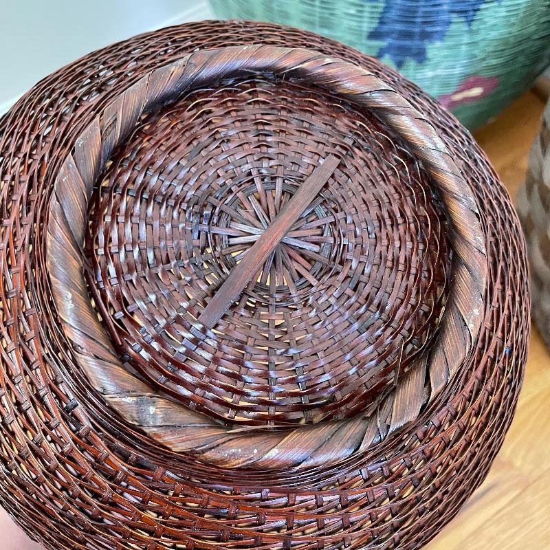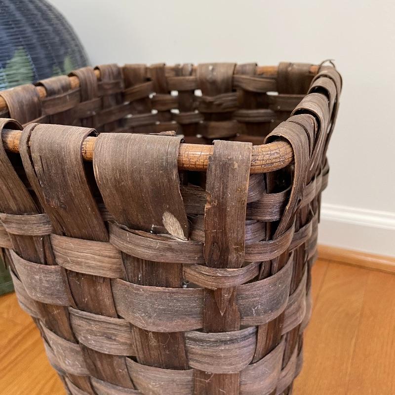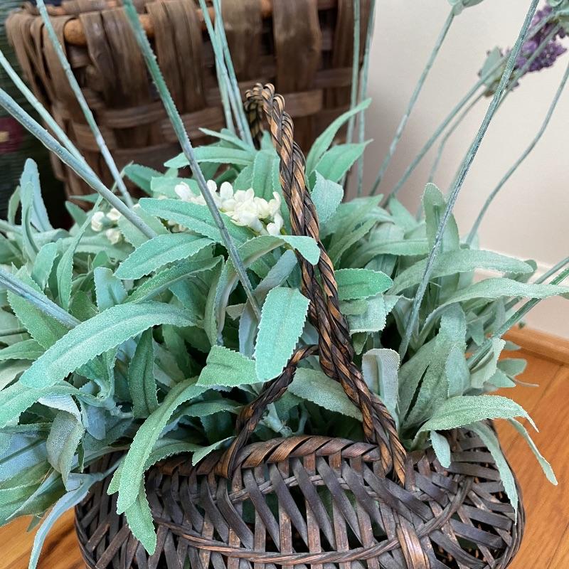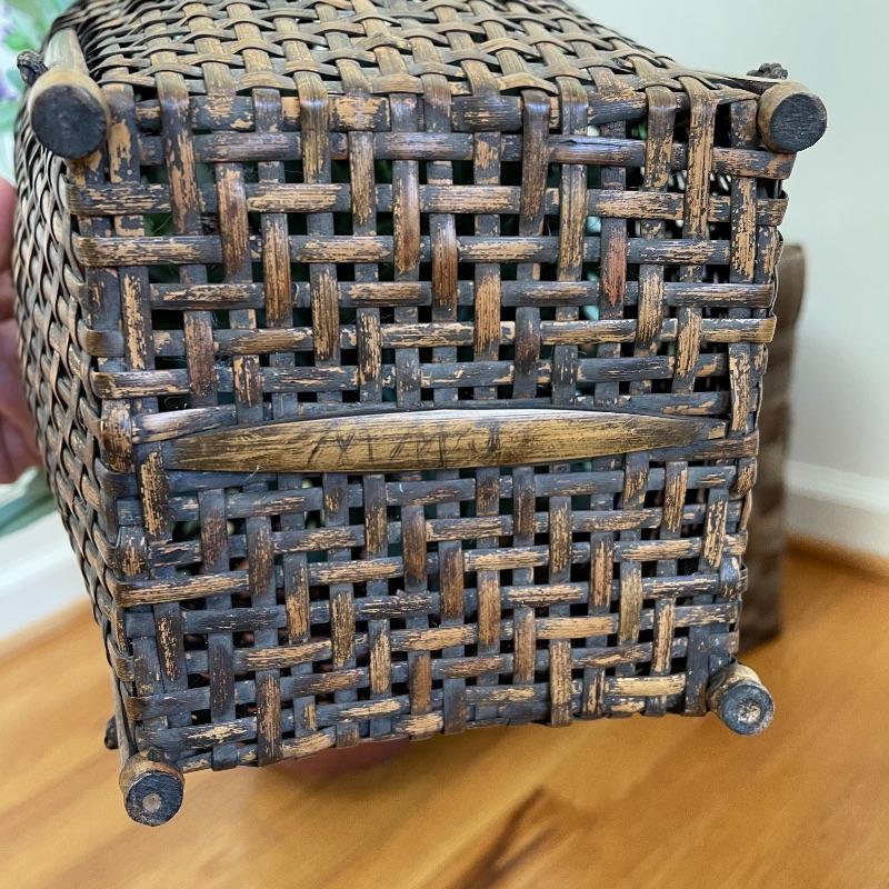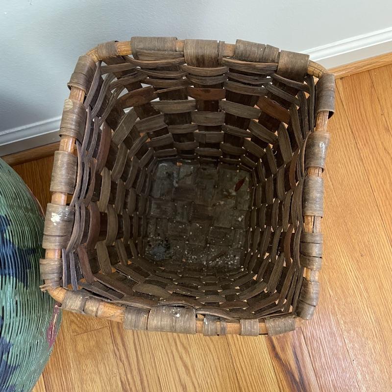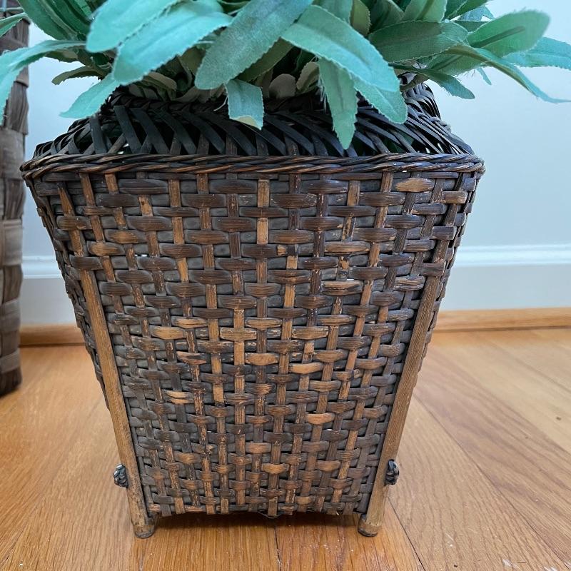 Stunning large floral painted woven basket with three smaller woven delights. The large urn shaped basket is painted 360° and comes with the decor you see in the photos. It appears to have a felt like material on its bottom, that will need to be replaced as the sticks fall through when basket is moved. Lot also features a lovely faux floral filled basket with handle and initials on the bottom. The other two baskets appear to be nice quality, although the rectangular basket was stored in the garage and needs some cleaning. Largest basket is approximately 16”d x 19”. See photos. Local pick up only.