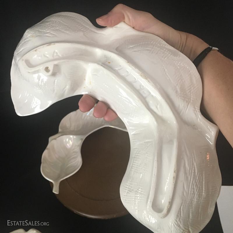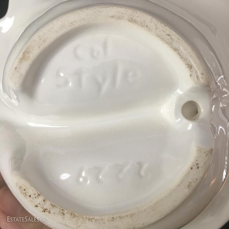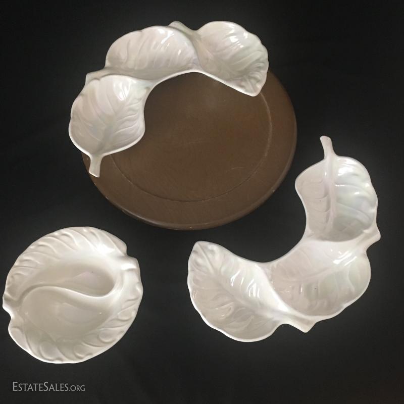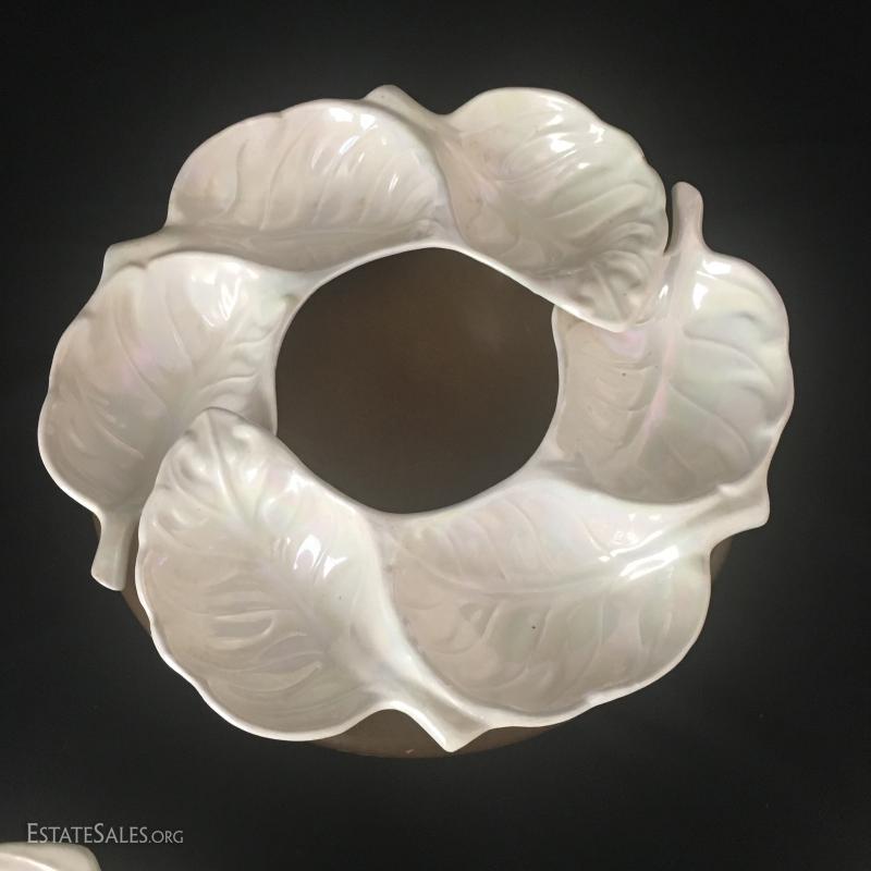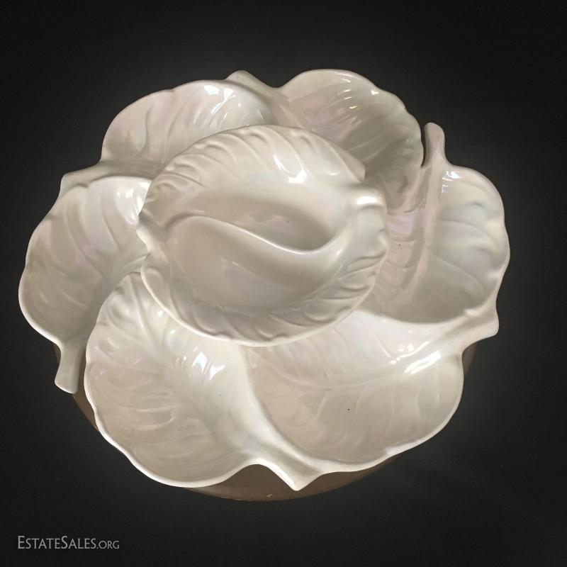Great for Crudités this wood-based lazy Susan has 3-piece nesting China on top. Finish is a white pearl-esque and bottom, says "Col style 2229 USA" and measures 15" diameter and 4.5" tall.. This lot is available for shipping or local pick up in Asheville, NC.