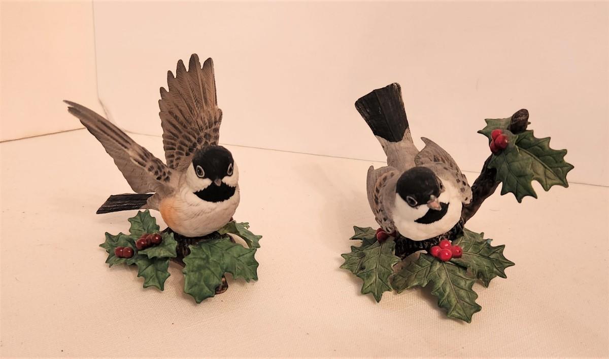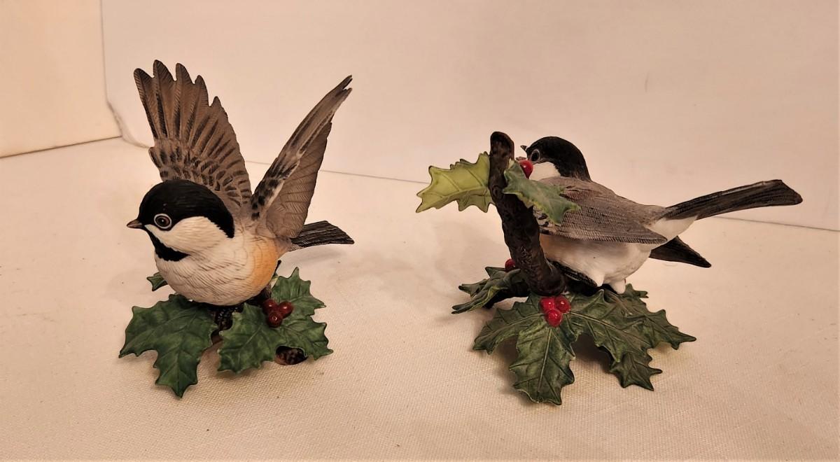 Lot of 2 Christmas holly bird figurines from LENOX - Chickadee and Female Black Capped Chickadee - both from 1994, each 3.5" tall. Both good condition - no boxes.