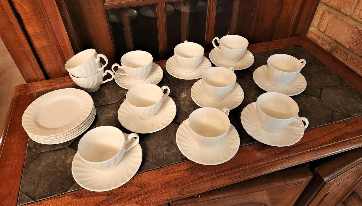Classic Coffee/Dessert set - 10 cup/saucer sets with 2 extra cups - 6 pie/dessert plates - all by Johnson Brothers (England). Good condition.