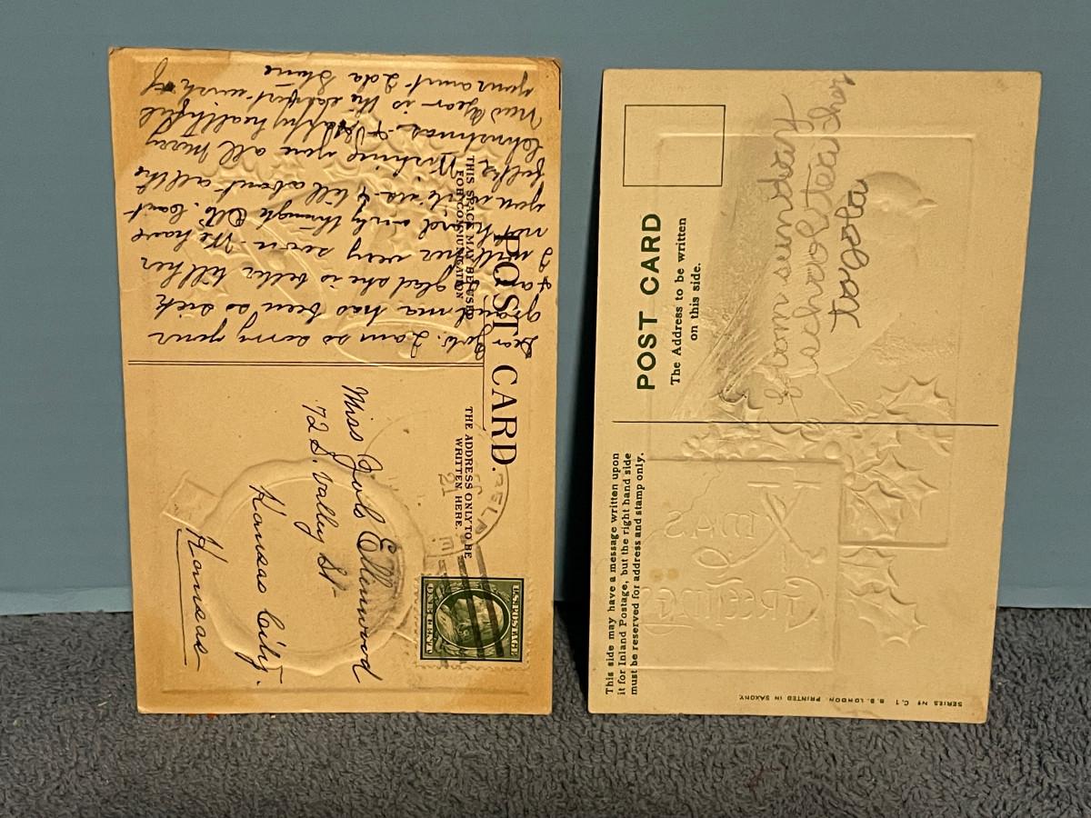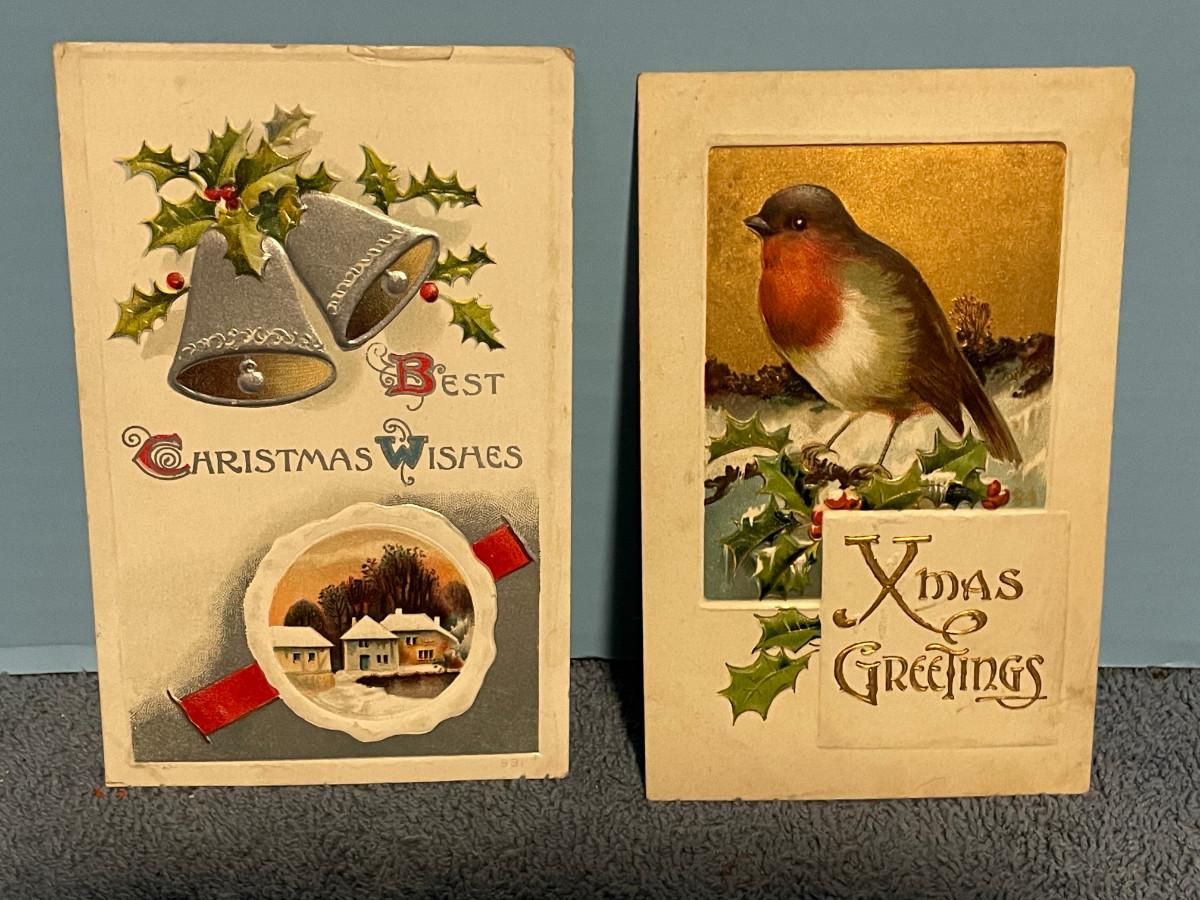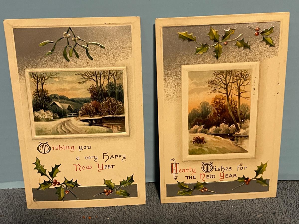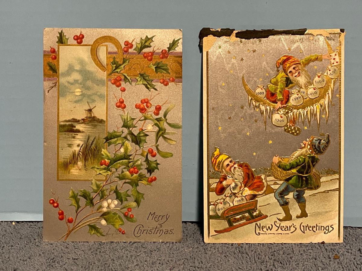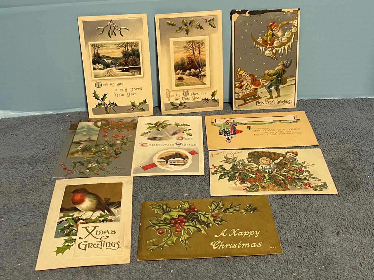 THESE ARE LOVELY VINTAGE CHRISTMAS & NEW YEARS POSTCARDS!!! MANY 1909.. SOME ARE WRITTEN ON.. SOME BENDS/RUBS/WEAR..