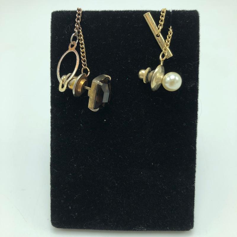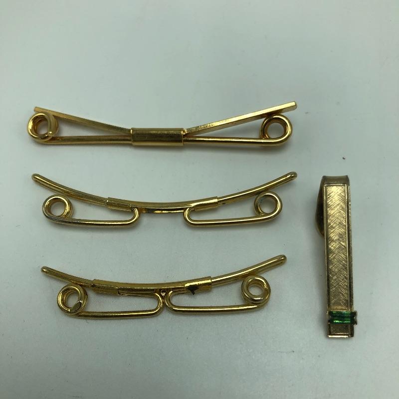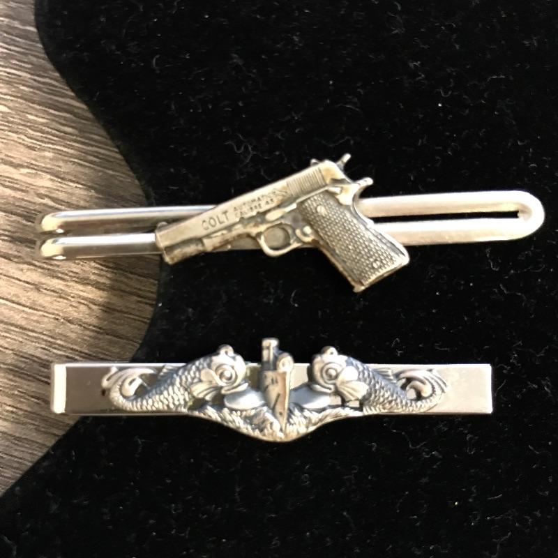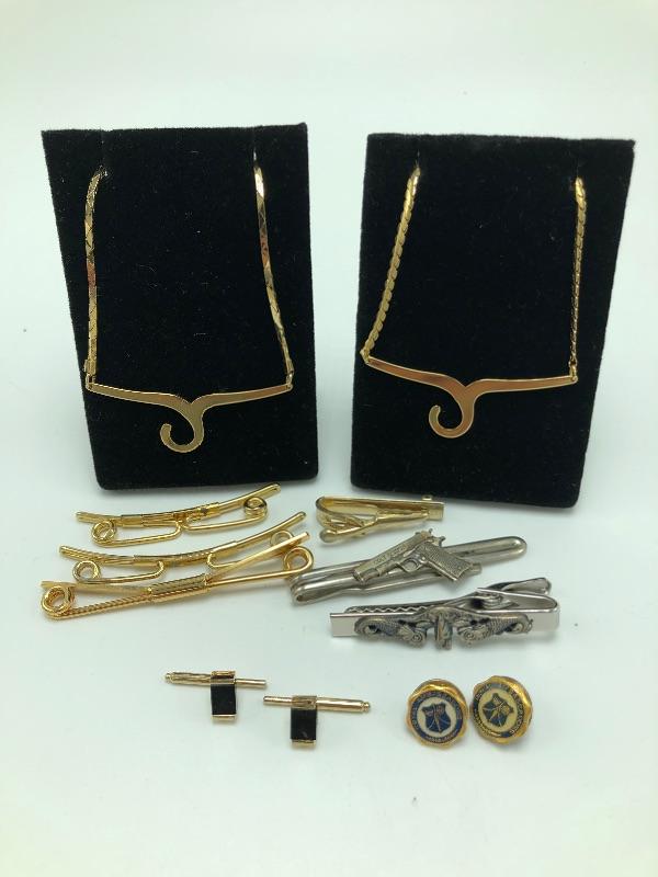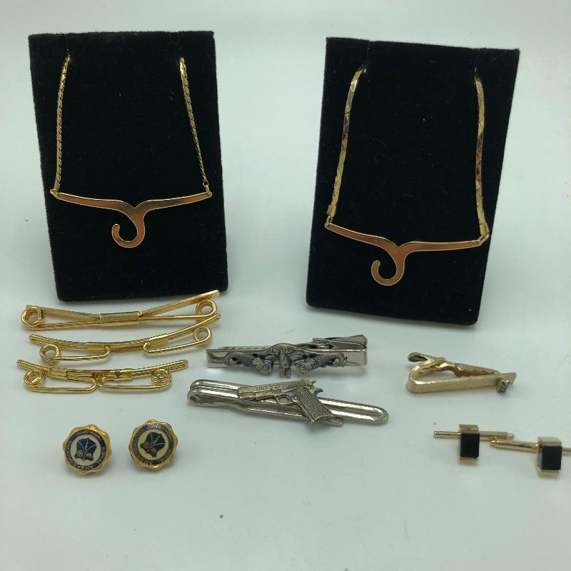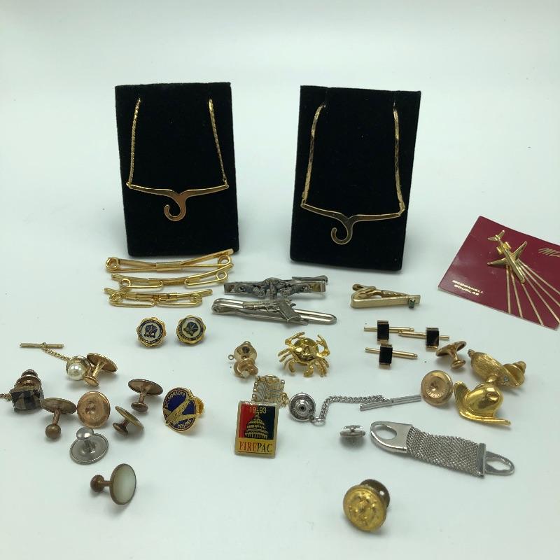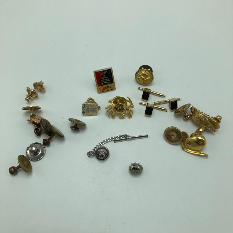 Large collection of cuff links and tie clips, pins, tuxedo buttons, tie chains, cuff link wrap and more. See images for everything that is included, there are many unique pieces here including a tie clip with a Colt gun on it. Two images show the markings on the mouse pin and finally the marking on the fish embellished tie clip.