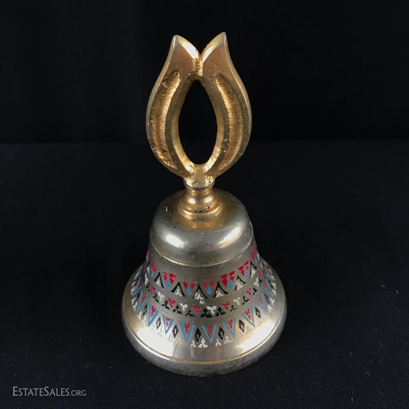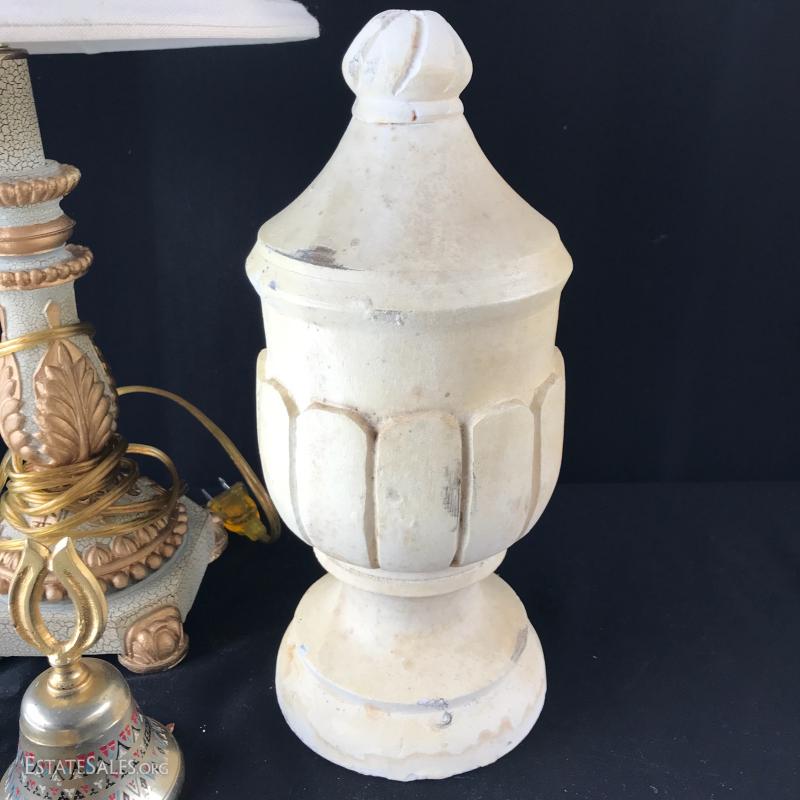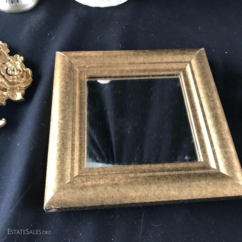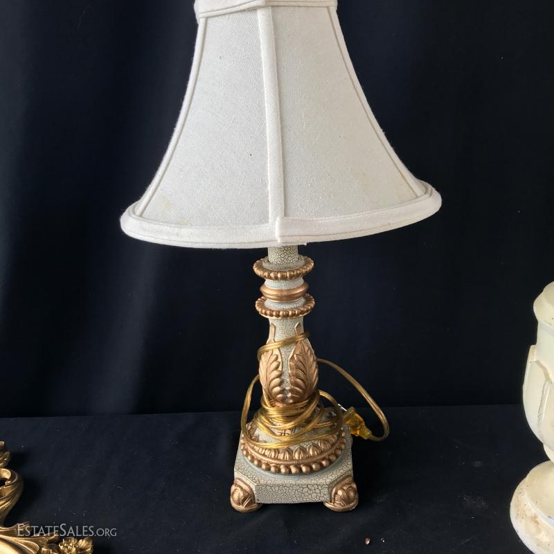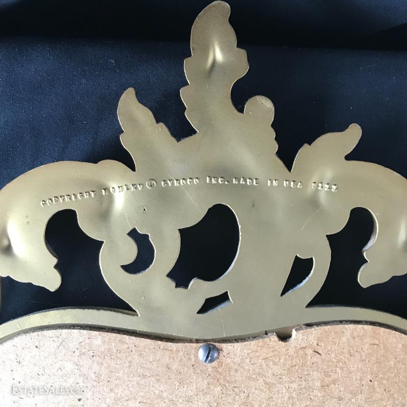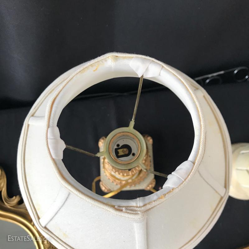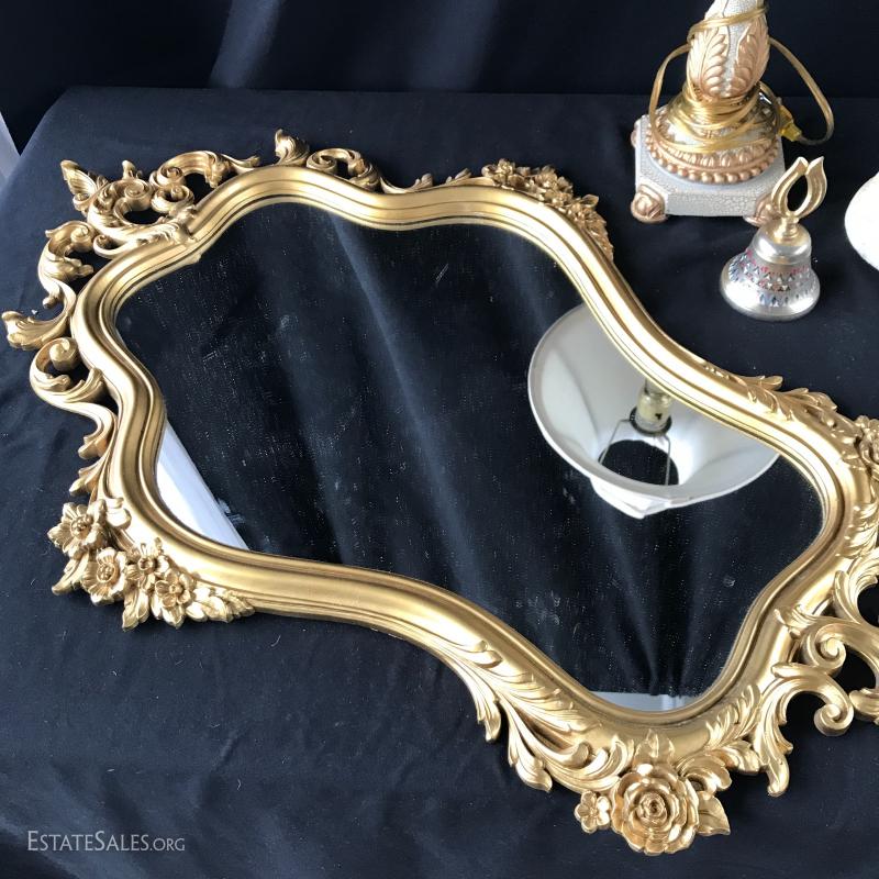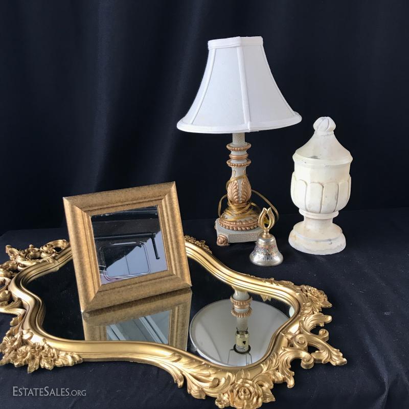 Gold Syroco, Inc. mirror measures 29”l x 19”w. Gold and beige lamp has 10” d shade and is 17” tall. Brass bell and other misc items in lot. See pics. Shipping available or local pick up in Asheville, NC.