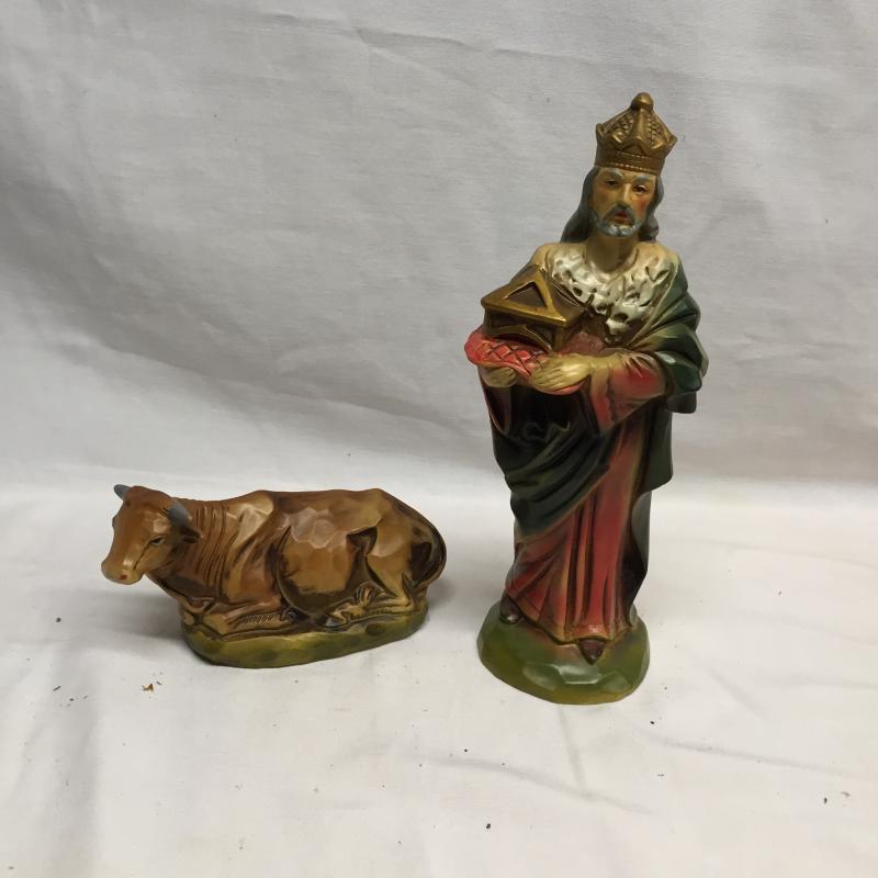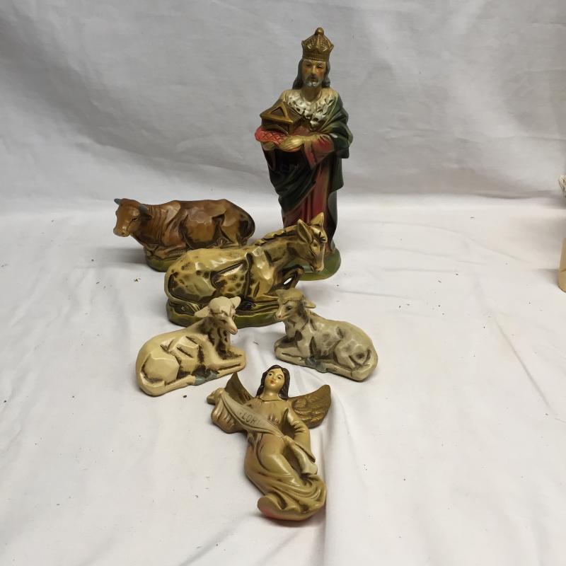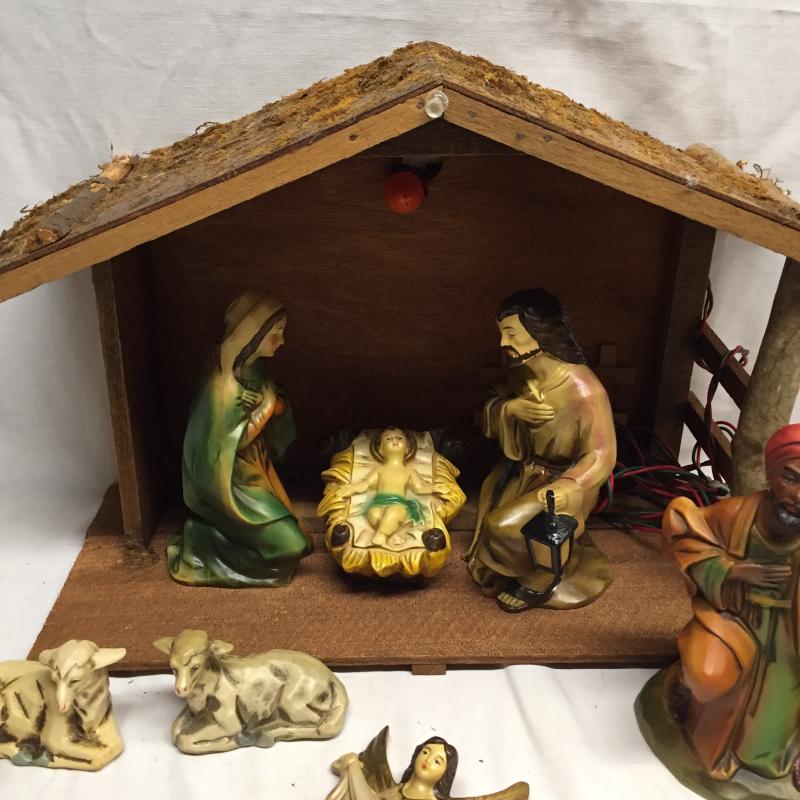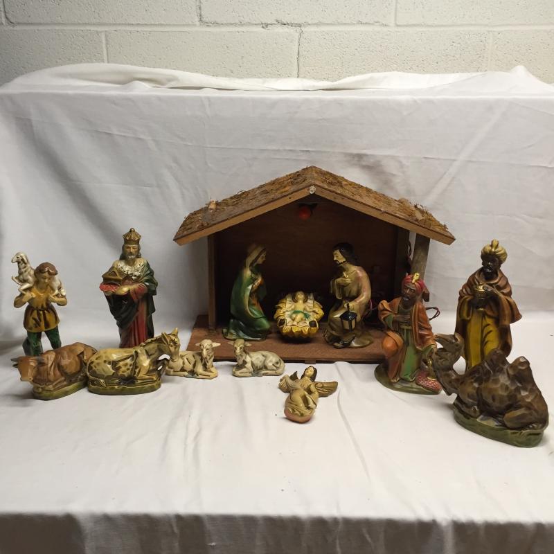 Nativity Scene. Get ready for Christmas with this great Nativity Scene of ceramic pieces. Barn (made of wood) Measures 12” x 16.5” x 7”.