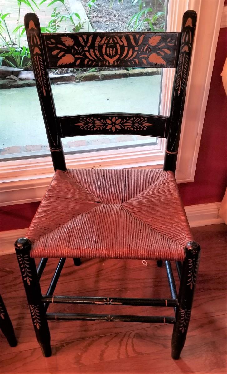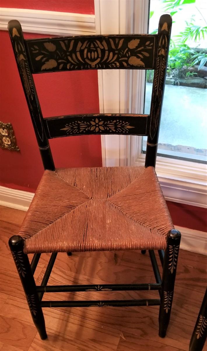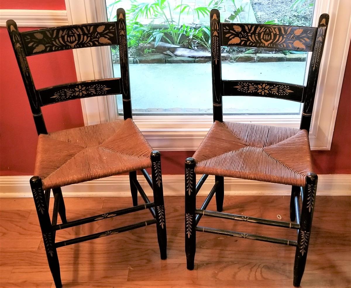 Two good-looking side chairs, rush bottoms, painted decoration. Classics that go with any decor. 15.5" wide at the seat, 33" tall. Overall good condition, gently used.