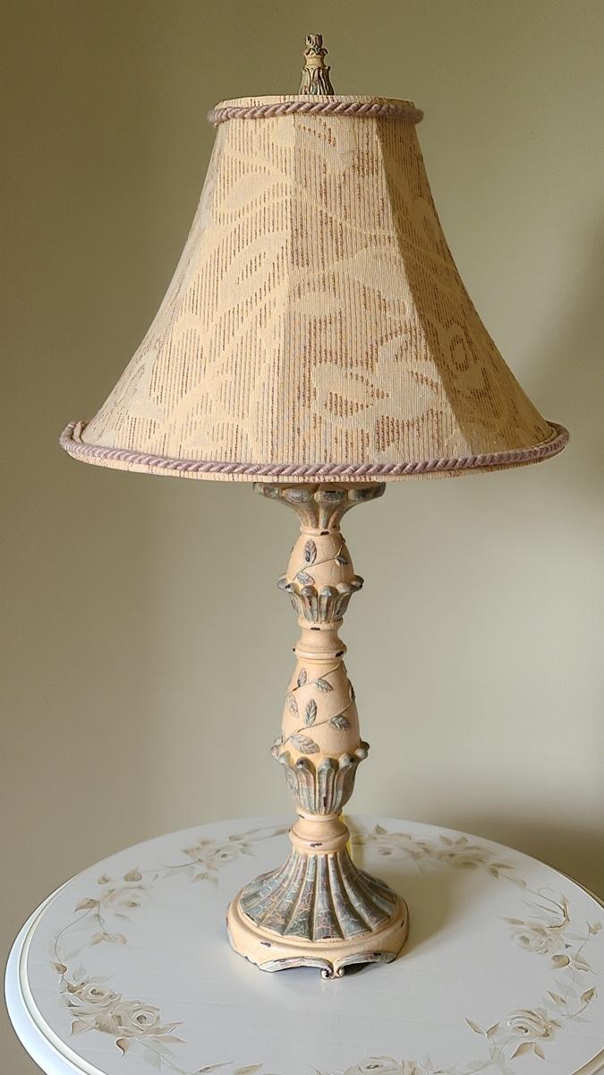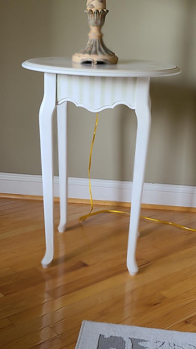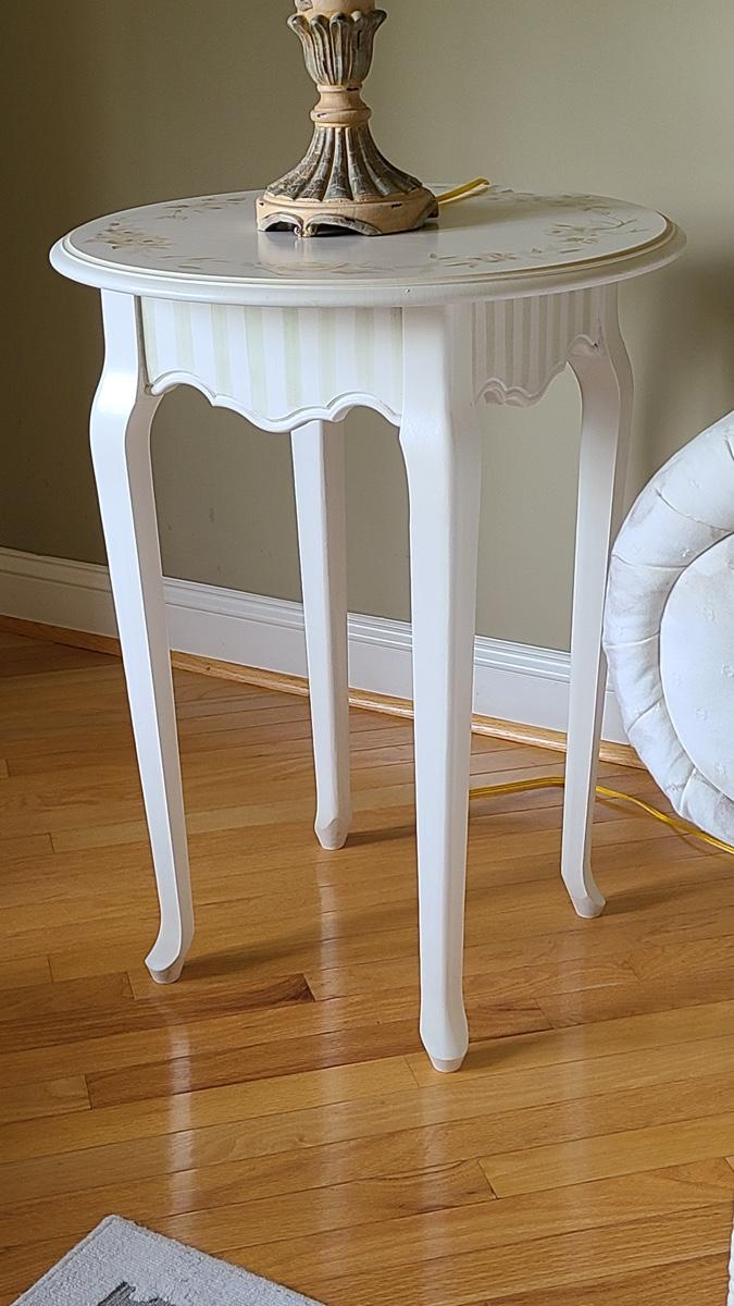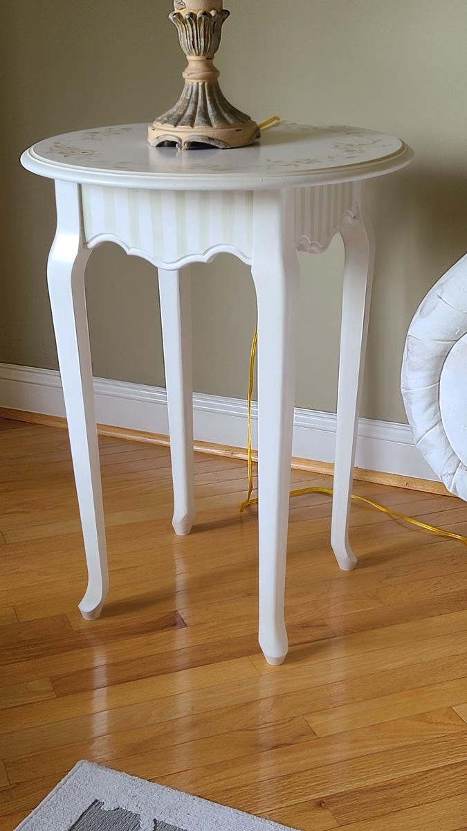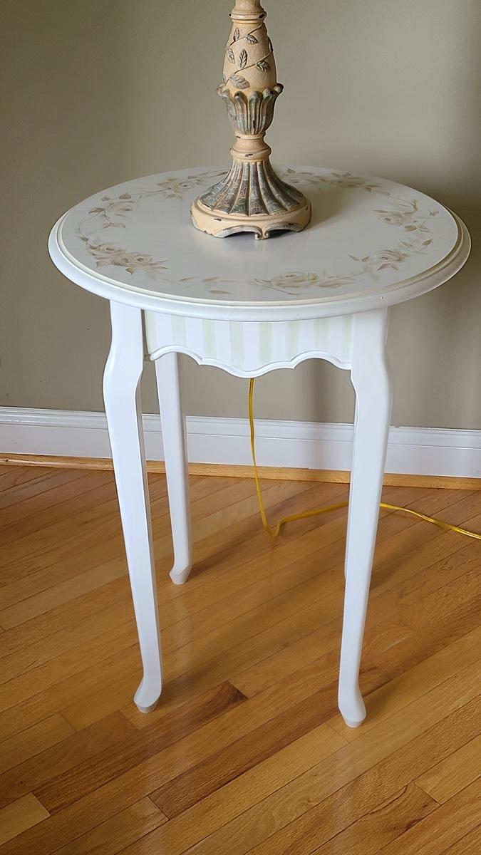Lovely painted accent table with decorative lamp. Perfect accents for any room. Please see all pictures for content of the lot, condition of the lot, and measurements if taken. Pictures are the best representation of the items listed and items are untested unless indicated in description. Thank you for looking and have fun bidding!