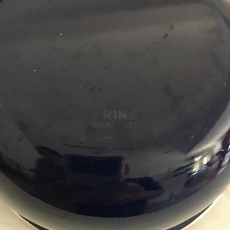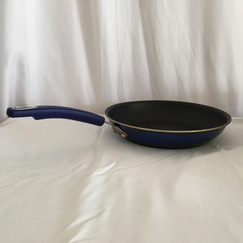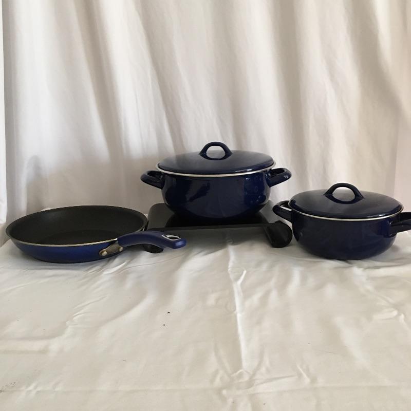 Selection of pots and pans include two German blue pots with covers and a blue frying pan. Collection also contains two sauce pans, one with lid and a large pot with lid. Largest frying pan measures 10.75”