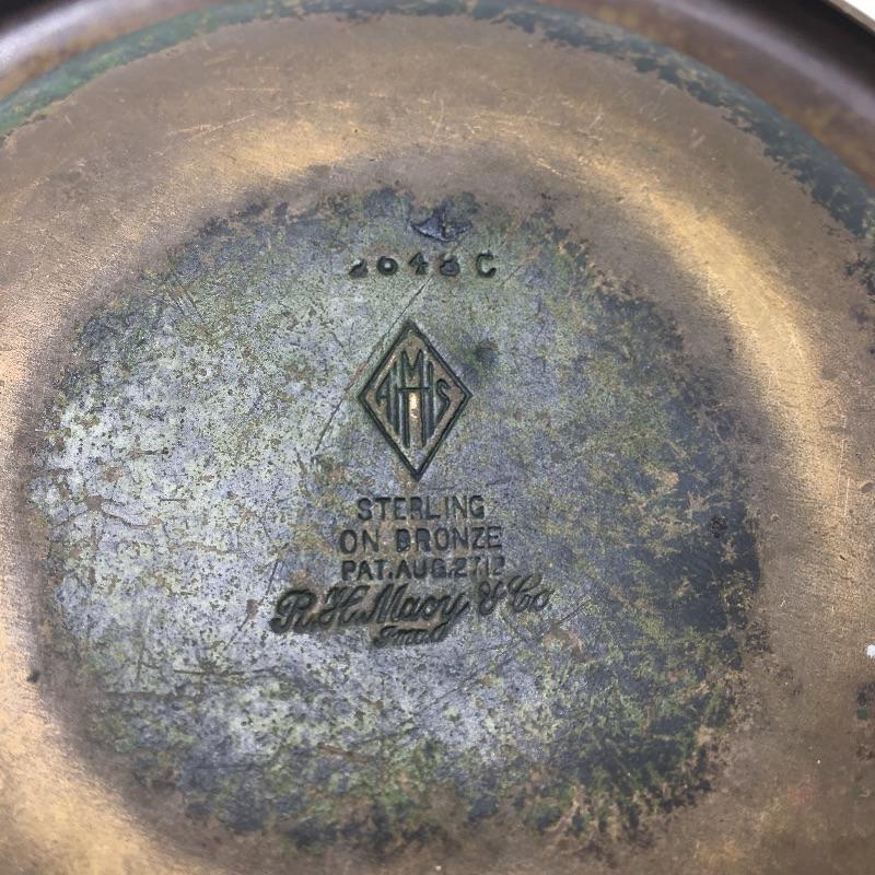 Heinz made for R.H. Macy Sterling on bronze cigar ashtray. Ashtray is stamped R.H. Macy & Co. sterling on bronze. Unique ashtray is great for display or for practical use. Ashtray measures 5.75”D x 1.5” tall