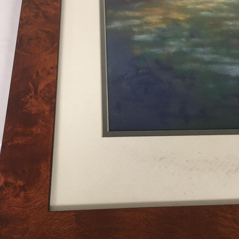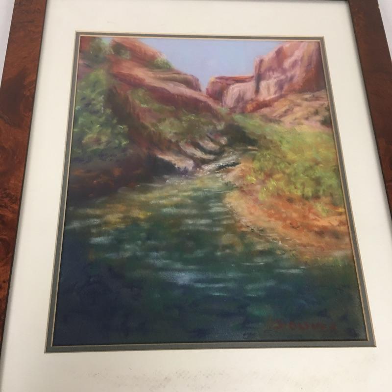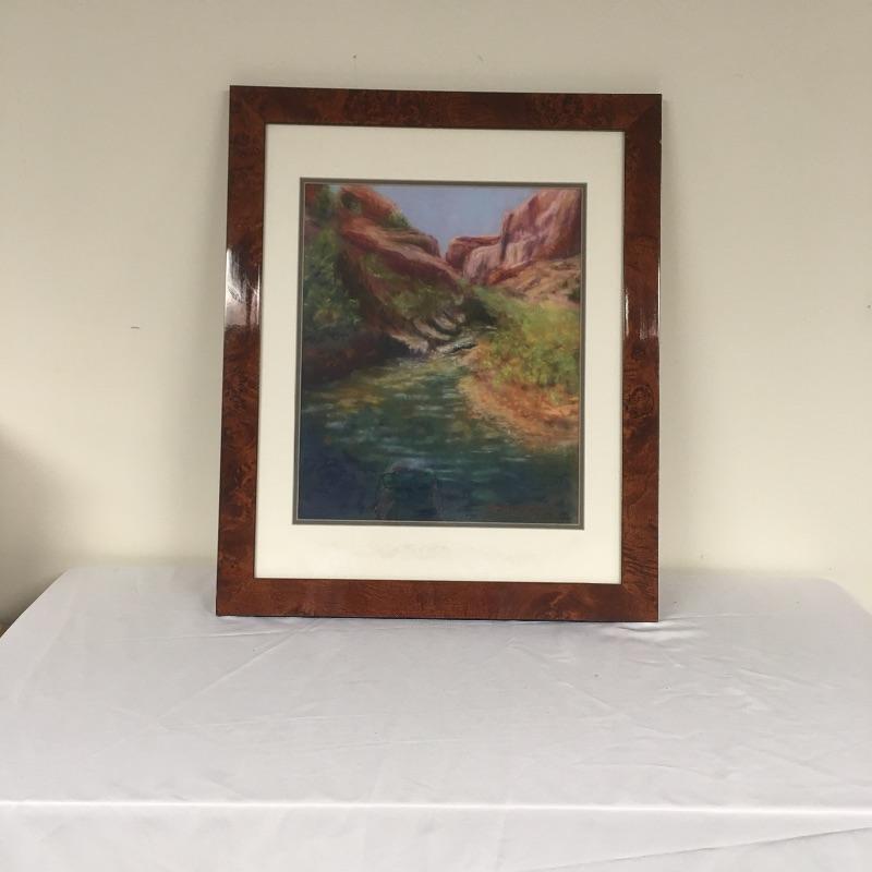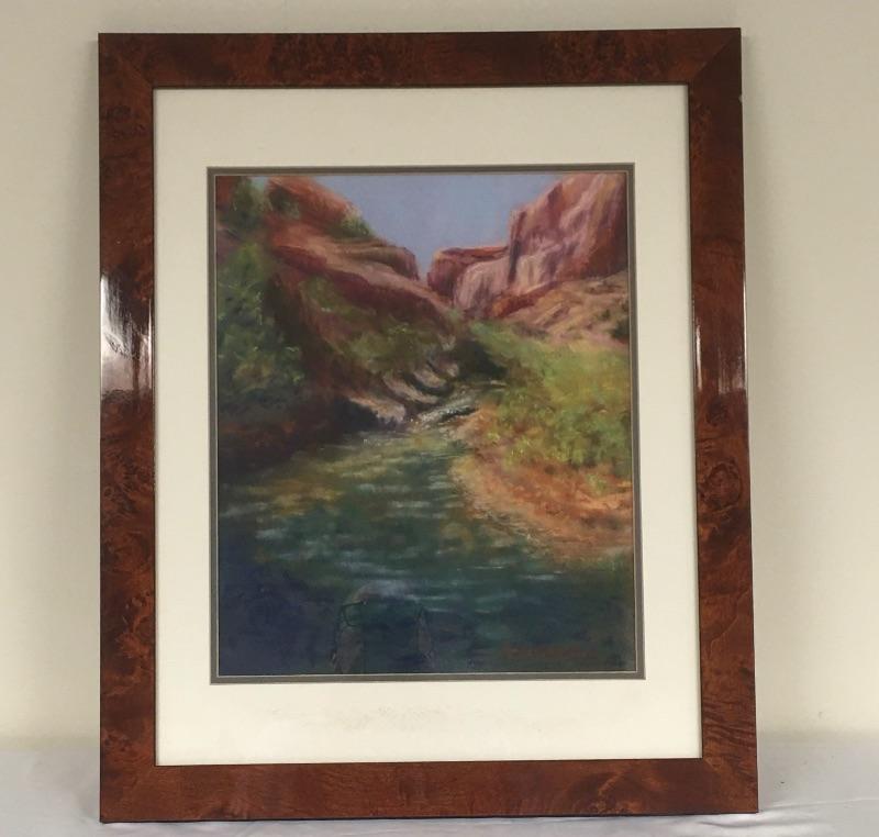 This is a framed, matted and signed pastel of a canyon in Moab Utah by Sharon Oliver