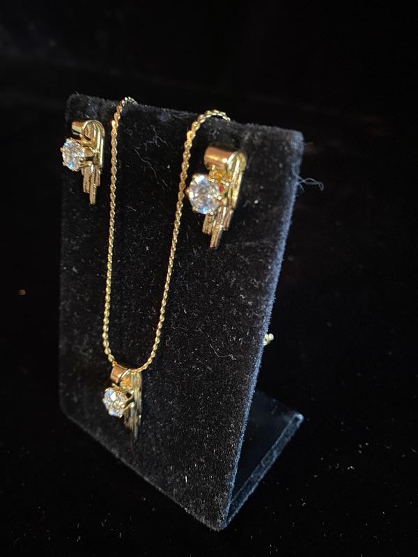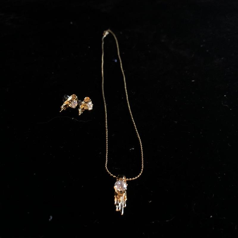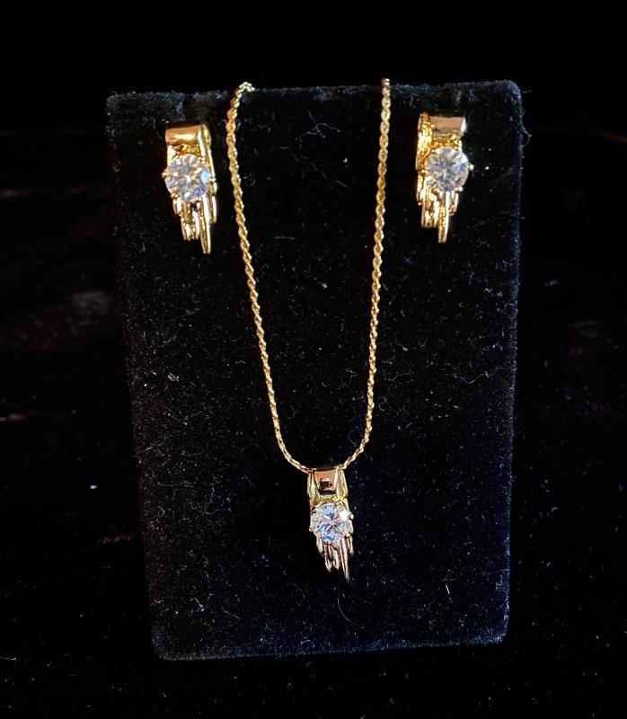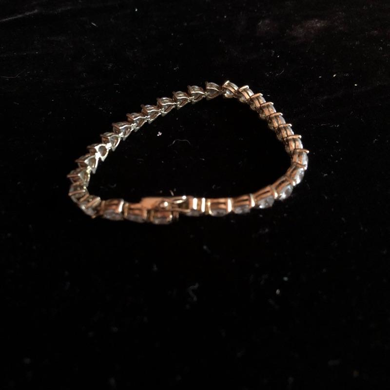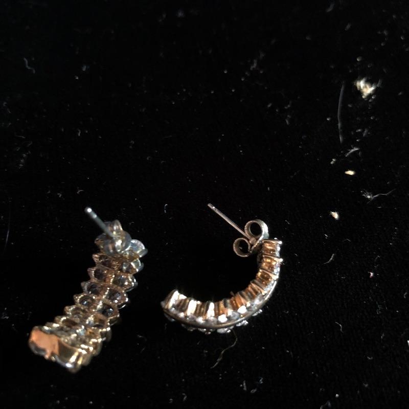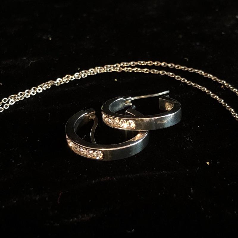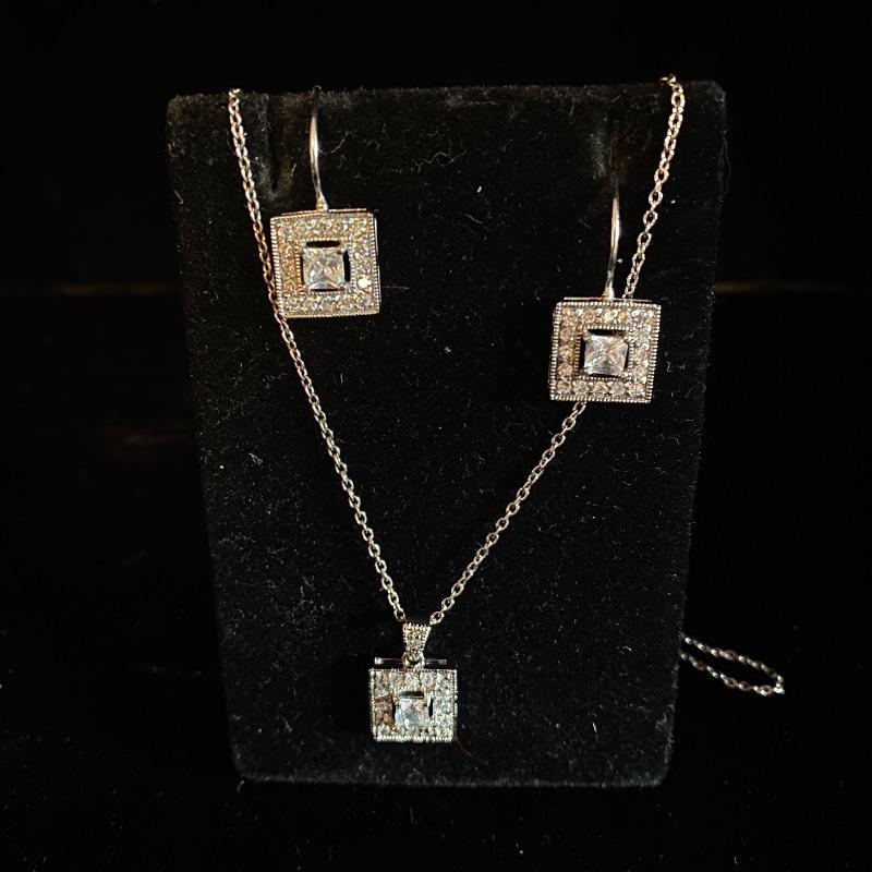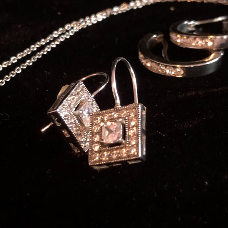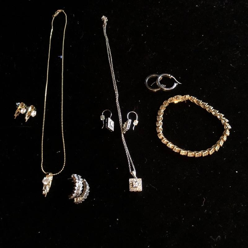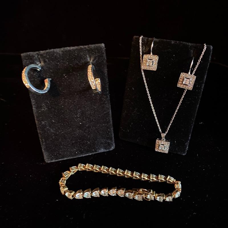 This lot contains several sparkly 925 pieces and more! The 925 pieces include the silver necklace with the square pendant and matching square earrings. The Crystal and silver hoop earrings and the crystal heart shaped bracelet are also marked 925. In addition to those pieces, this lot also includes beautiful semi-hoop earrings along with a matching gold colored and crystal necklace and earring set. There are no marks on this set. Shipping available.