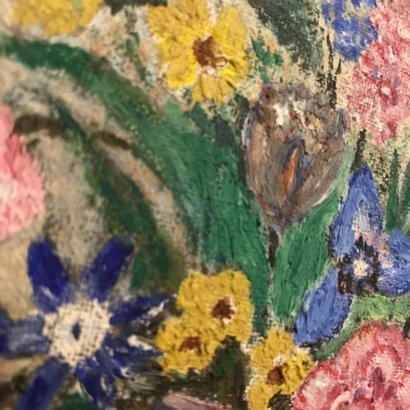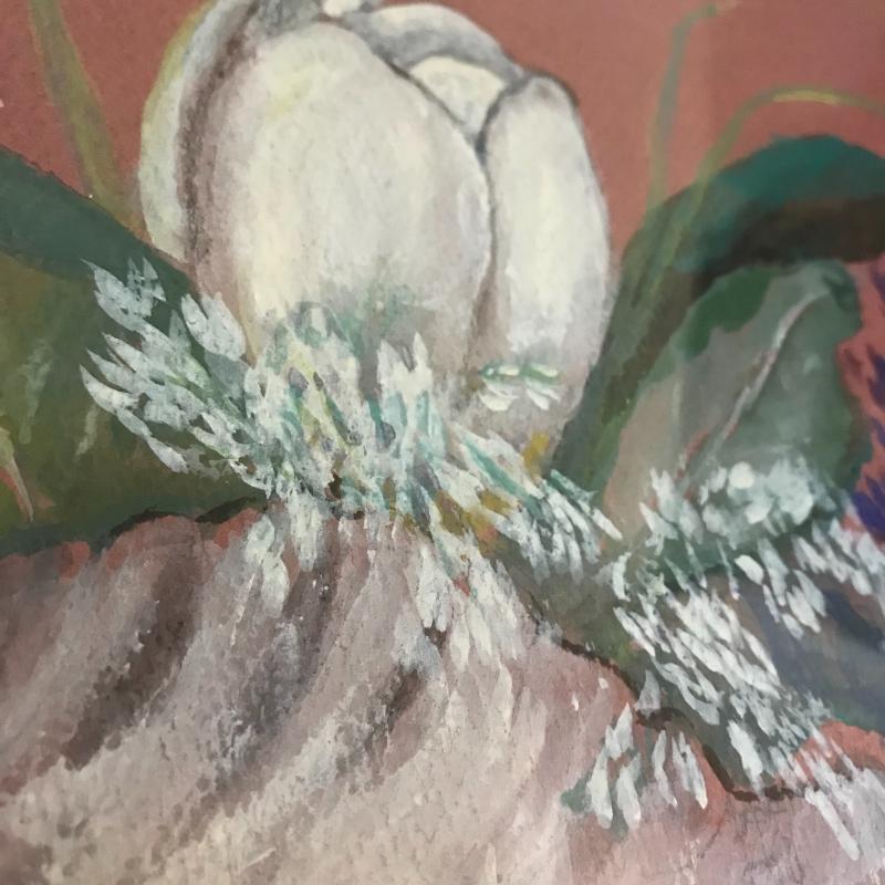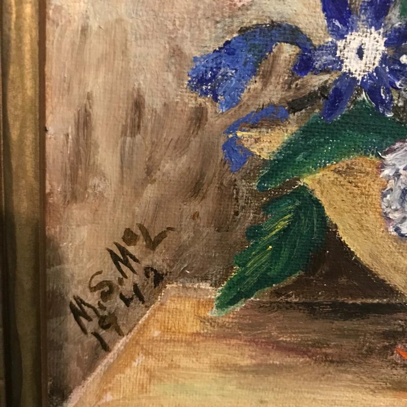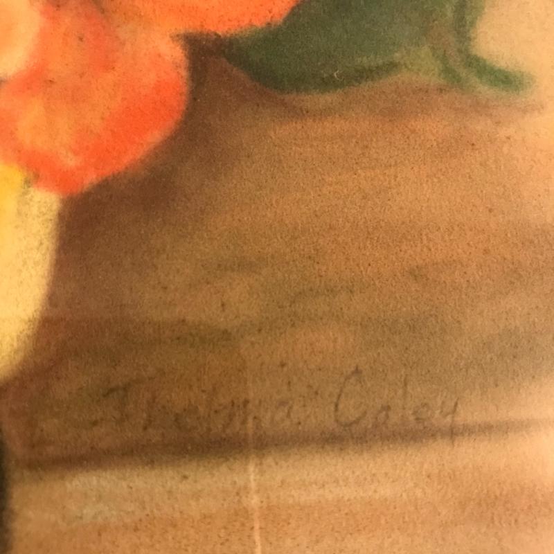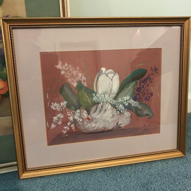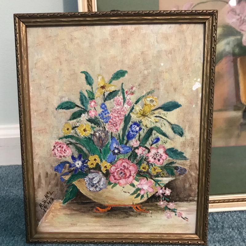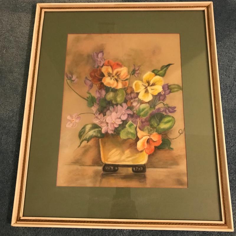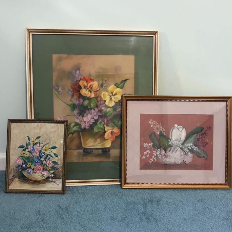 Three potted floral depictions, the smallest appears to be an oil painting, the mid size states it’s a water color on backside and the largest measures 20”x23.75”. Frames appear to be in fine condition. See photos for signatures. Local pick up only.