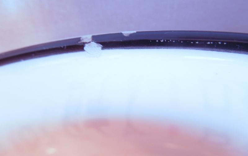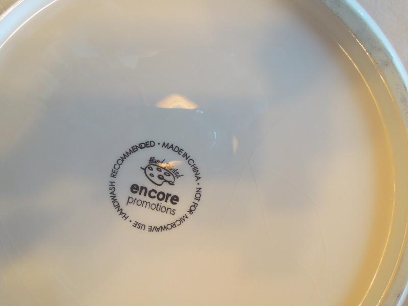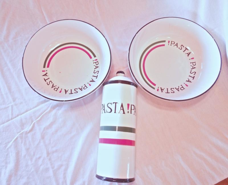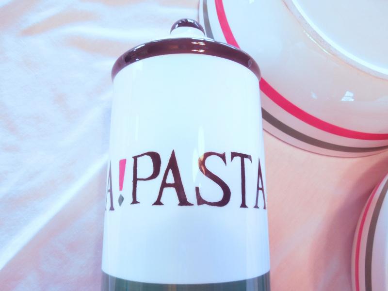 2 large handpainted 12" ceramic pasta bowls and 14" tall lidded pasta keeper by Encore. Small chips along edge of one bowl.