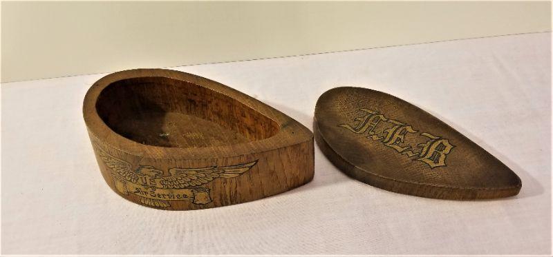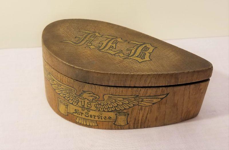 Vintage tear drop shaped box, decorated with initials AEB on lid and "U.S. Air Service - Eagles" on side.. 7" long, 3" tall. Good vintage condition.