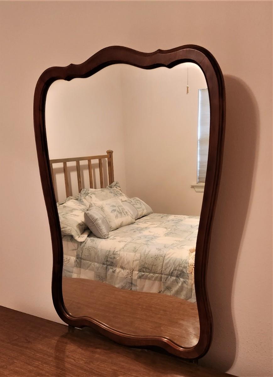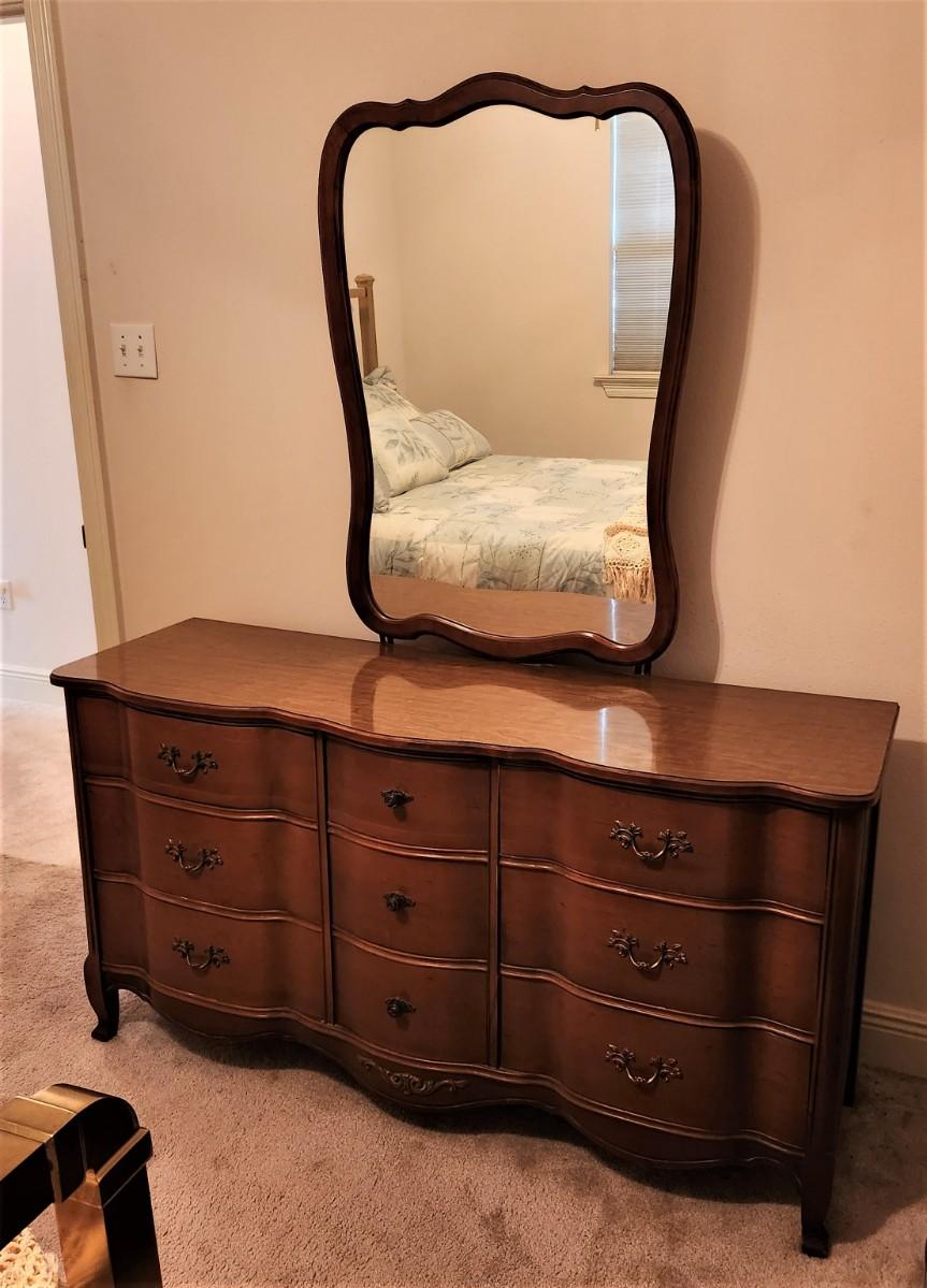 Great vintage MidCentury Dresser - all original - 9 drawers, removeable mirror. 17" deep, 58" across, 31" tall - mirror adds another 40.5". Good vintage condition - no maker noted. Clean.