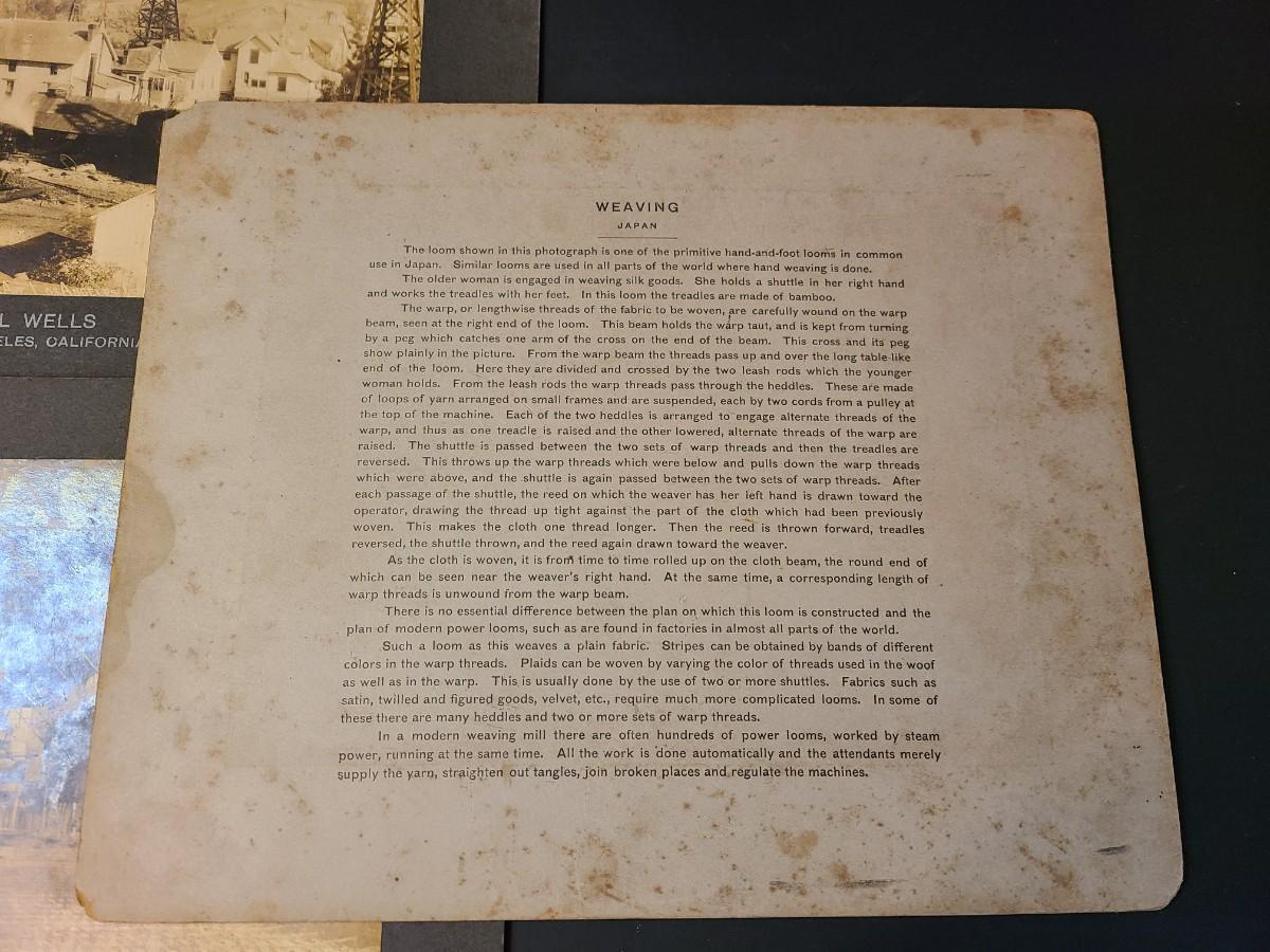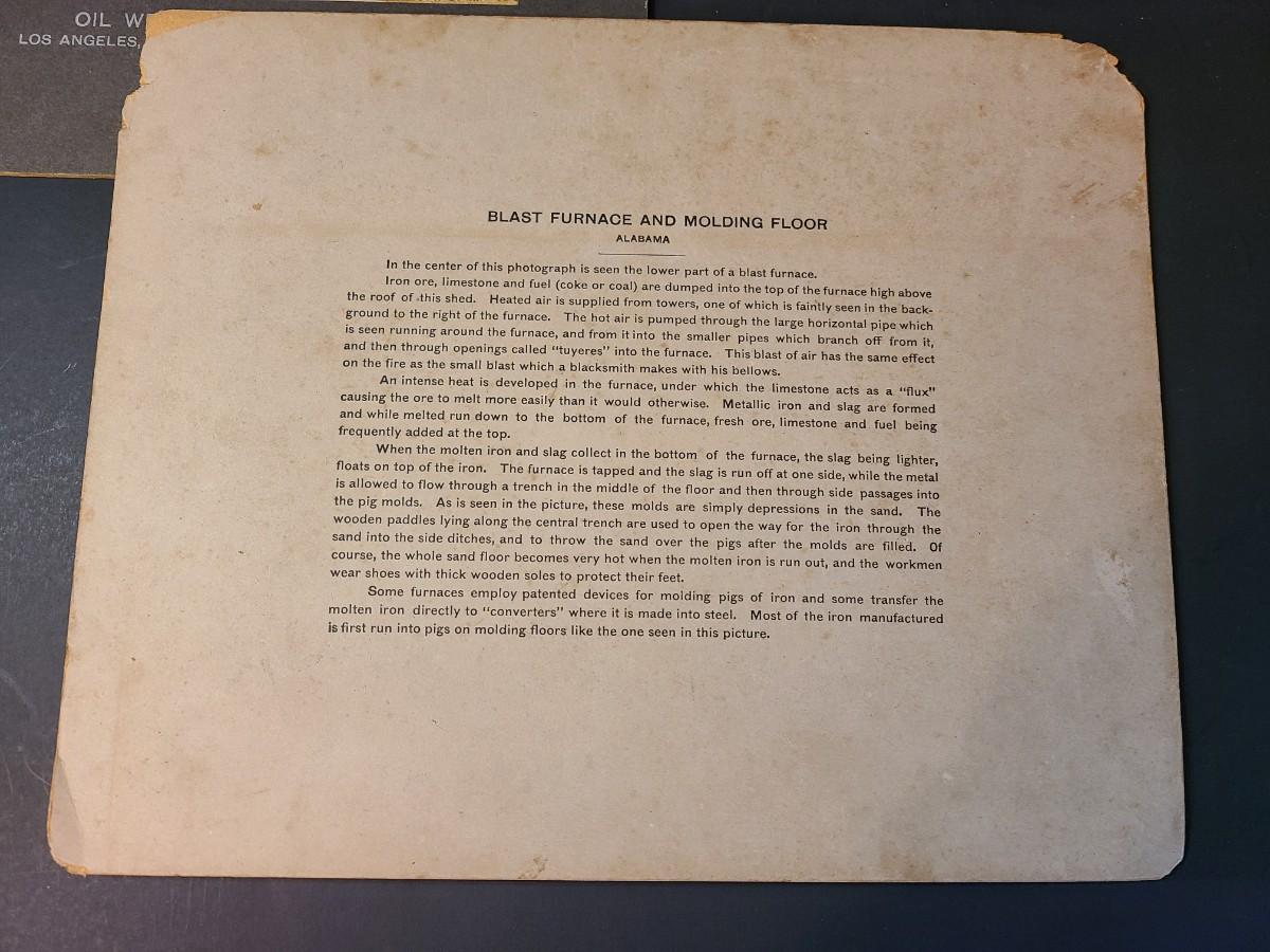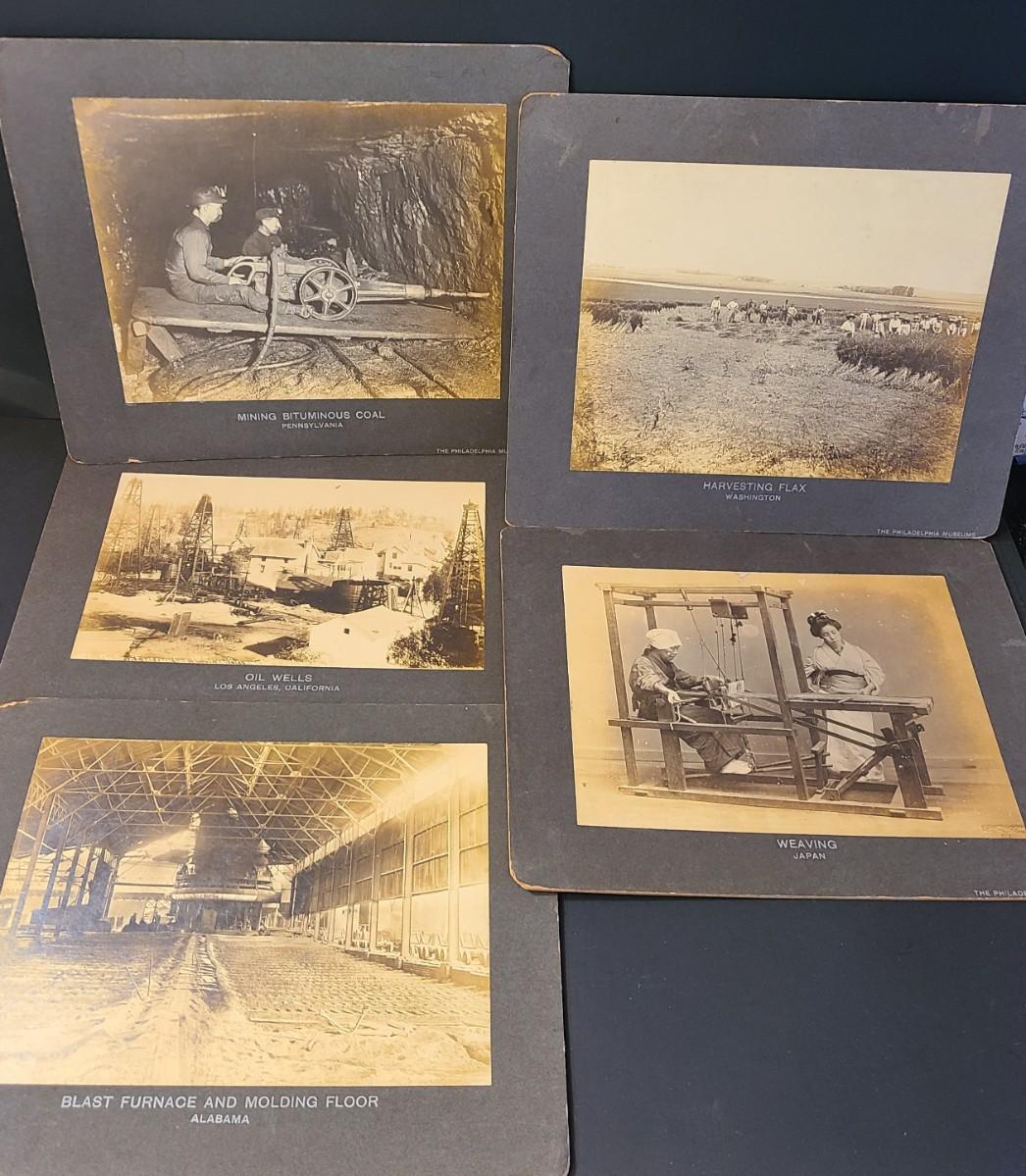 Interesting collection of photo cards from The Philadelphia Museum.. Includes weaving in Japan, oil wells in California, Blast Furnace, in Alabama, coal mine in Pennsylvania and harvesting flax in Washington.