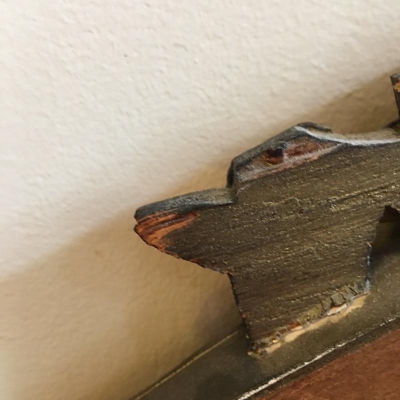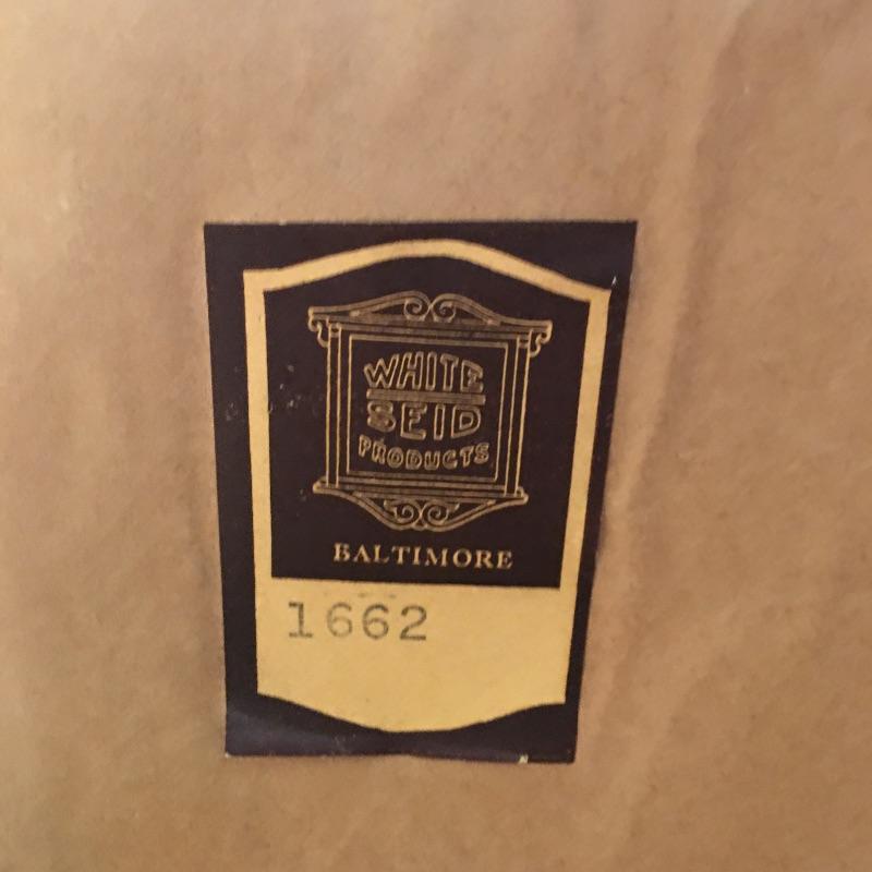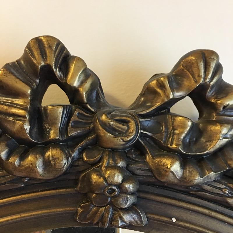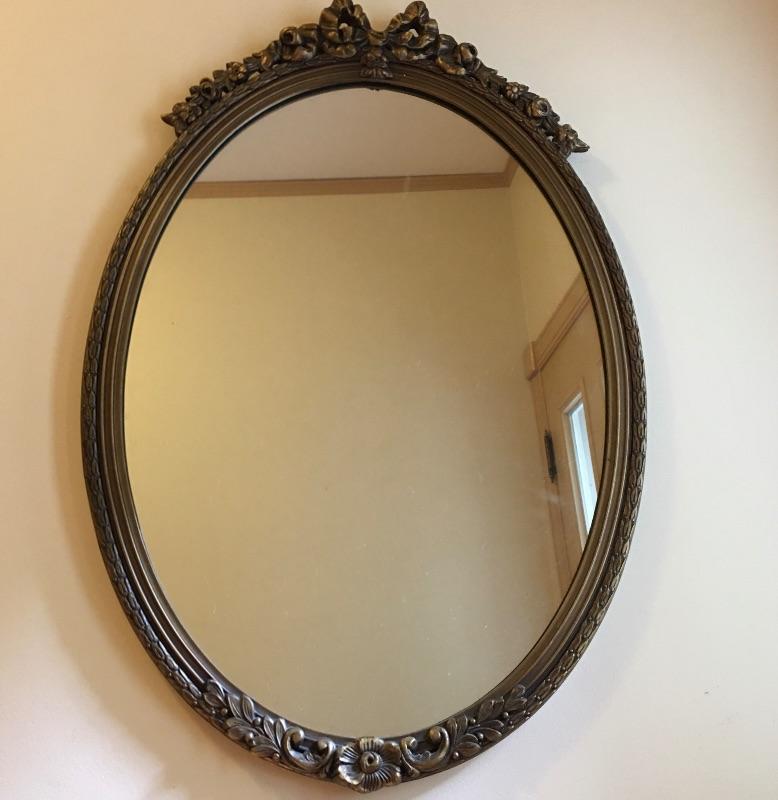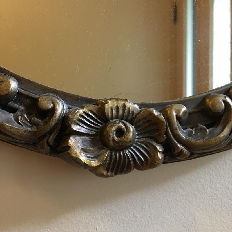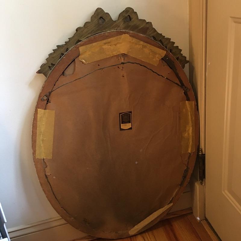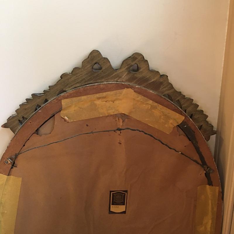 This delightful vintage Baltimore made mirror by White Seid Products and has a wooden frame with an ornate design on the top and bottom. It is made of wood and painted an attractive aged gold color.