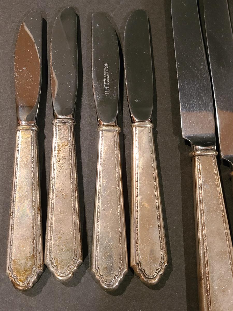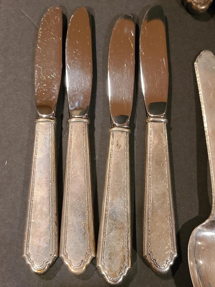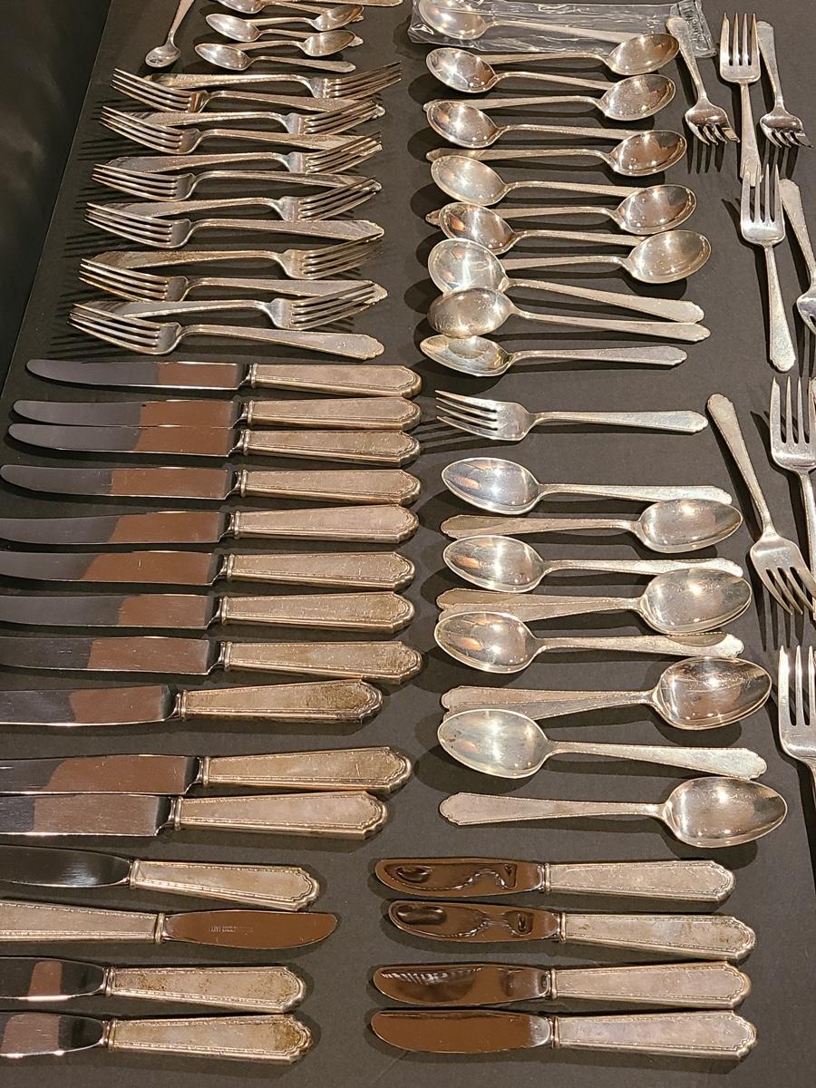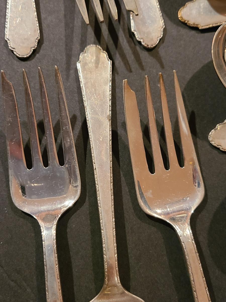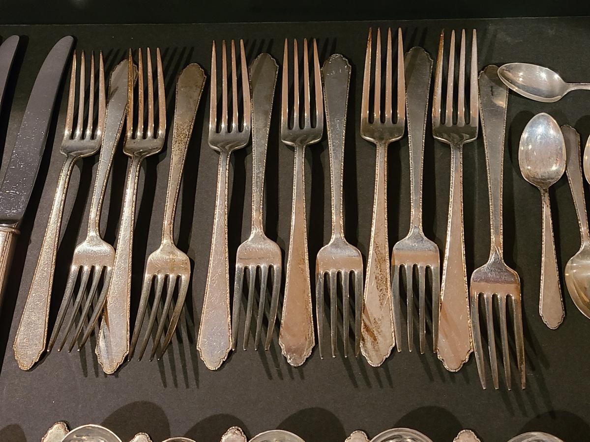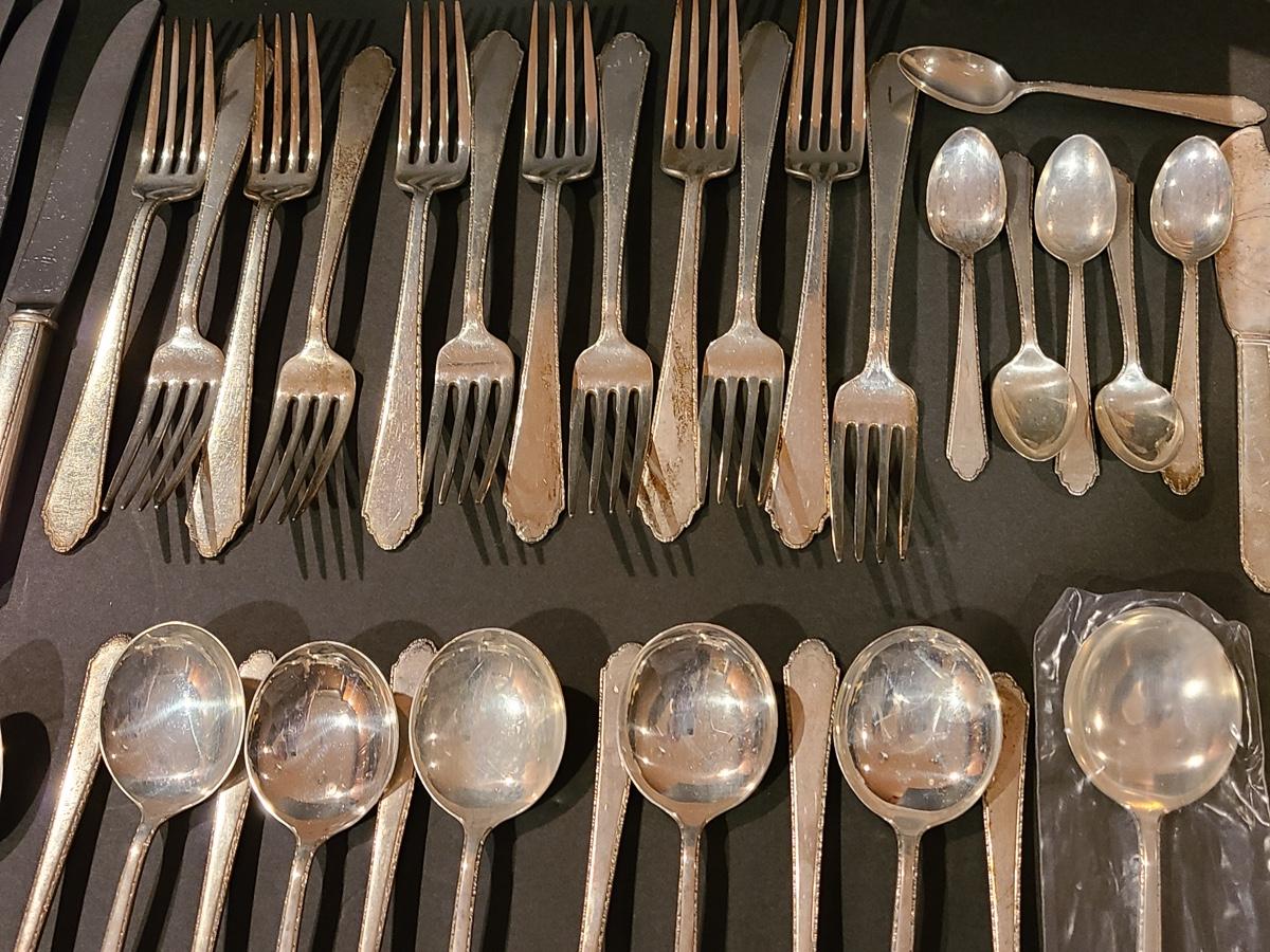 Please let read carefully: This is for what is seen in the pictures. There is enough for a 12 place setting, but one of the knives is a newer version of the vintage/antique version and has the slightest variation to the blade. That is why in the picture you see 11 knives, but in the final you see two extra butter knives, and random extra pieces. This comes with 11 knives, 12 larger forks, 12 smaller forks, 12 teaspoons, and 12 soup spoons, NOT 12 Larger spoons like some sets. These are not monogrammed. This looks to be the 1921 William and Mary pattern.Also included are the extras in the last photo. Please see all pictures. The pictures show condition, measurements if taken, and what is included in the lot. Due to the large amount that we photograph and the time frame, we are not always able to take measurements. All items unless noted, are pre-owned and have been used. If you purchased furniture, you must bring help. We do not allow one person to carry large furniture out on their own. Bring help, tools and a truck for the safety of our client’s homes, and your personal safety. Company policy. Thank you
