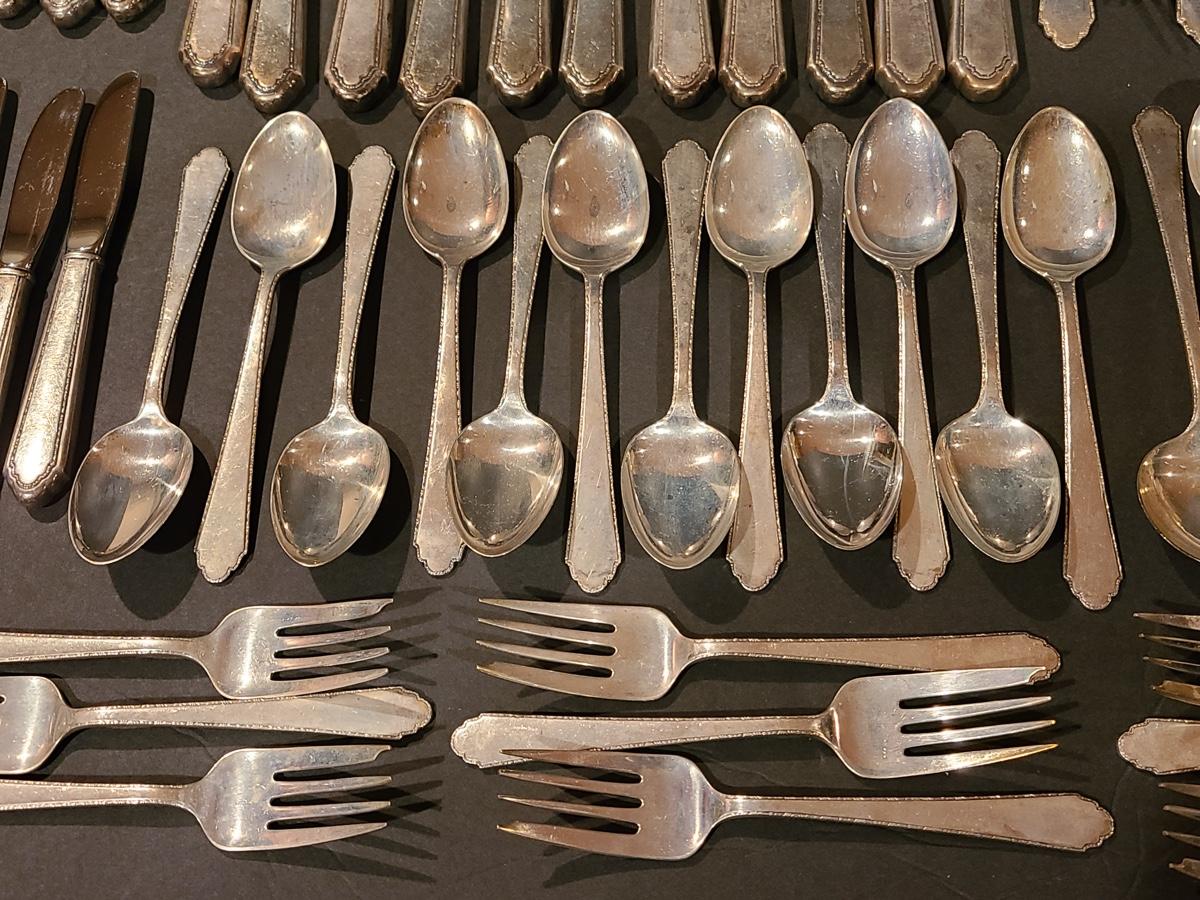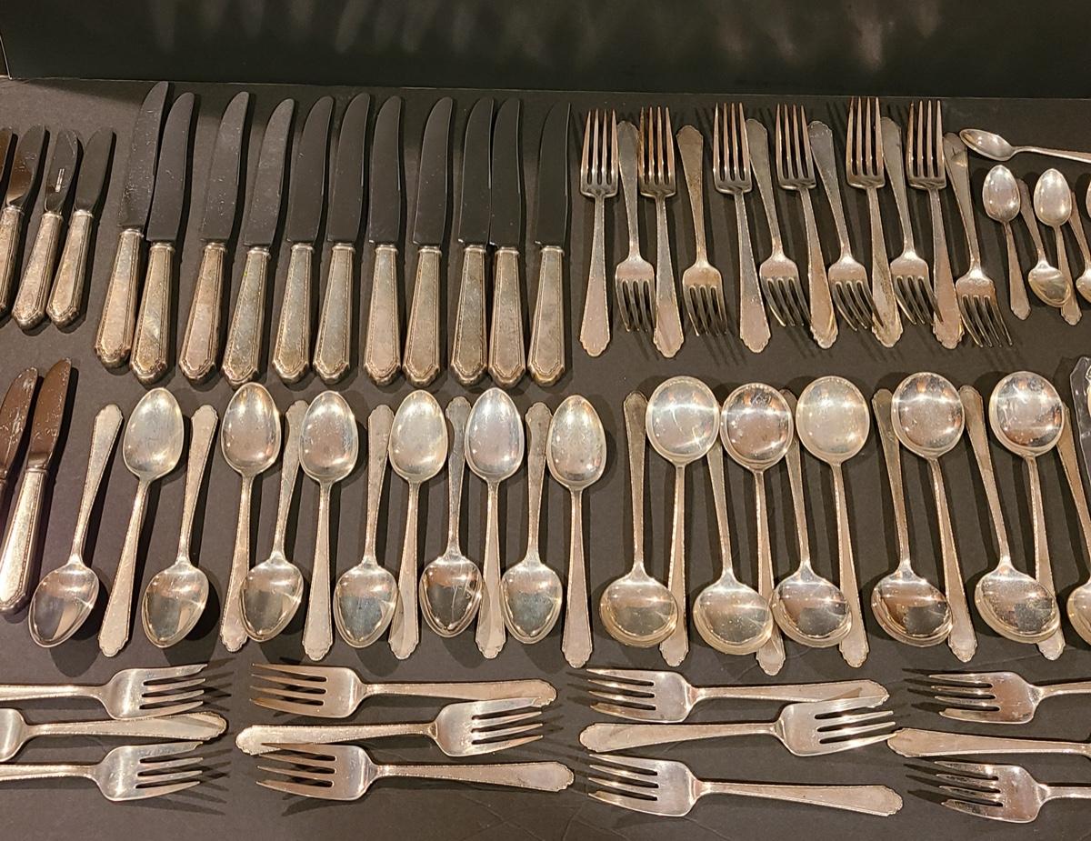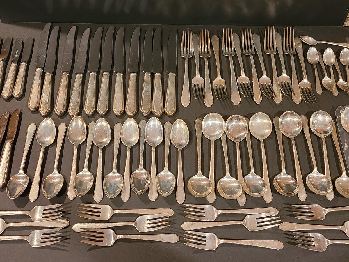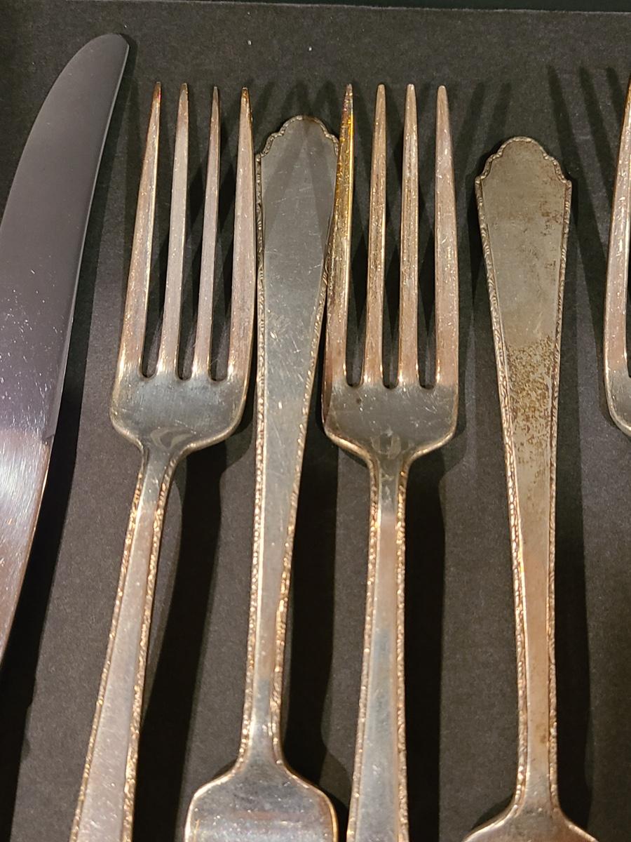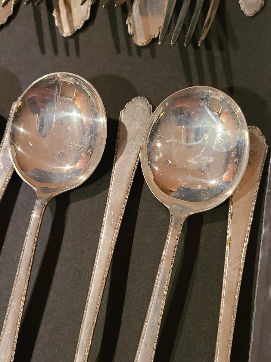 Please let read carefully: This is for what is seen in the pictures. There is enough for a 12 place setting, but one of the knives is a newer version of the vintage/antique version and has the slightest variation to the blade. That is why in the picture you see 11 knives, but in the final you see two extra butter knives, and random extra pieces. This comes with 11 knives, 12 larger forks, 12 smaller forks, 12 teaspoons, and 12 soup spoons, NOT 12 Larger spoons like some sets. These are not monogrammed. This looks to be the 1921 William and Mary pattern.Also included are the extras in the last photo. Please see all pictures. The pictures show condition, measurements if taken, and what is included in the lot. Due to the large amount that we photograph and the time frame, we are not always able to take measurements. All items unless noted, are pre-owned and have been used. If you purchased furniture, you must bring help. We do not allow one person to carry large furniture out on their own. Bring help, tools and a truck for the safety of our client’s homes, and your personal safety. Company policy. Thank you