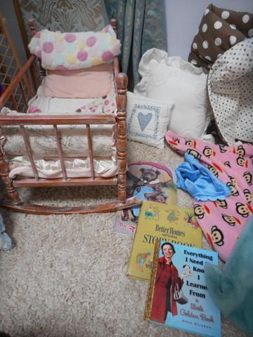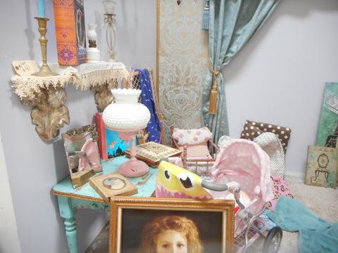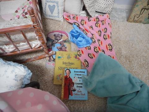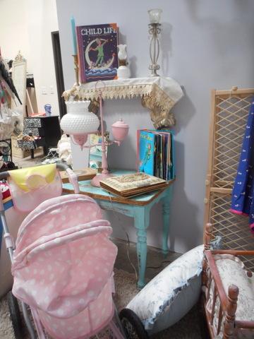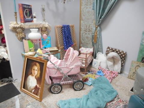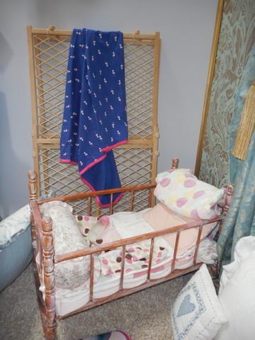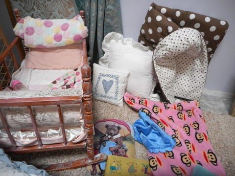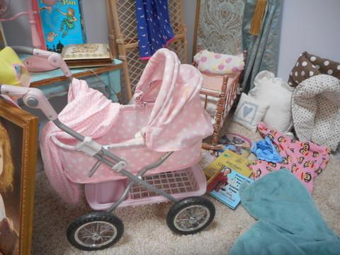 The shabby chic table has some corner damage present and the stroller is wooden. Lots of pillows and blankets