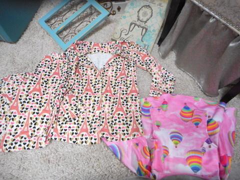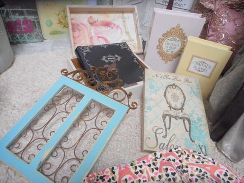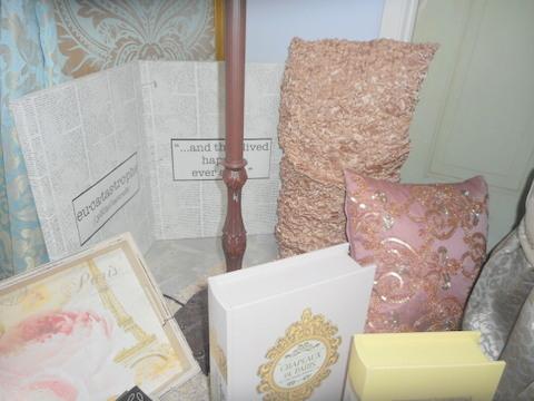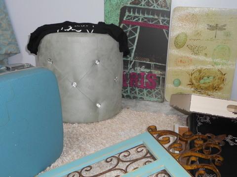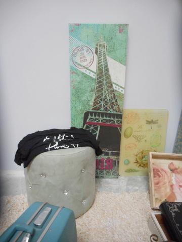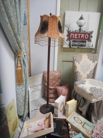 Floor lamp with fringe, Tufted ottoman, wall hangings, Paris Pajamas size XS, picture album, shabby chic table, upholstered chair