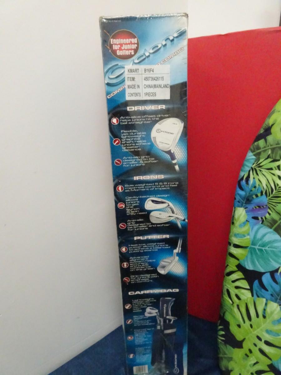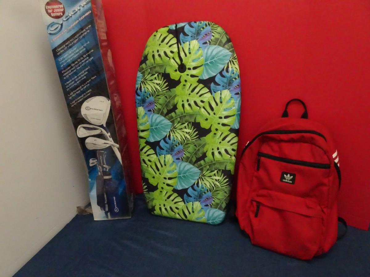 LOT 644. KIDS GOLF CLUB SET STILL IN BOX, BODY BOARD AND ADIDAS BACK PACK