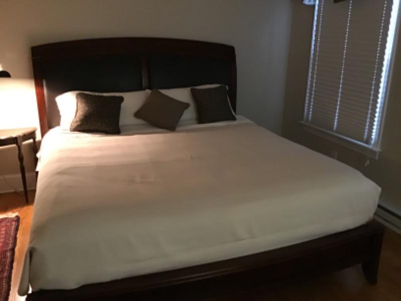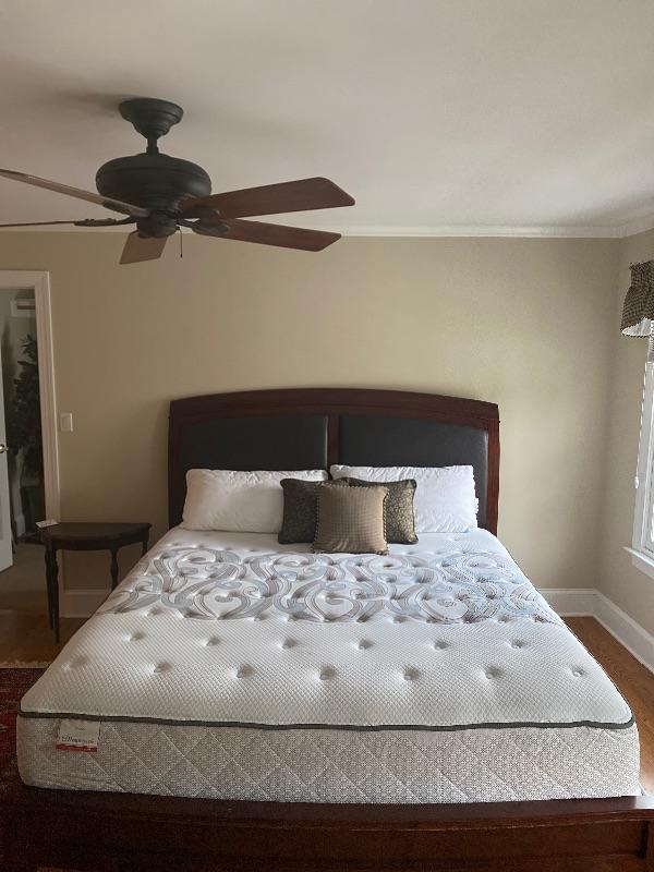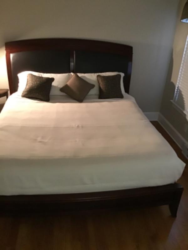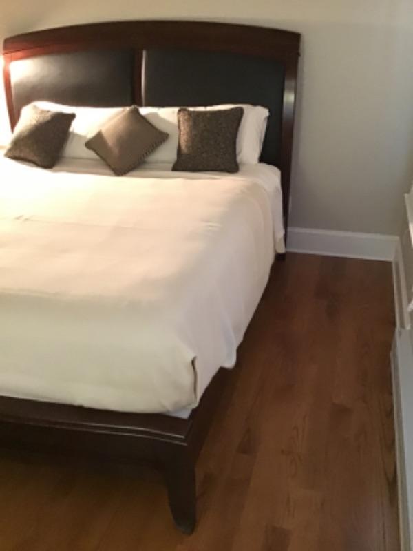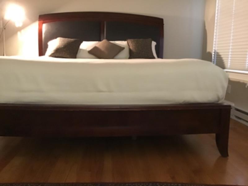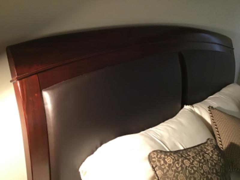 Brighton sleigh leather King Size Bed, Wood color is cherry (mattress and box spring are included) some scratches on footboard