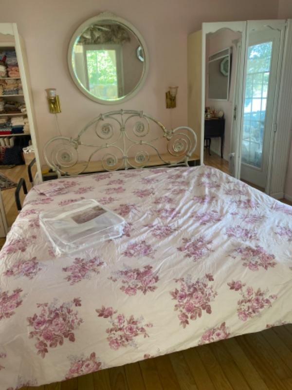 Lot #646 Painted Metal Headboard And Mirror with Enso Automatic & Bedding