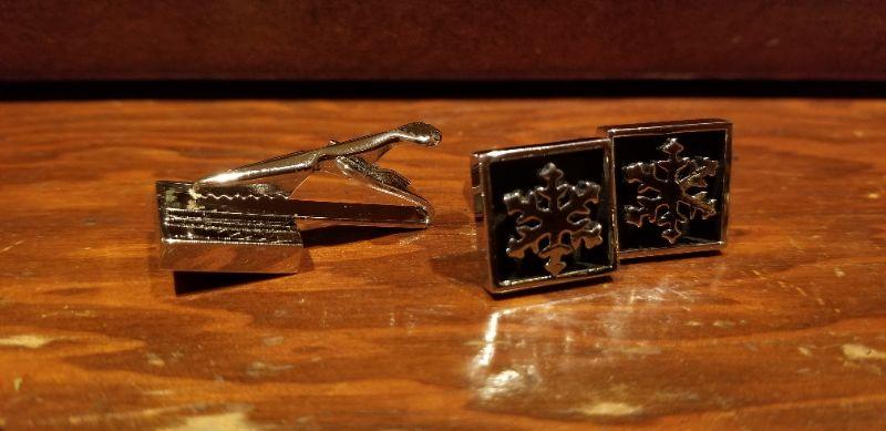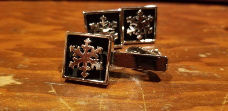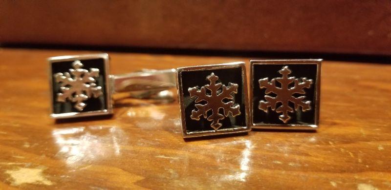 LOT #648: Men's Vintage Snowflake Themed Cufflink and Tiebar Dress Set