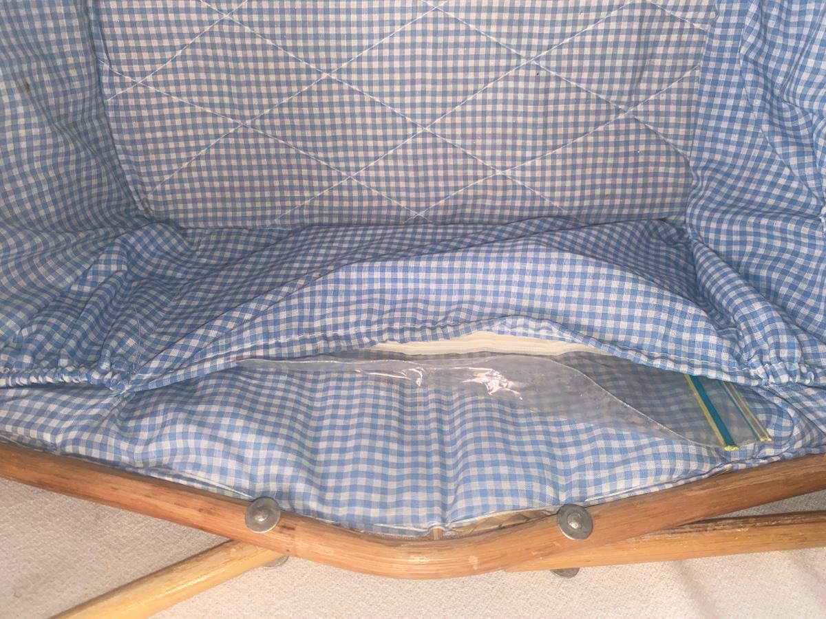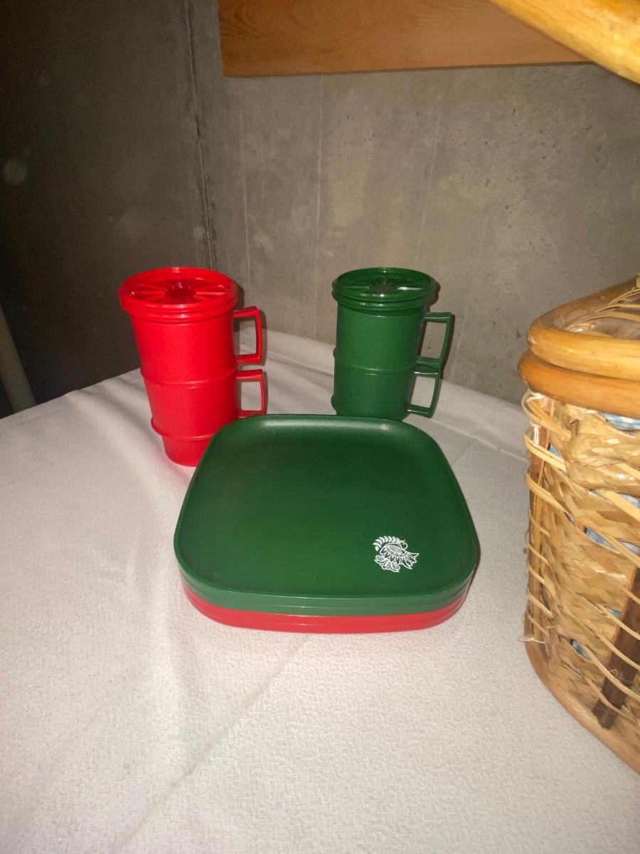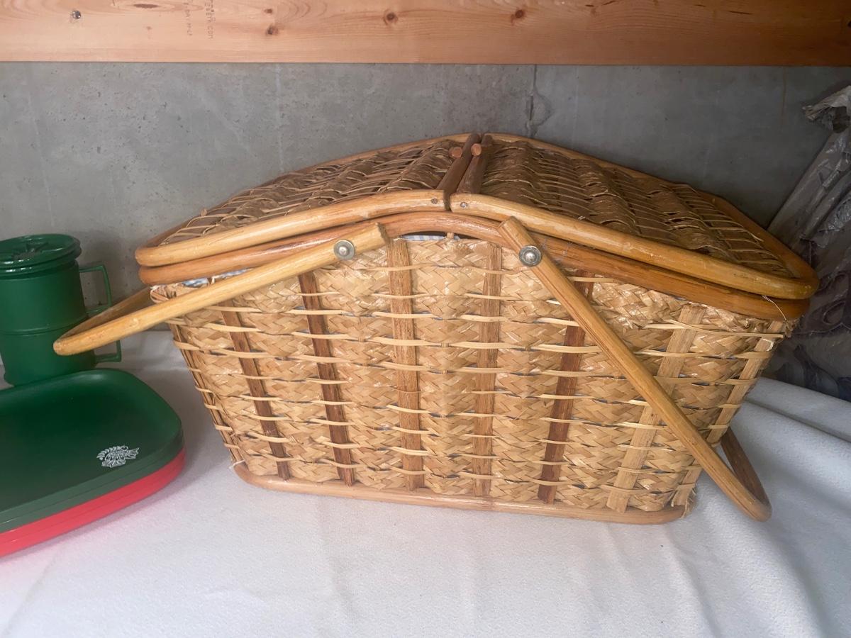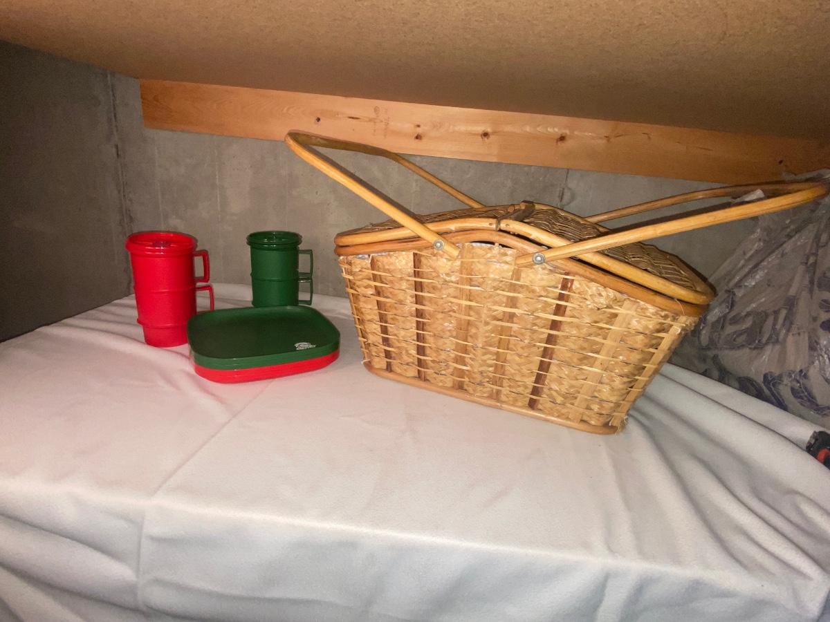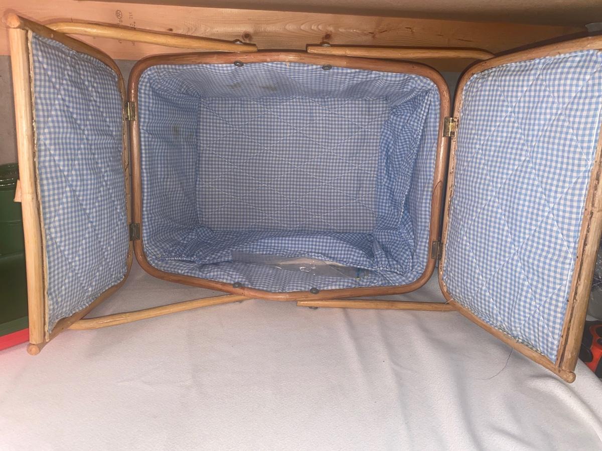 WOVEN, LINED PICNIC BASKET WITH PLASTIC DINNERWARE