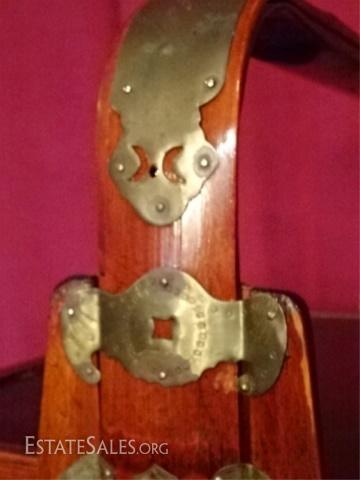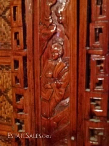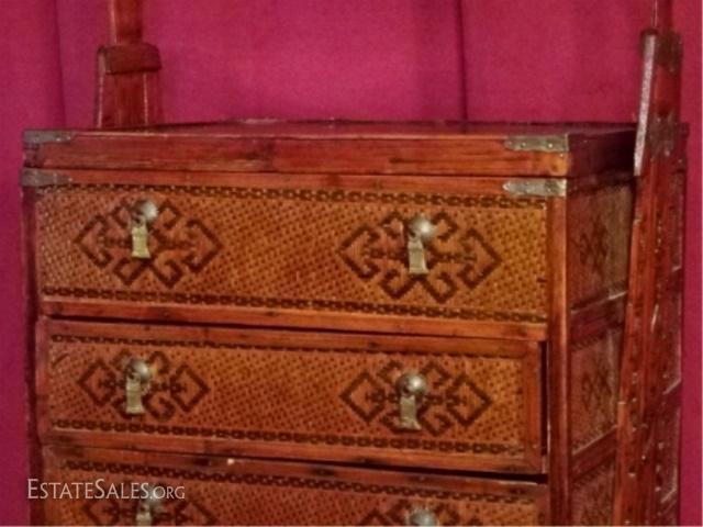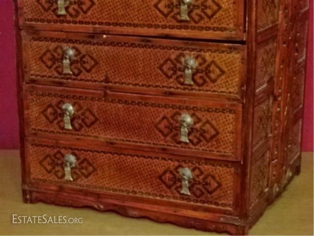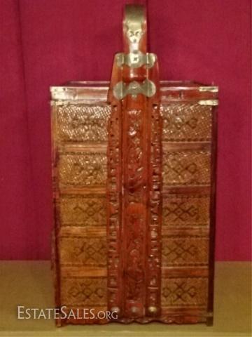 LOT 64D: CHINESE WOOD WEDDING BOX WITH HANDLE, BRASS TRIM, 5 DRAWERS, CARVED FIGURAL PANELS, VERY GOOD CONDITION, 29"H X 17"W X 13"D, SKU8357.03