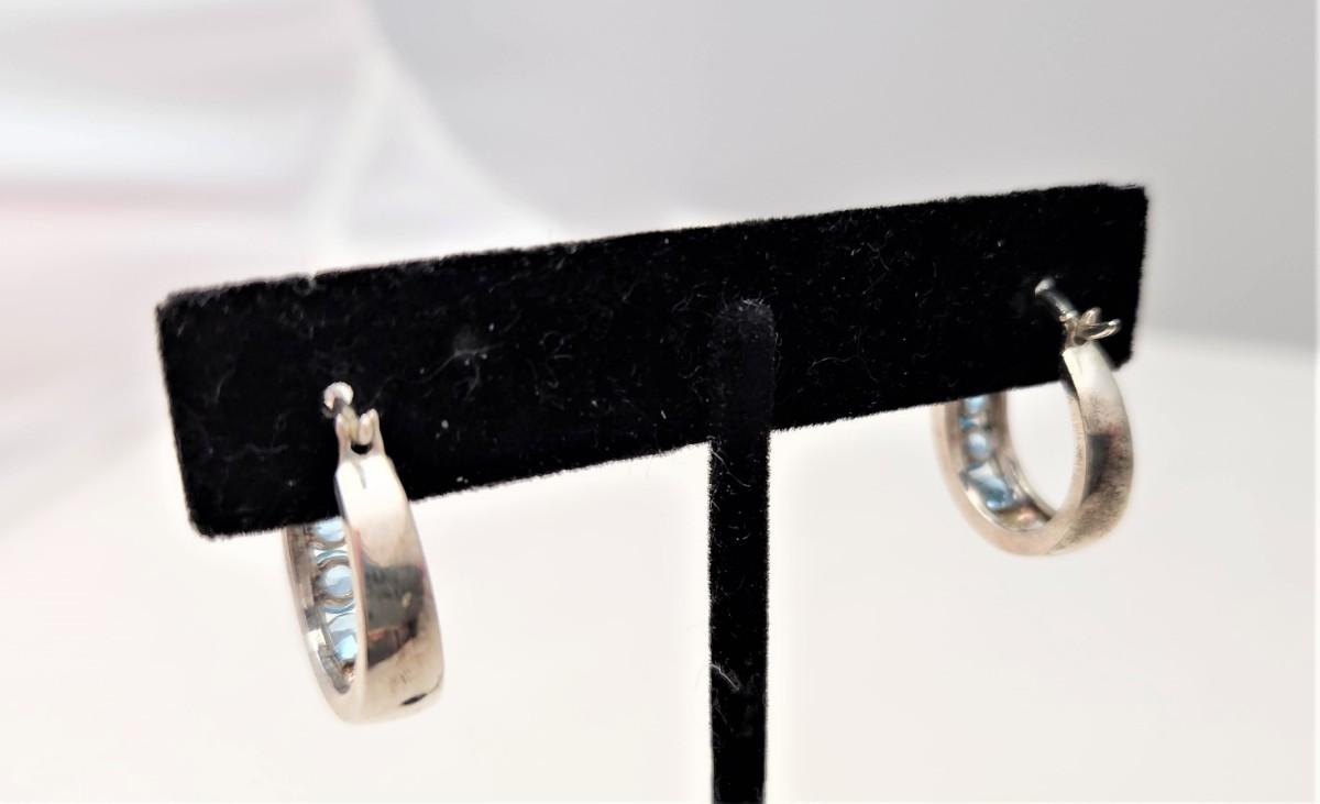 Cute pair of sterling silver pierced loop earrings, channel set with sky blue Topaz. Good condition. About 3/4" long.