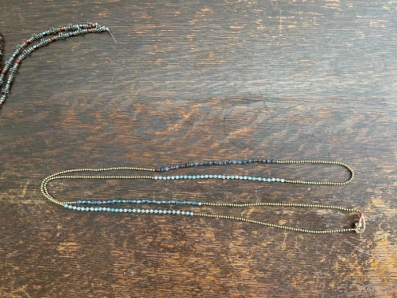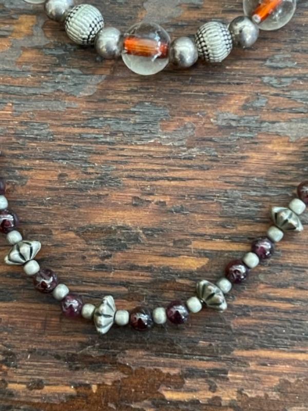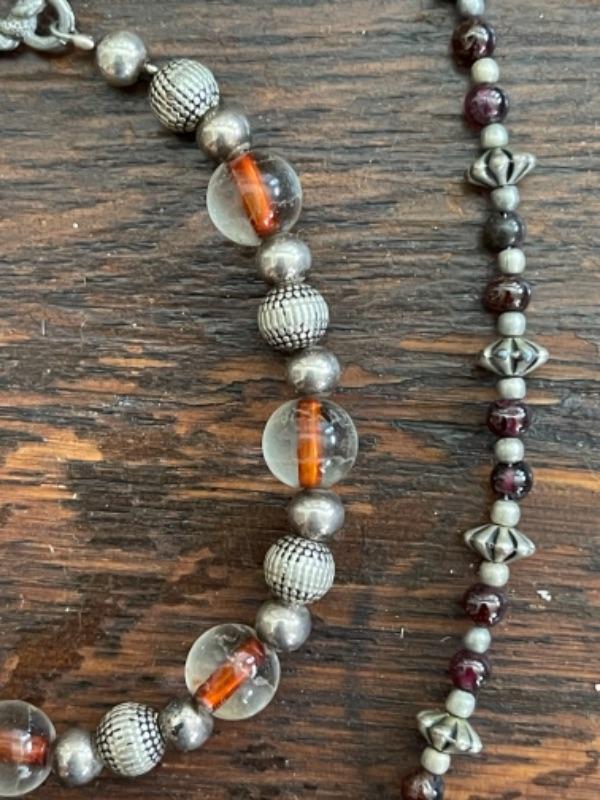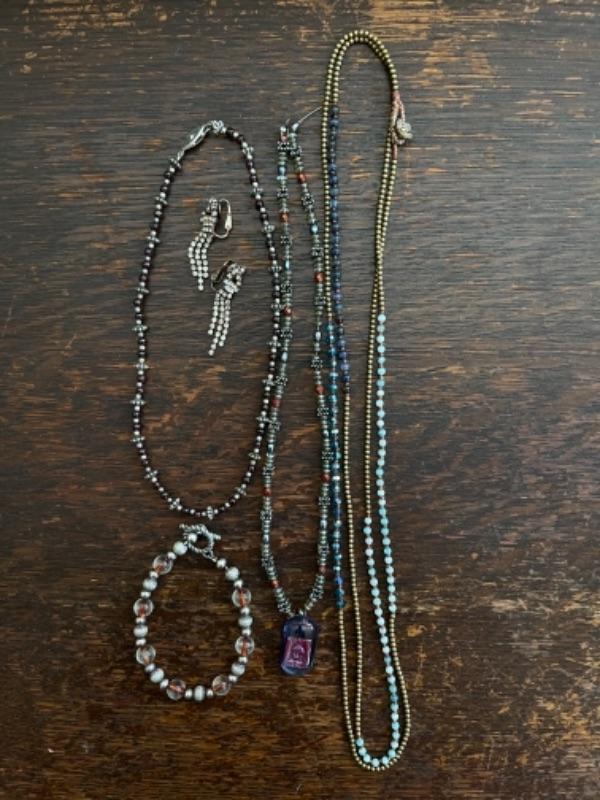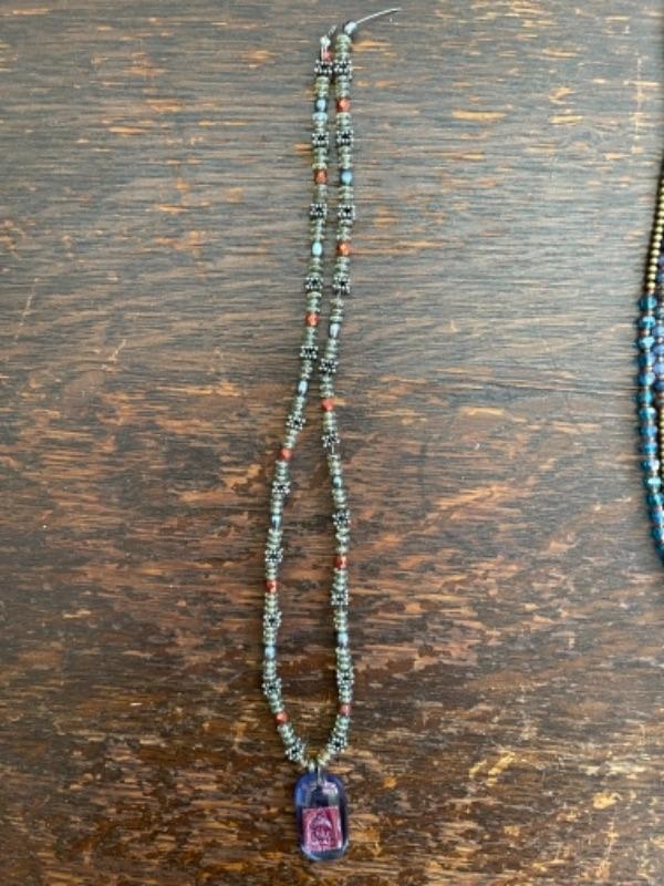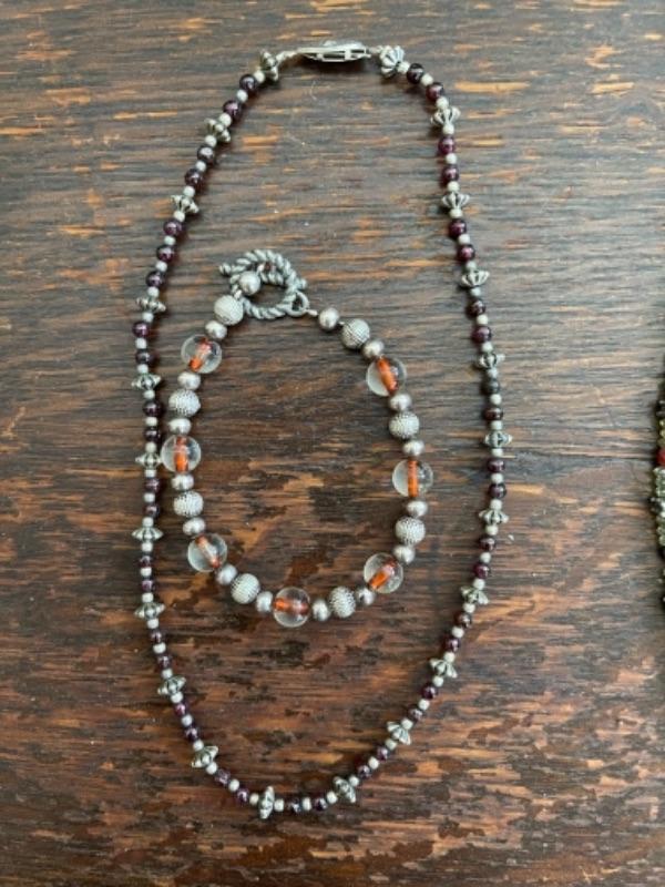 Lot 64LD. Assorted vintage jewelry“”three beaded necklaces, beaded bracelet, one pair of earrings, one long strand of metal and blue glass beads with flower and loop clasp, one clear glass and silver tone metal beads with fused glass pendant with Buddha (as is, no clasp); one silver tone and garnet glass beaded necklace, one clear glass beads with silver tone bead bracelet, one pair clip-on vintage rhinestone earrings--$35