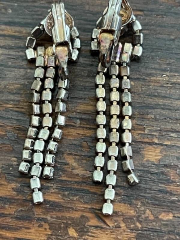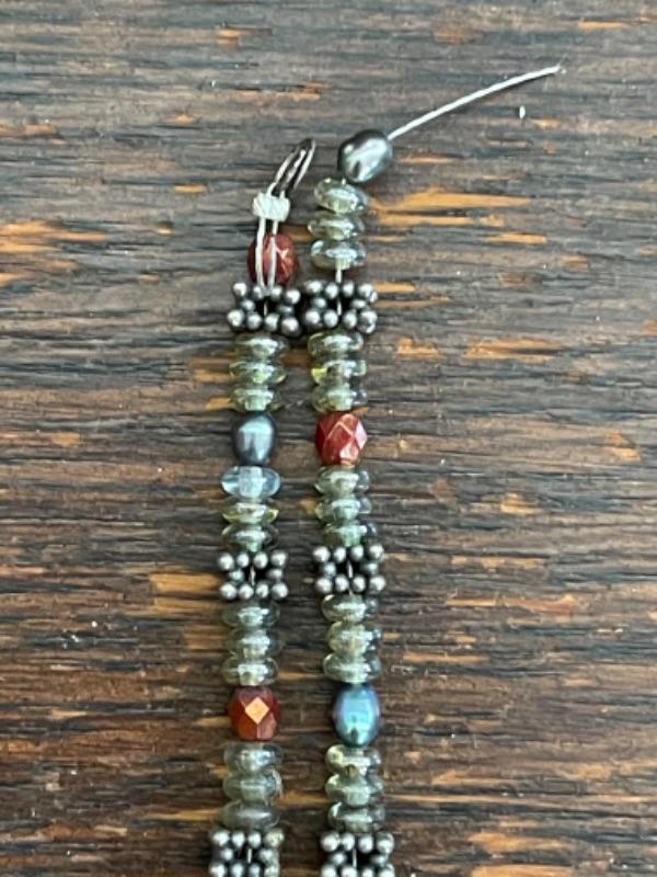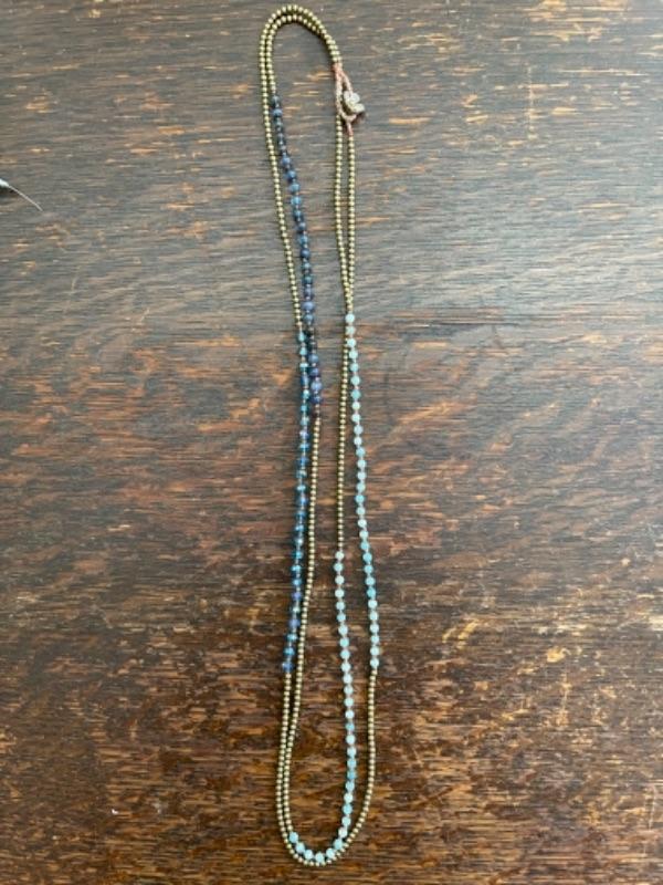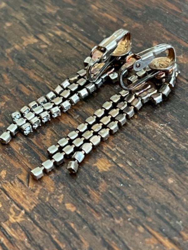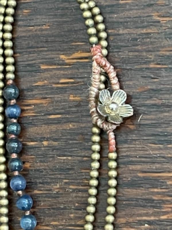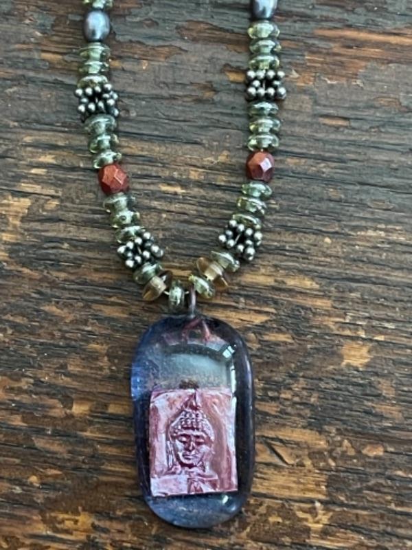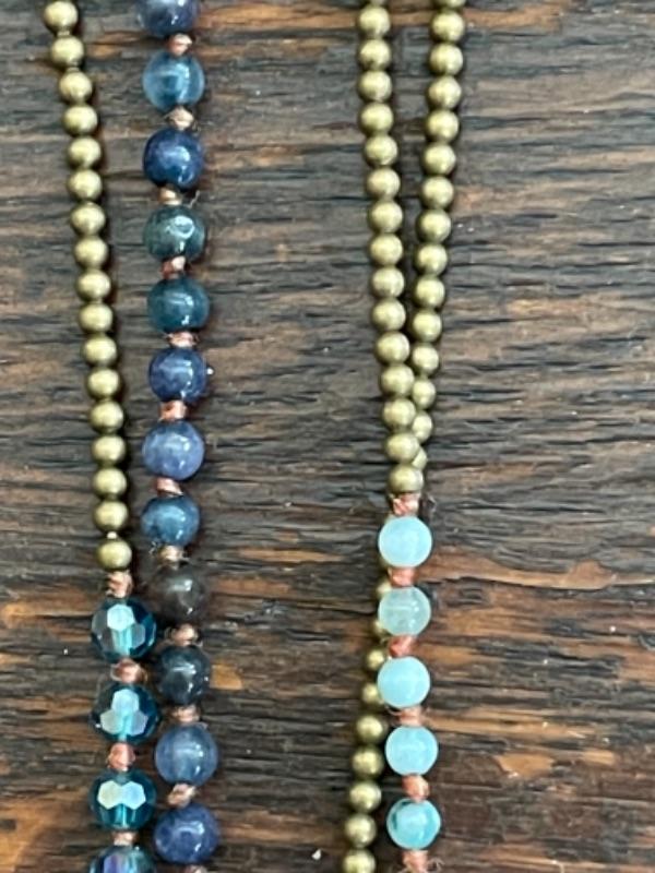 Lot 64LD. Assorted vintage jewelry“”three beaded necklaces, beaded bracelet, one pair of earrings, one long strand of metal and blue glass beads with flower and loop clasp, one clear glass and silver tone metal beads with fused glass pendant with Buddha (as is, no clasp); one silver tone and garnet glass beaded necklace, one clear glass beads with silver tone bead bracelet, one pair clip-on vintage rhinestone earrings--$35