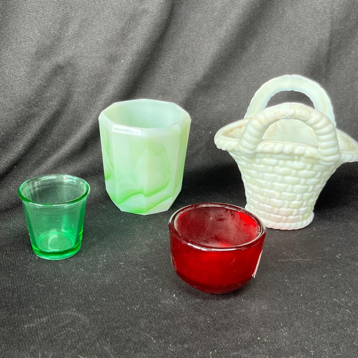 Cigarette jar, basket, votive & kids tumbler. All in good shape.