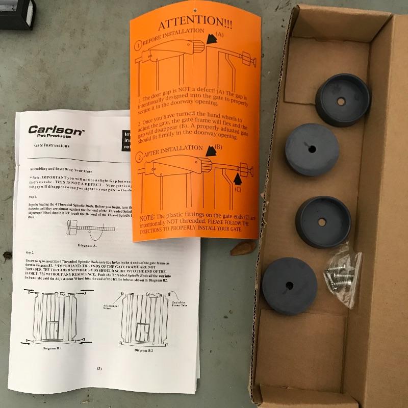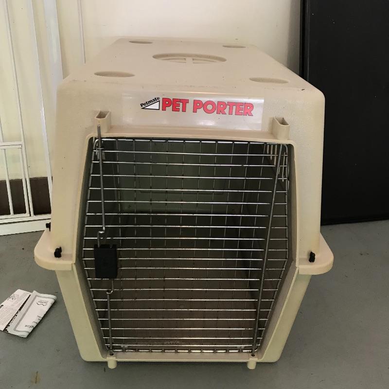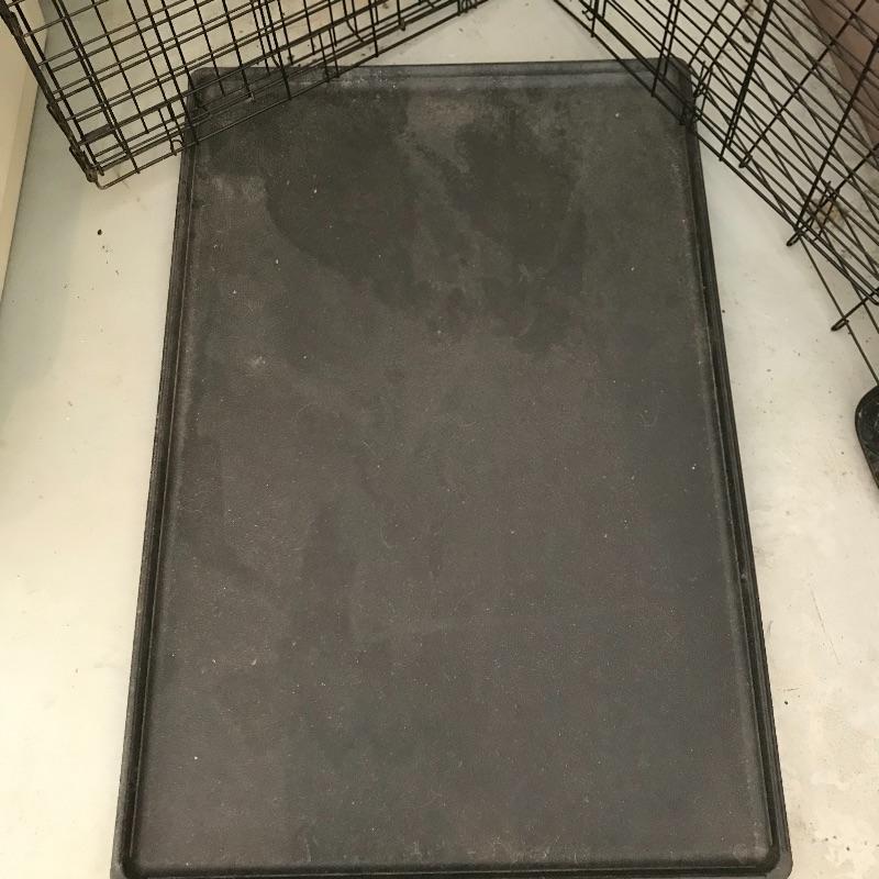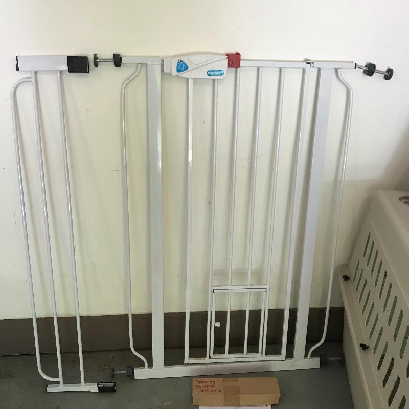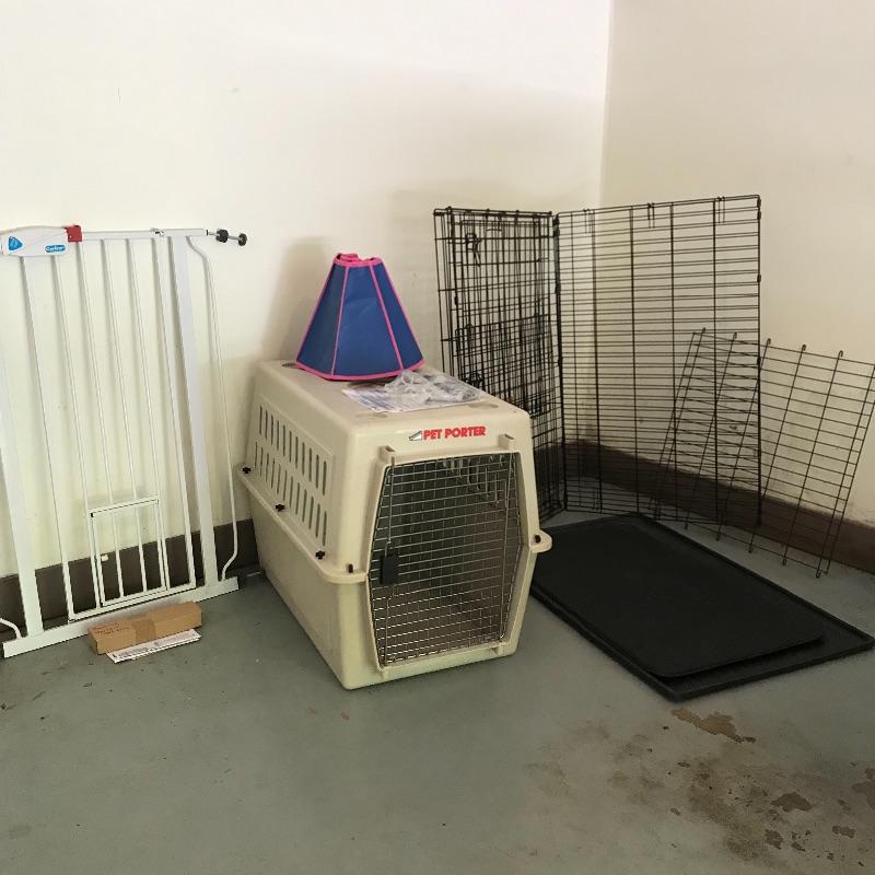 Extra tall Carlson white pet gate with cat door. Instructions included for easier installation. The gate currently does not lock as leaning against the wall, but would probably lock once installed. Lot also includes large iCrate with vinyl cushion. One panel measures 28” x 43” with the floor panel measuring 27.25” x 41”. iCrate also comes with some unused hardware and assembly instructions. The cushion shows some mildew and would need a light cleaning. The last crate is a Pet Porter and measures 24” x 36” x 26”. Both the Pet Porter and iCrate show rust through metal, but appear in sturdy and good condition. Lastly, while we hope you won’t need one, if your furry friend has to wear a cone of shame, at least make sure they’re stylish with this blue and pink Patterson recovery collar! See photos. No shipping.