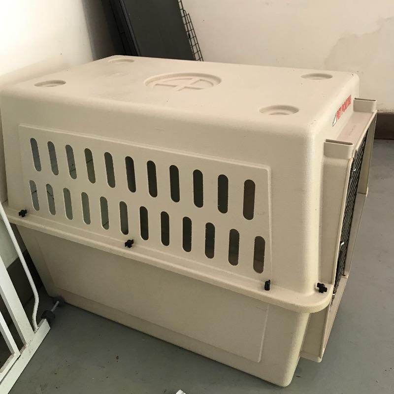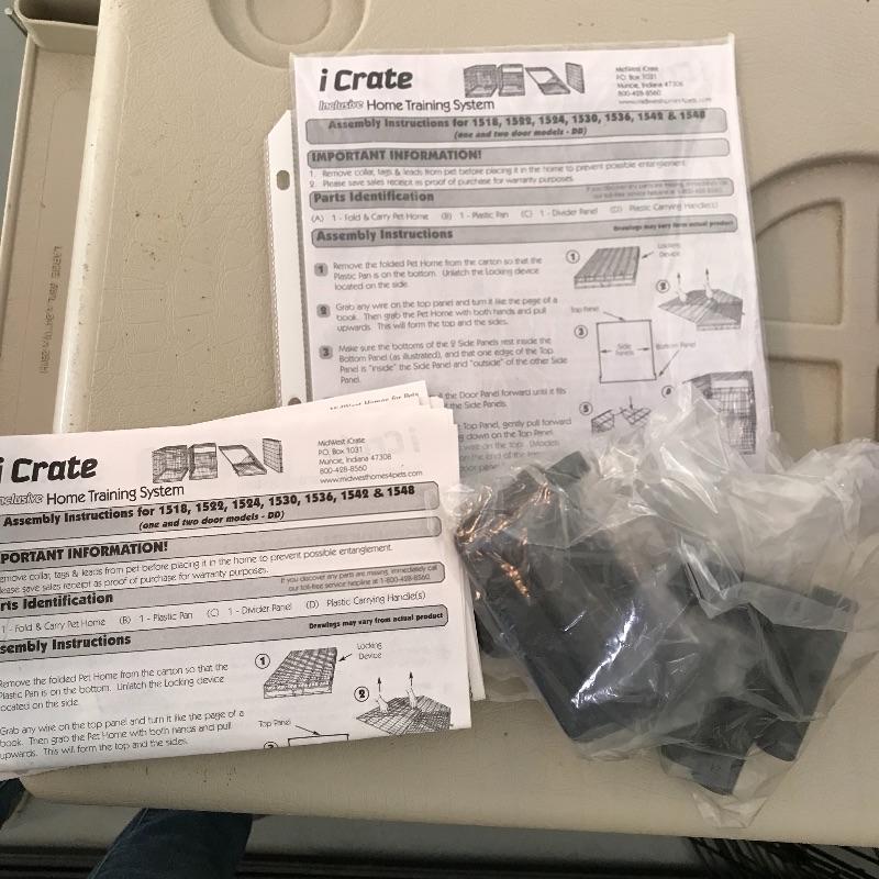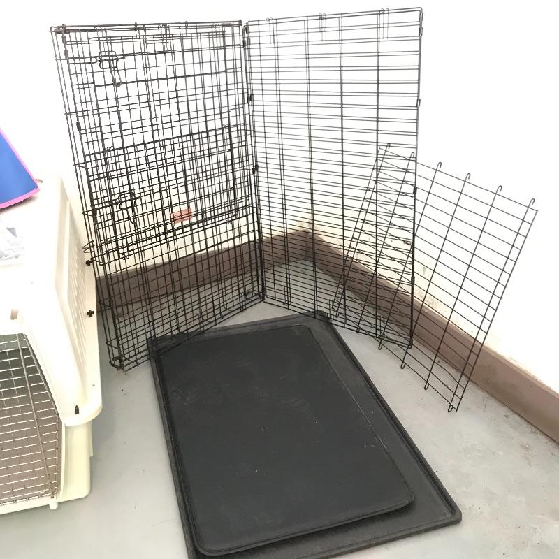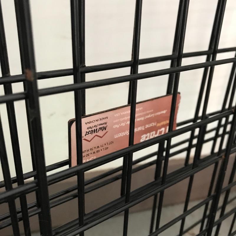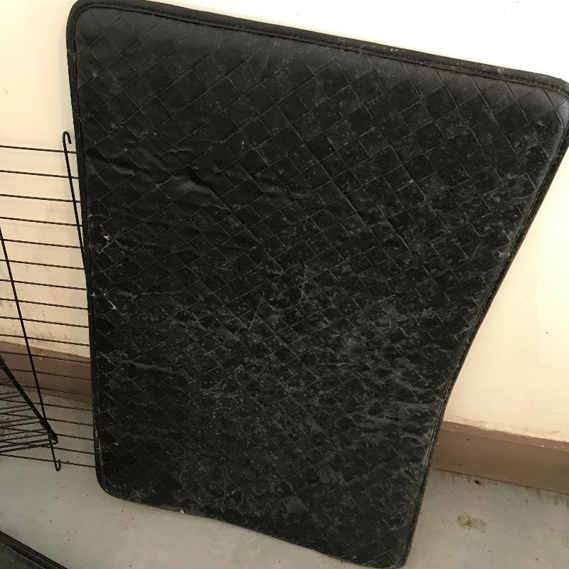 Extra tall Carlson white pet gate with cat door. Instructions included for easier installation. The gate currently does not lock as leaning against the wall, but would probably lock once installed. Lot also includes large iCrate with vinyl cushion. One panel measures 28” x 43” with the floor panel measuring 27.25” x 41”. iCrate also comes with some unused hardware and assembly instructions. The cushion shows some mildew and would need a light cleaning. The last crate is a Pet Porter and measures 24” x 36” x 26”. Both the Pet Porter and iCrate show rust through metal, but appear in sturdy and good condition. Lastly, while we hope you won’t need one, if your furry friend has to wear a cone of shame, at least make sure they’re stylish with this blue and pink Patterson recovery collar! See photos. No shipping.