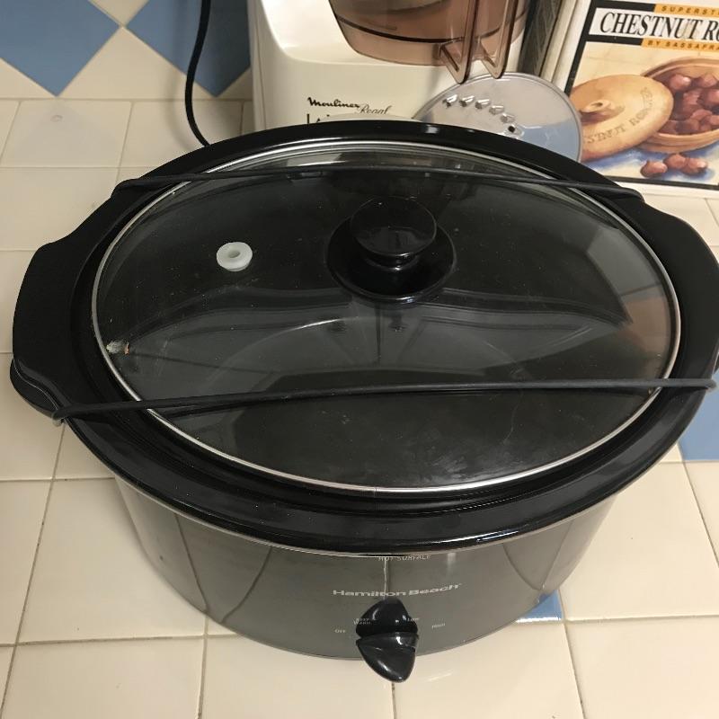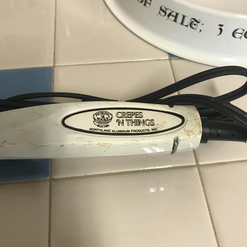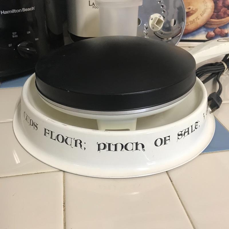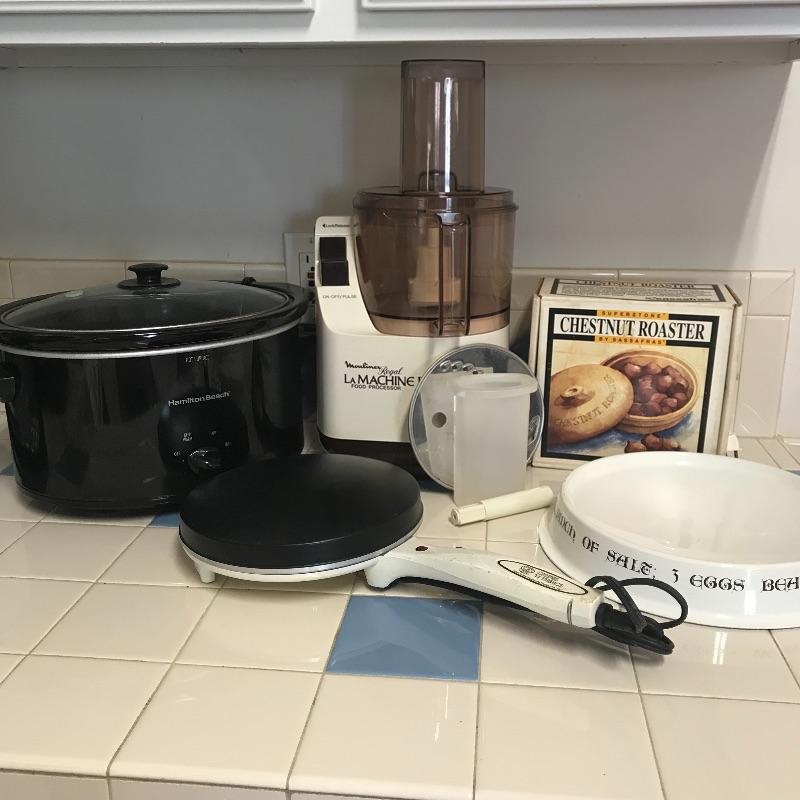 Great lot for your dining needs! First, Moulinex Regal La Machine II food processor with accessories and owner’s manual. Followed by a Hamilton Beach slow cooker with three temperature settings. We’ve also included an electric Crepe maker with a cute and unique metal bowl with the recipe you’ll need! Lastly just in time for cooler weather treats-a Superstone Chestnut Roaster by Sassafras! See photos. No shipping.