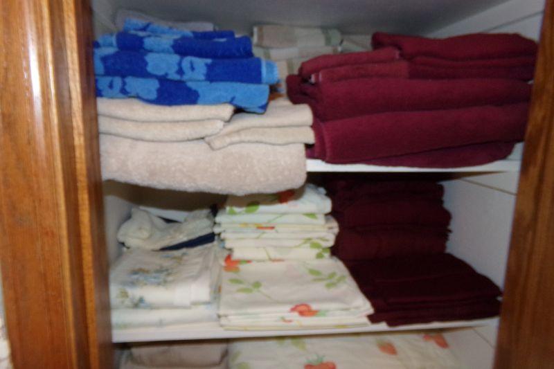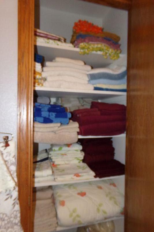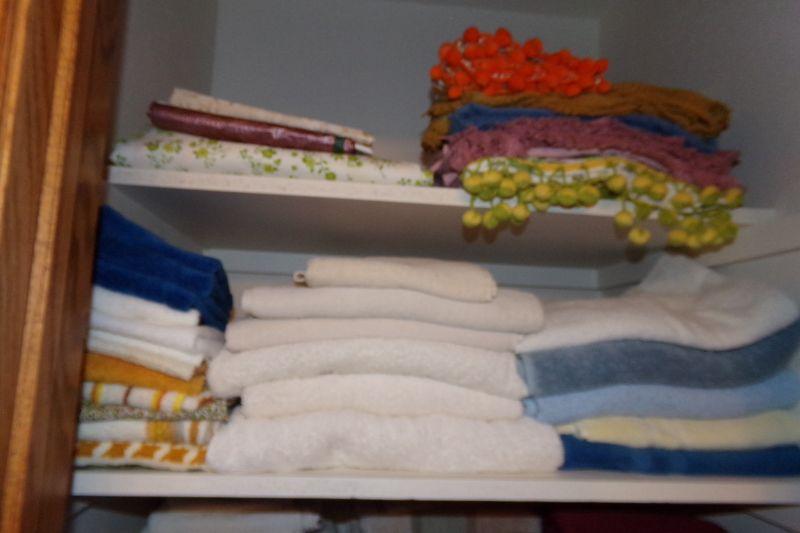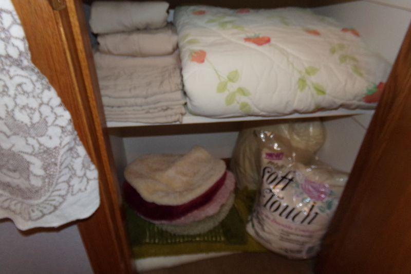 CLOSET FULL OF TOWELS, WASH CLOTHS, SHEETS, COMFORTER