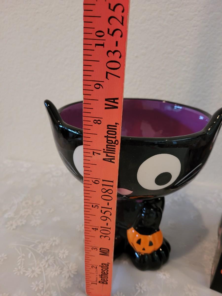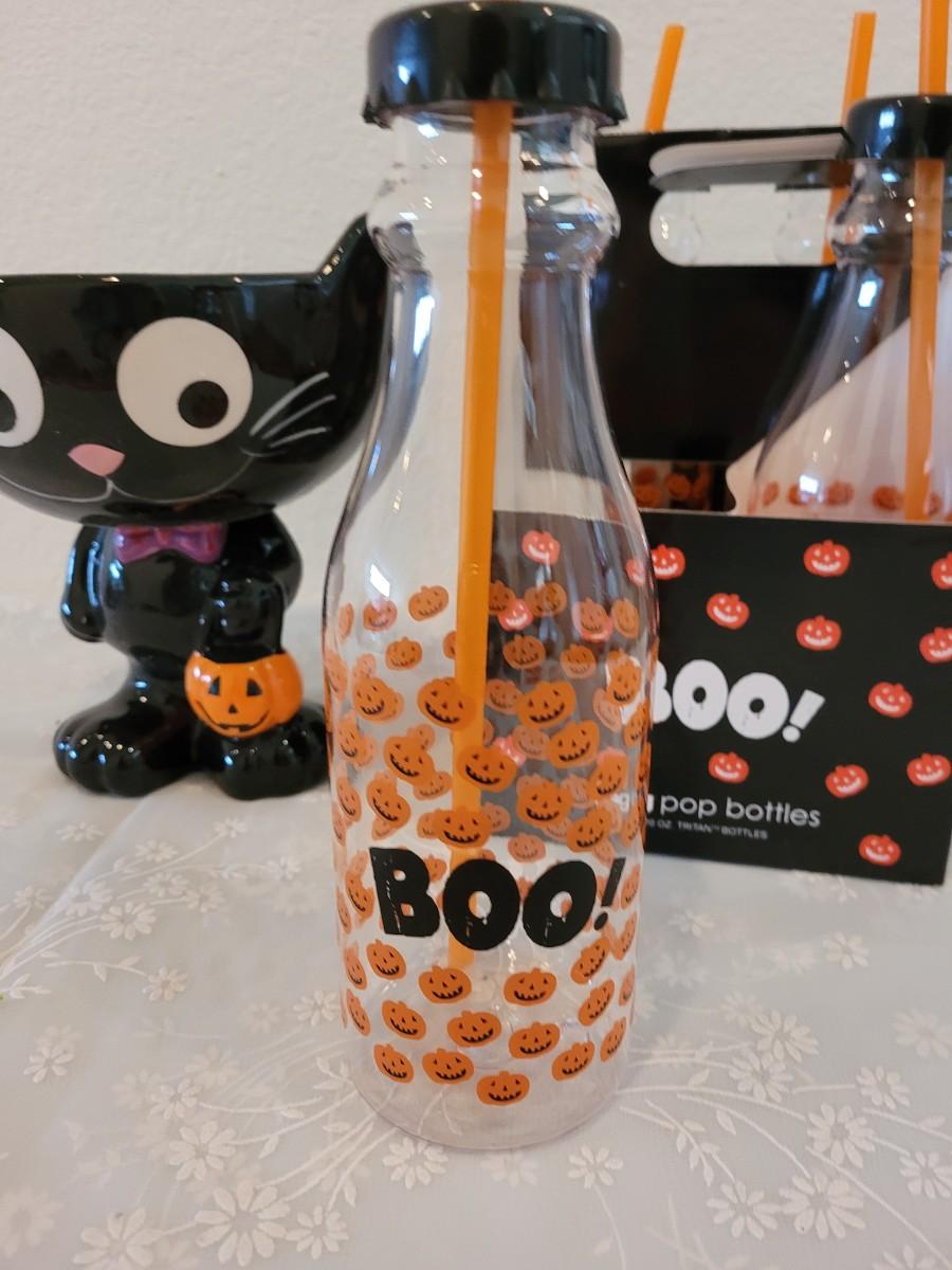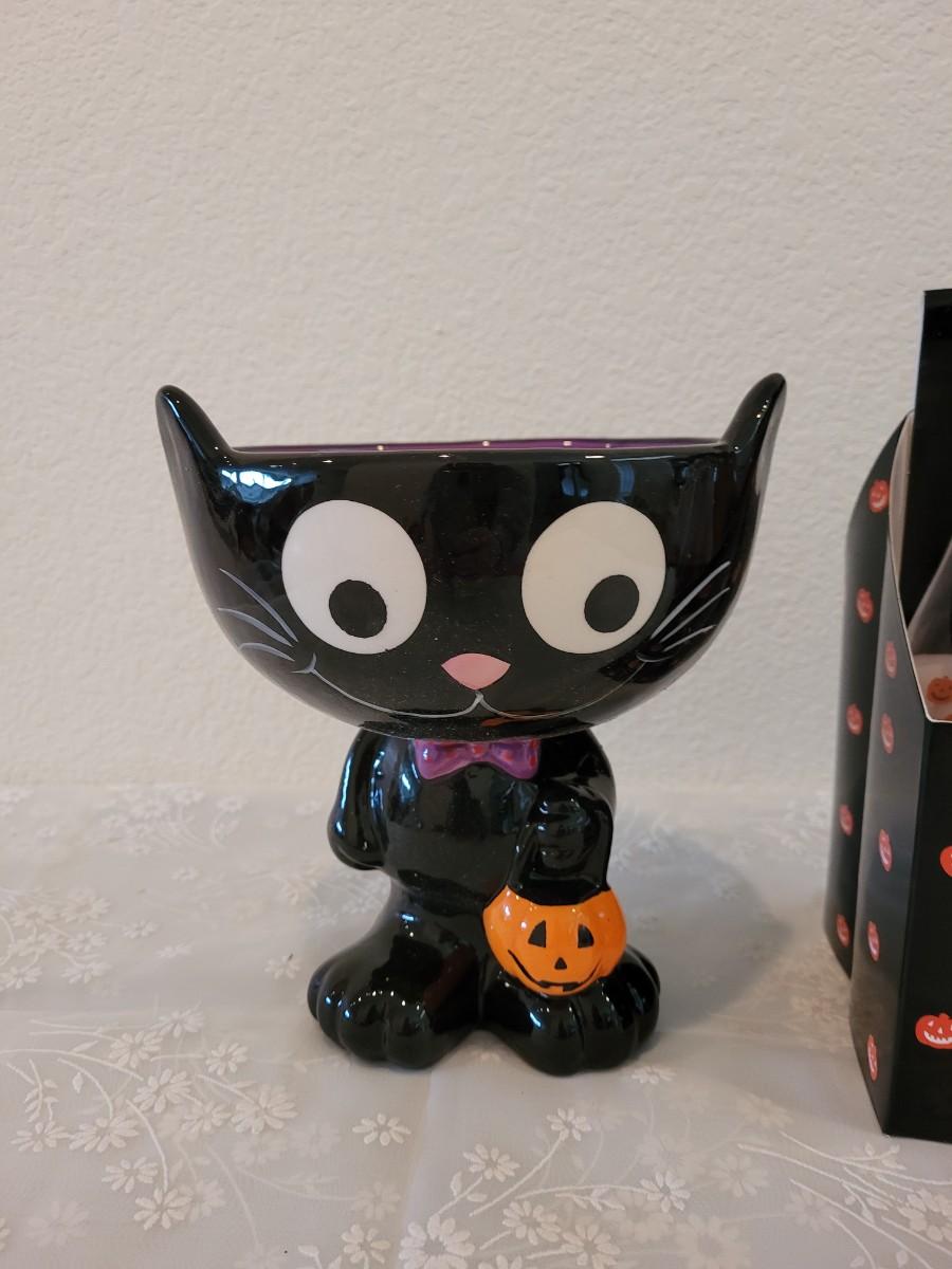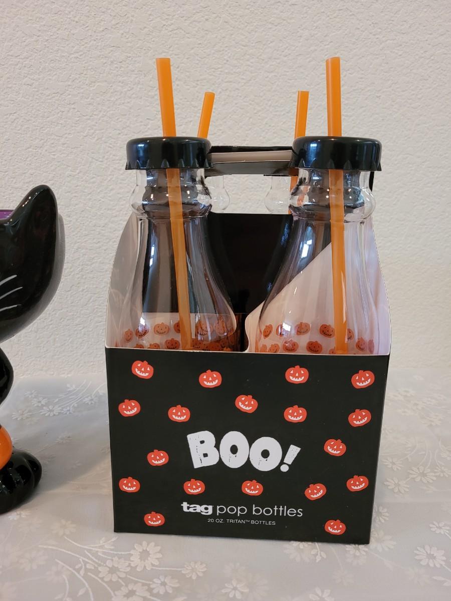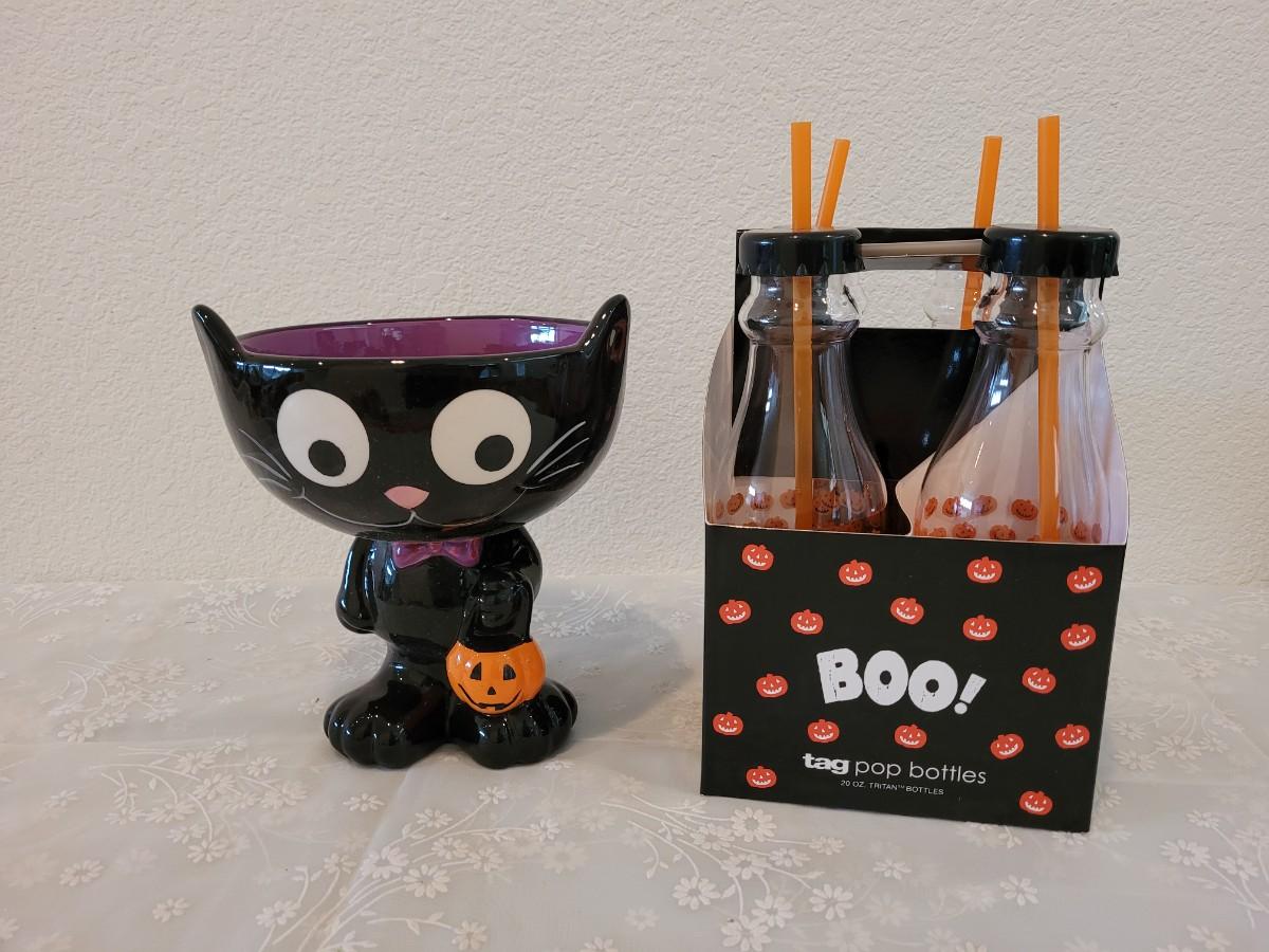 Lot 65: Halloween Plastic Pop Bottles and Black Cat Bowl