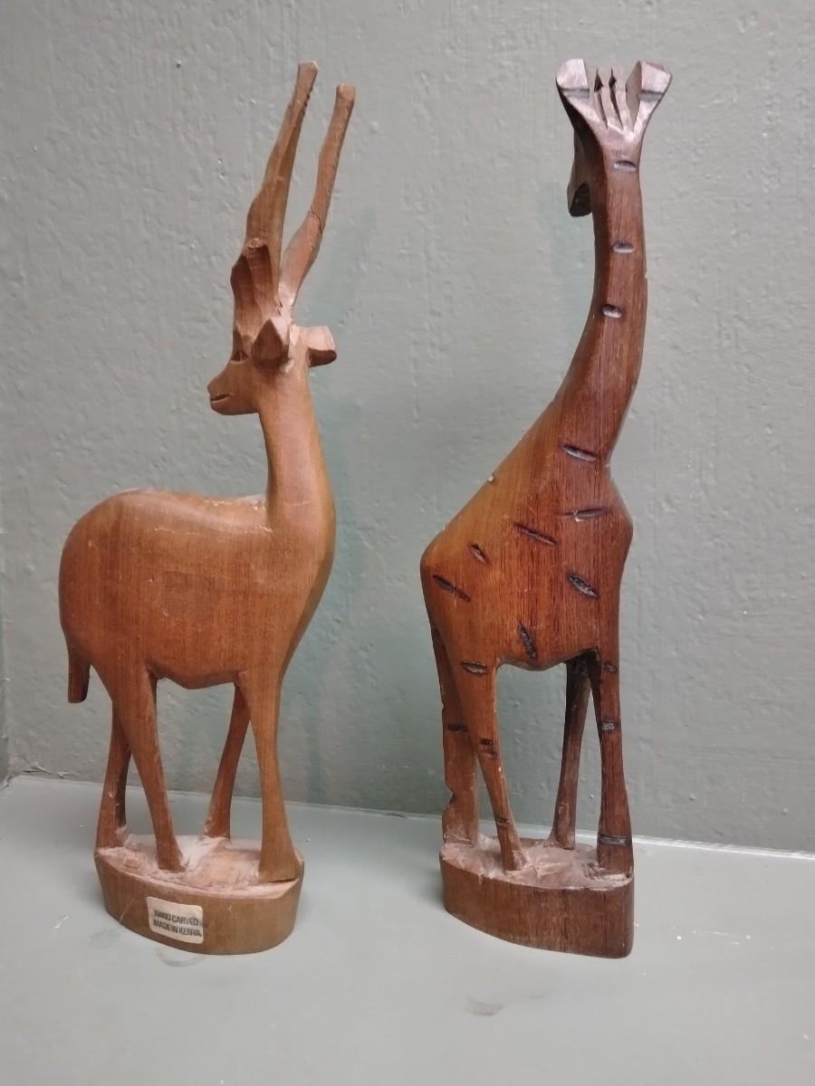 TWO WOODEN CARVED FIGURES, ONE BLACKBUCK LOOKING DEER, AND A GIRAFFE.