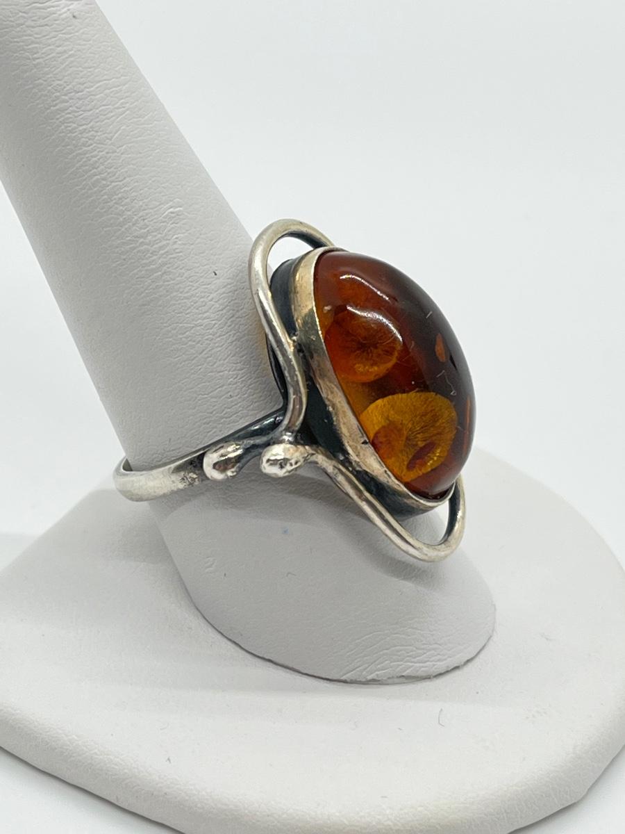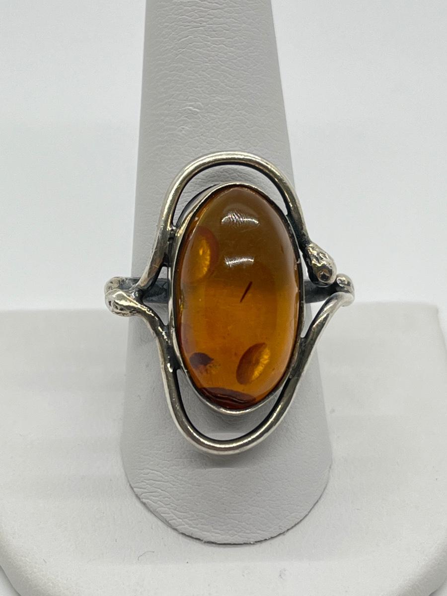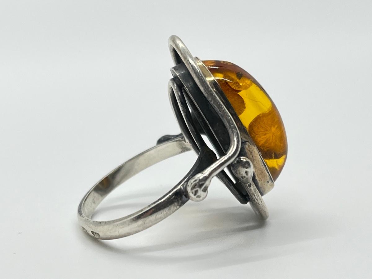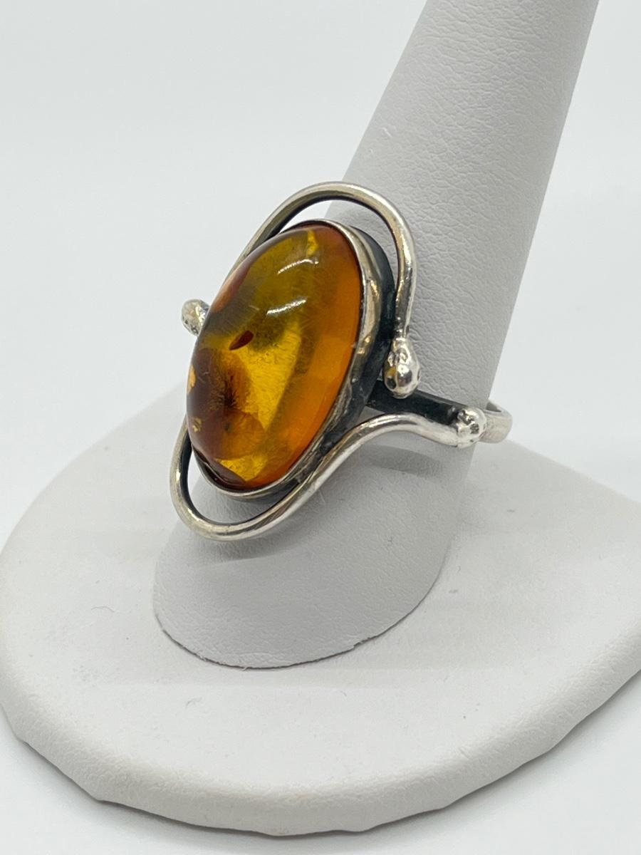 LOT 65: Sterling Silver and Amber Ring - Size 10