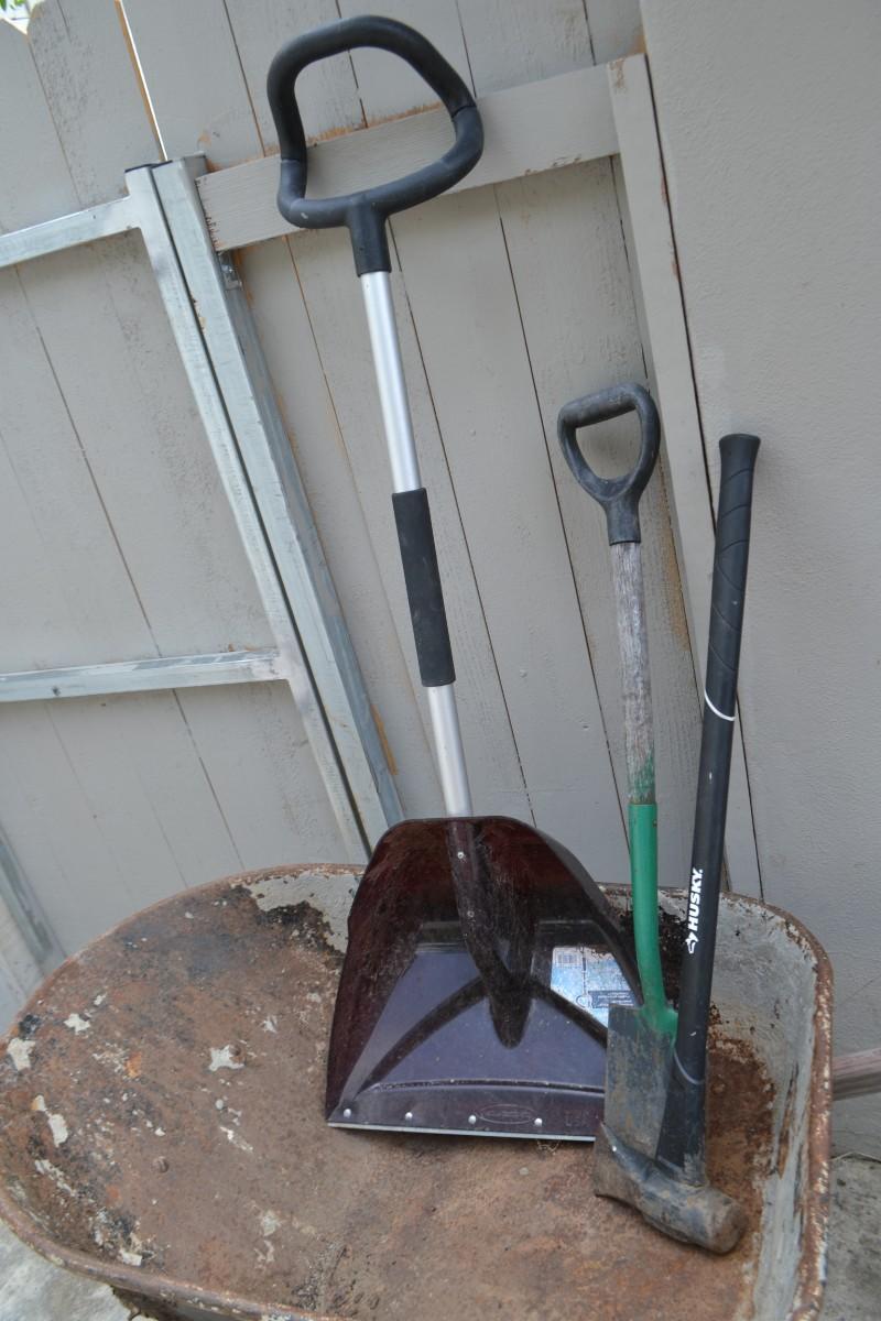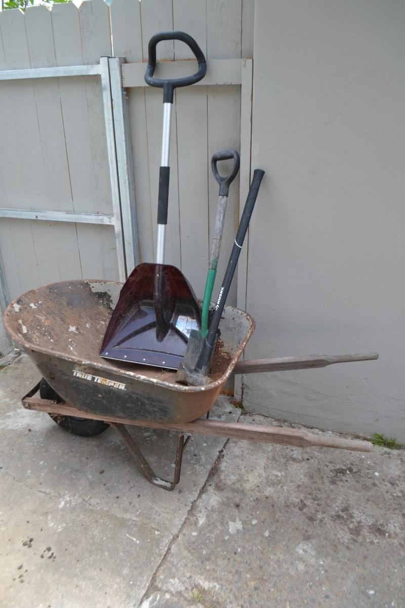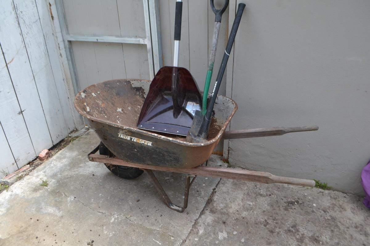 LOT 65  WHEEL BARROW AND YARD TOOLS