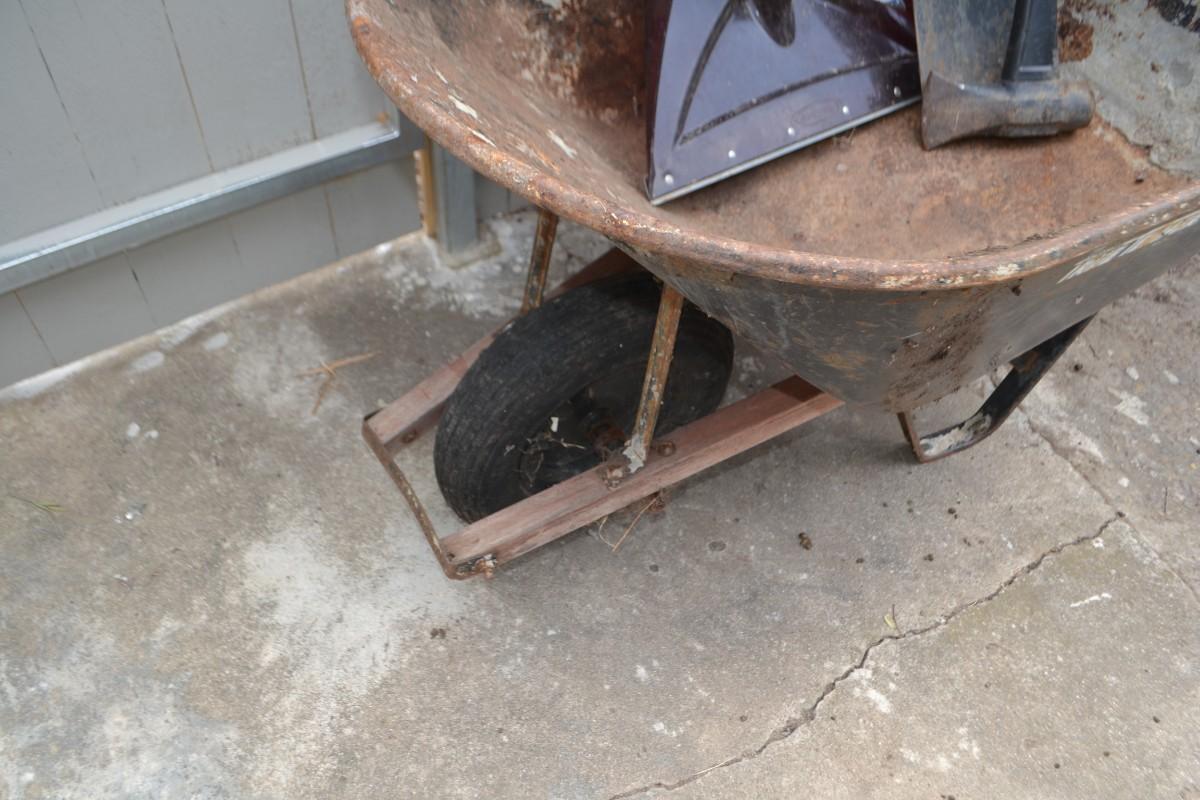 LOT 65. WHEEL BARROW AND YARD TOOLS