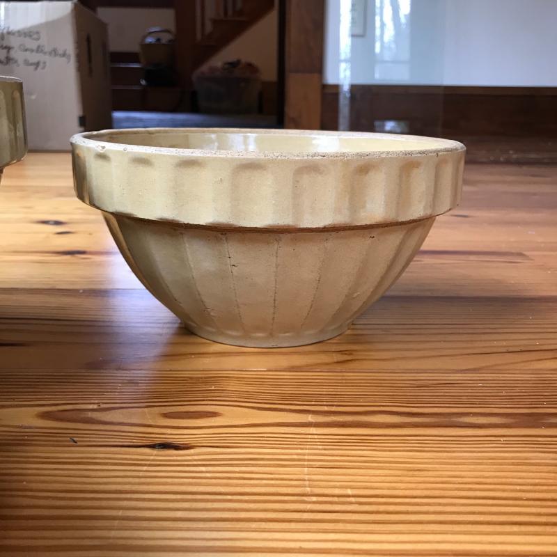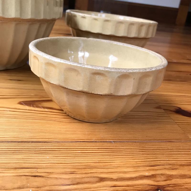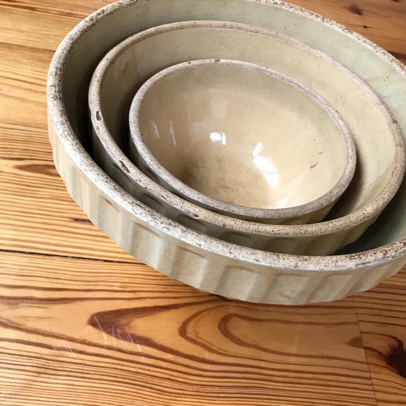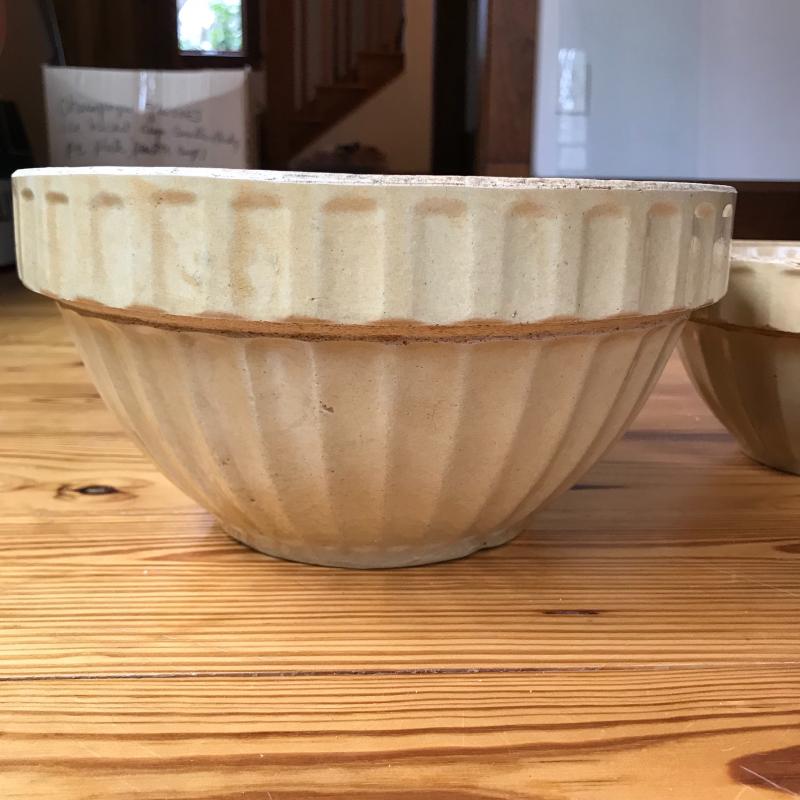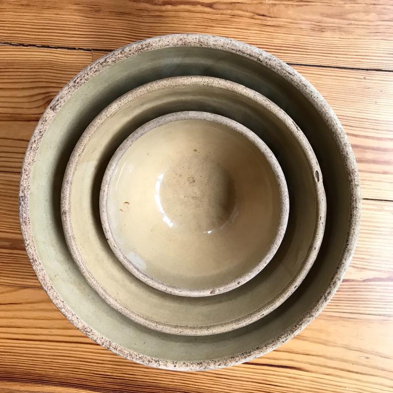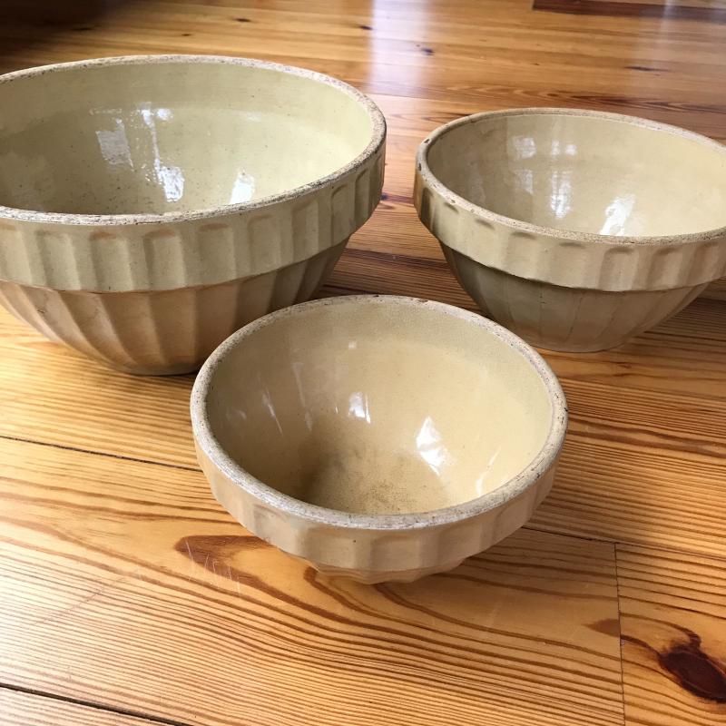 Set of three antique cream colored nesting mixing bowls. Markings on bottom read “6,” “8,” and “10”. Appear to be in great shape. Shipping available or local pickup in Asheville, NC.