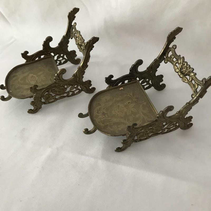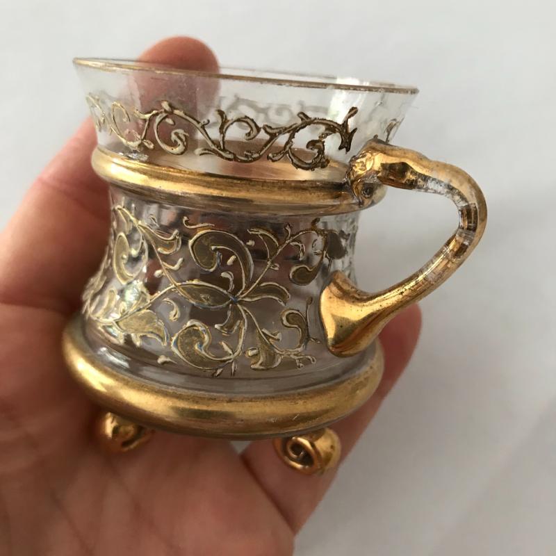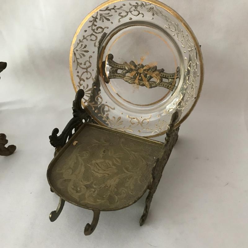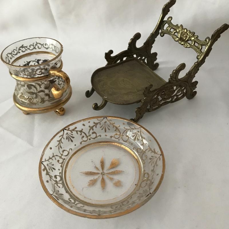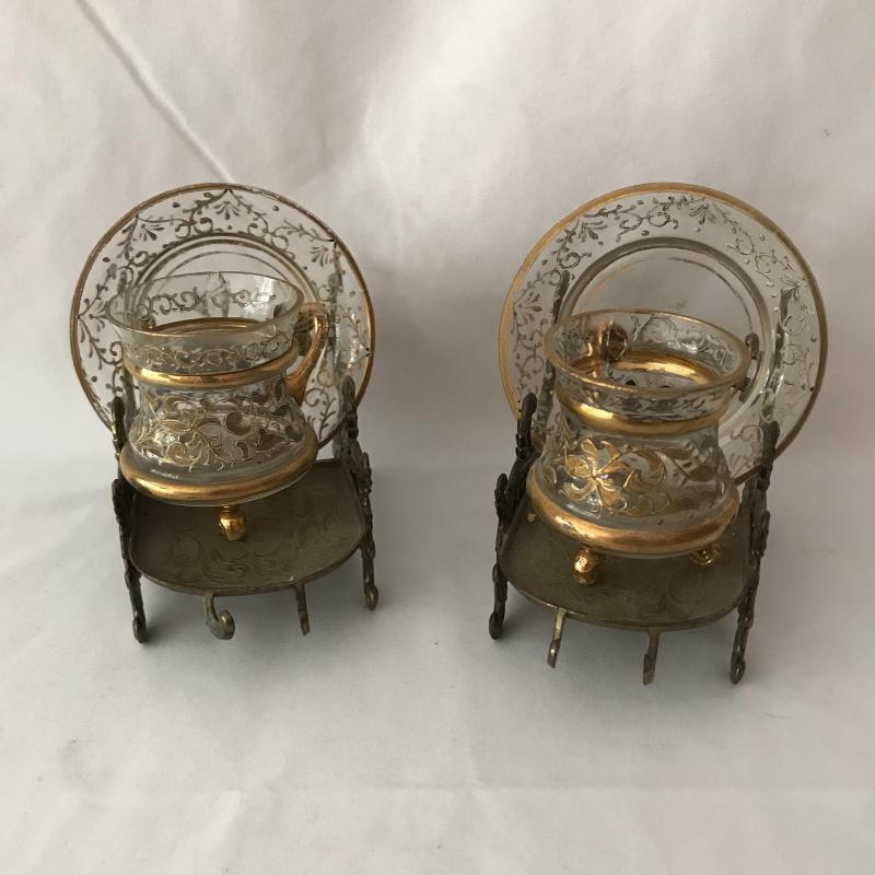 Unique antique cup and saucer sets with stands that look look sleds or benches. No markings. Crack in top of one teacup and some wear in the gold plating. Approx. 5” x 3.5 x 3.5” when displayed together. Shipping available or local pickup in Asheville, NC.