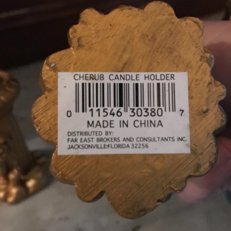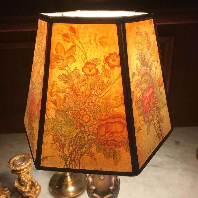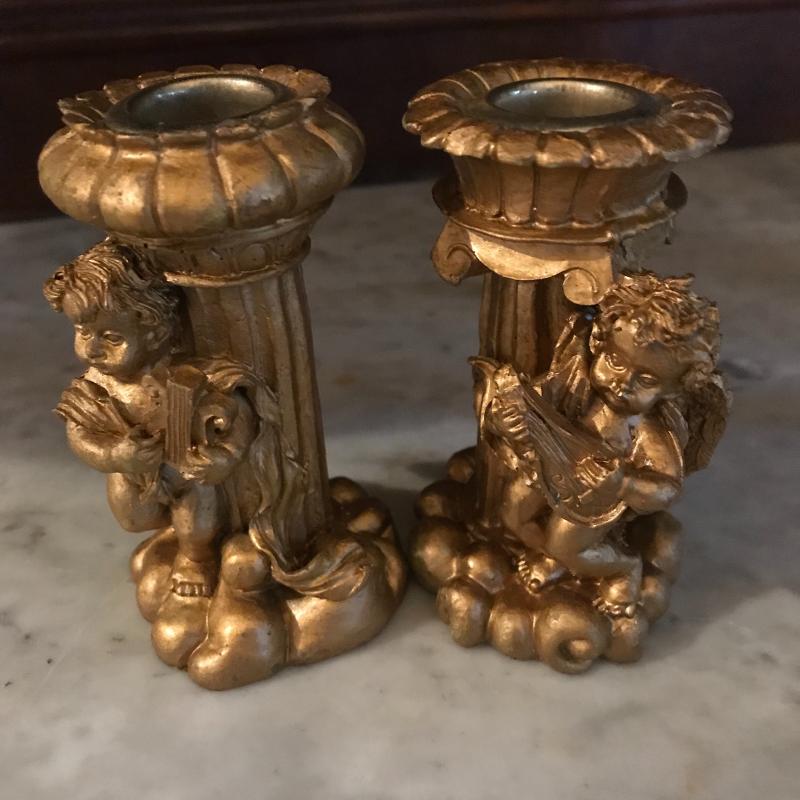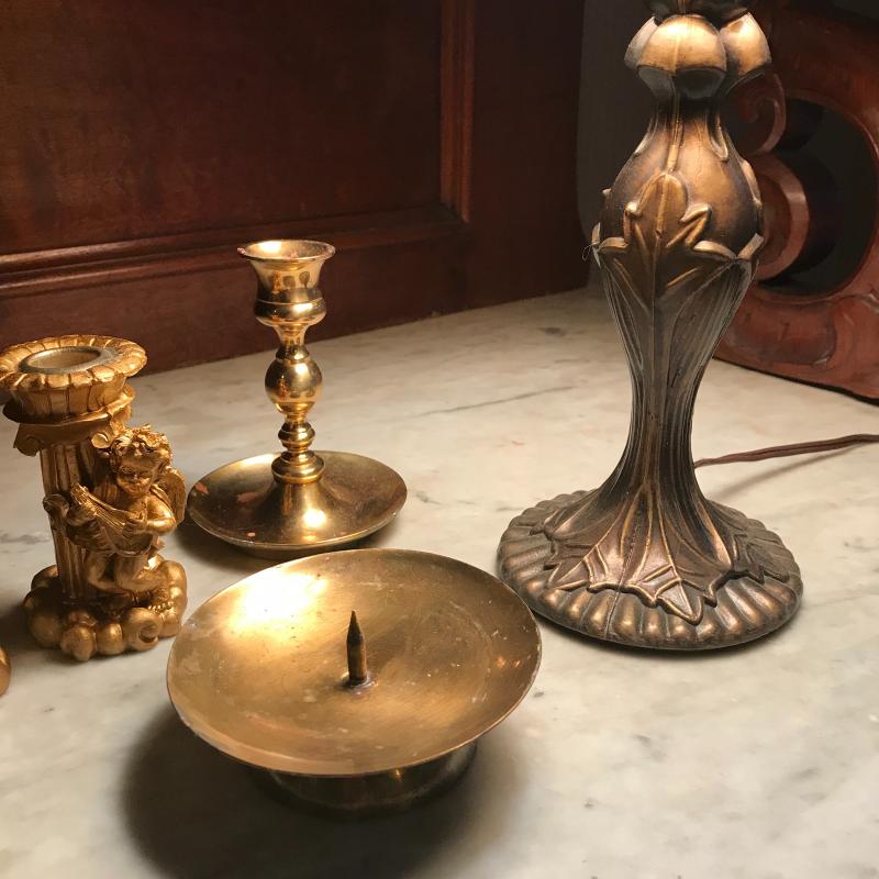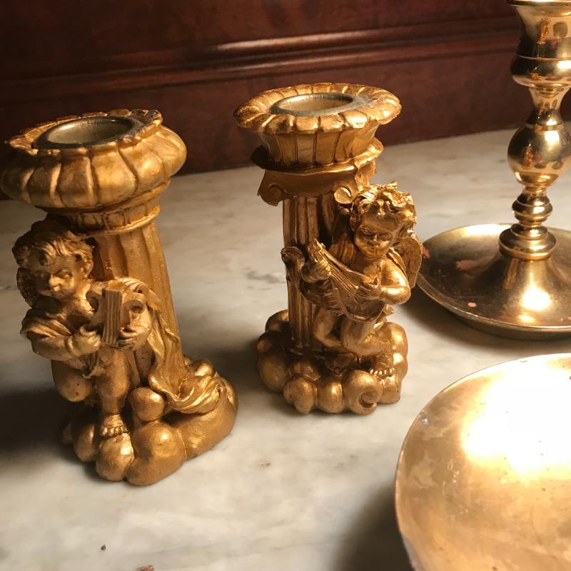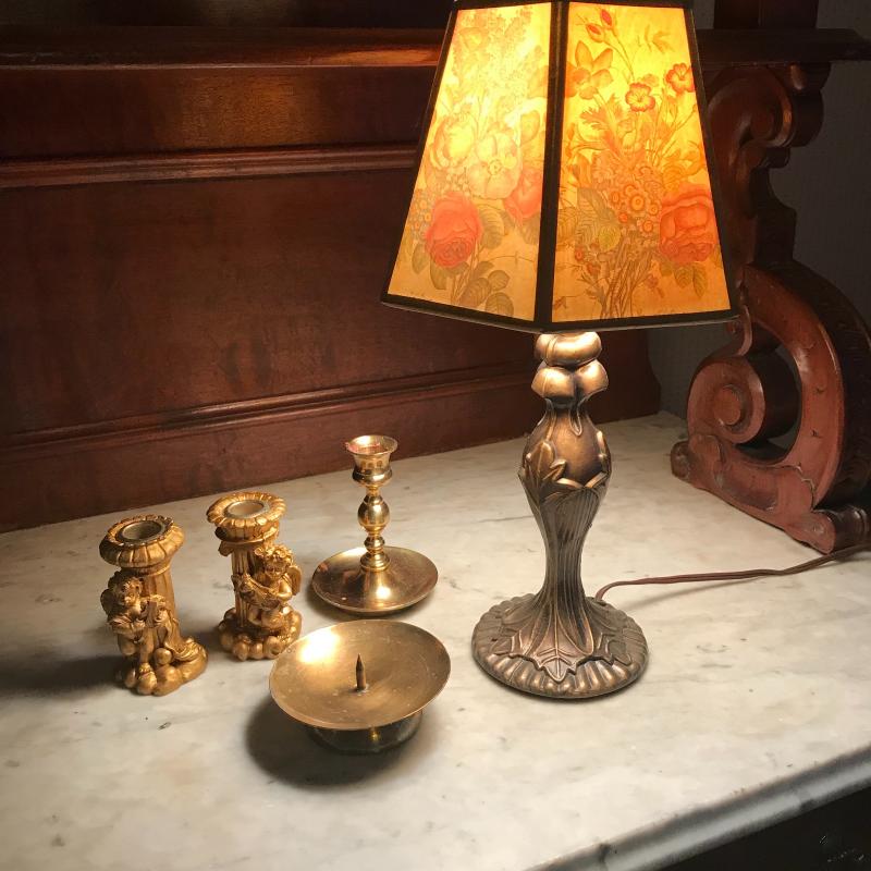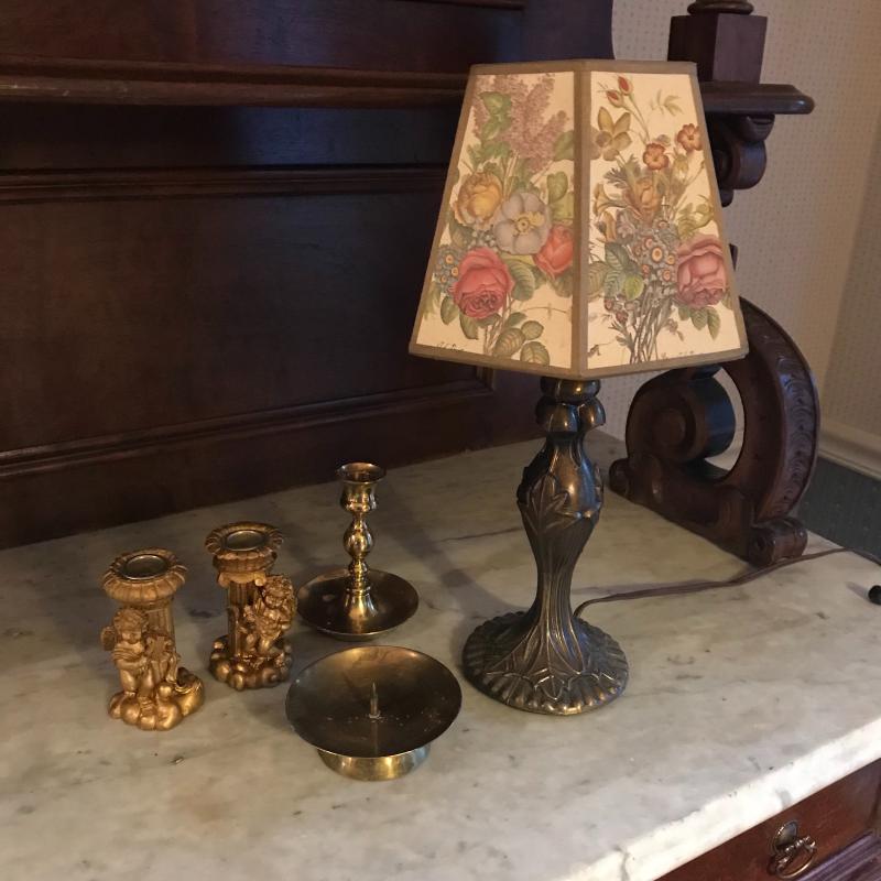 Brass lamp with pretty floral shade in good condition stands 15” tall. Lot also includes two brass candle holders that hold a pillar and a taper candle, and two small non-brass Cherub angle candle holders. This lot is available for shipping or local pick up in Flat Rock, NC.