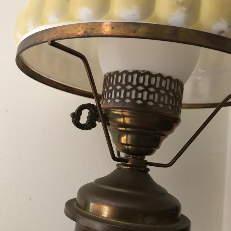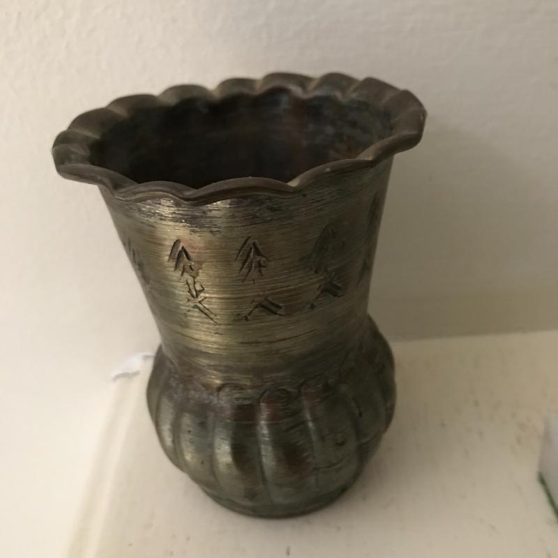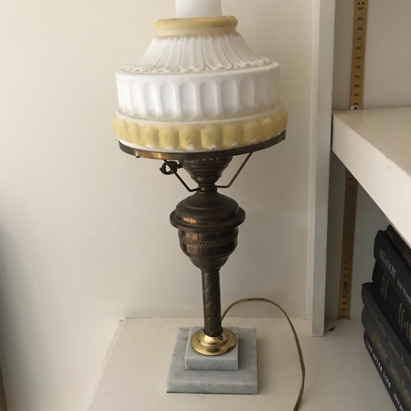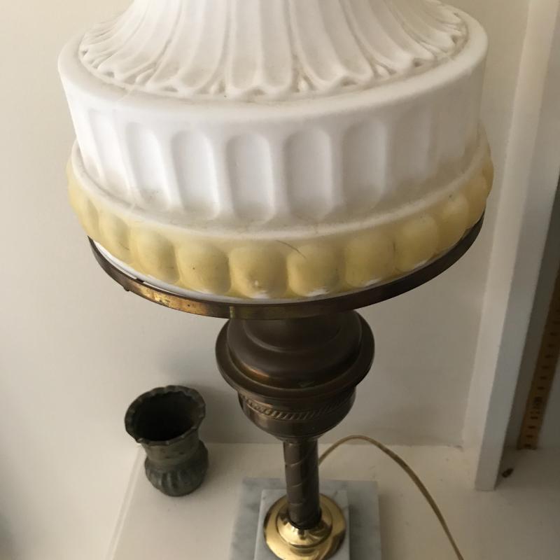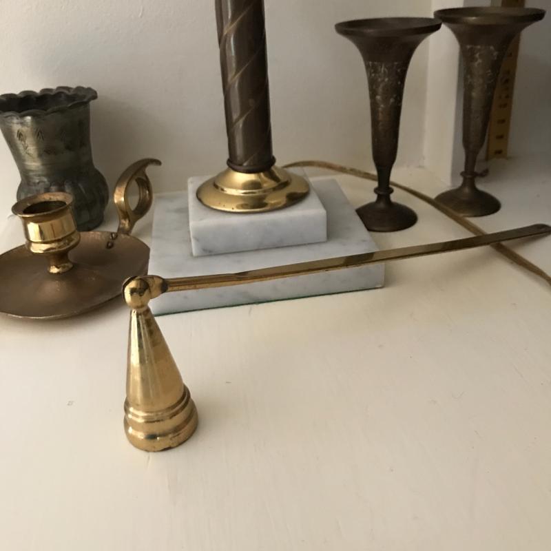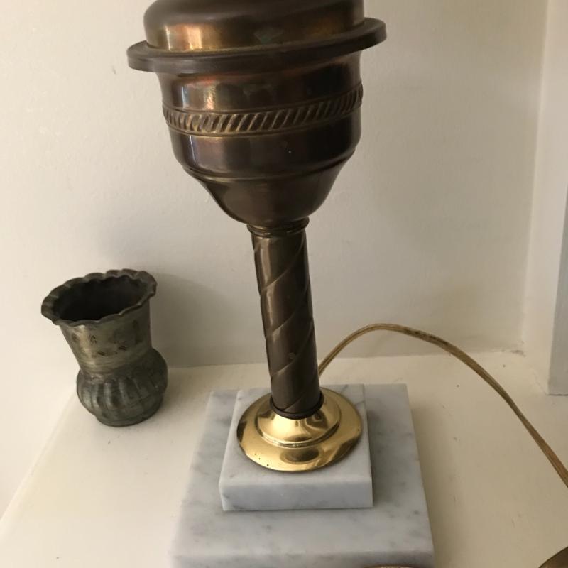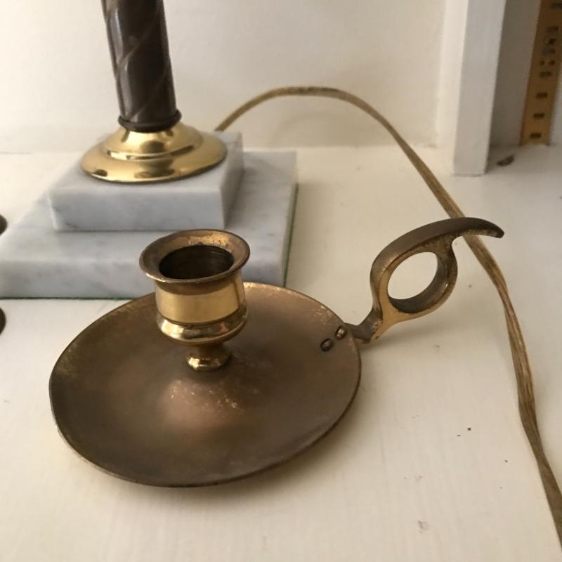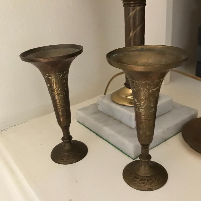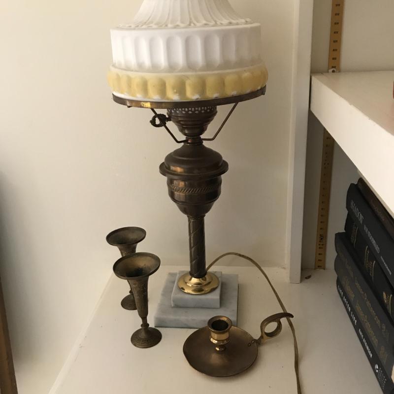 This lot includes a high shine low English candlestick holder and sniffer. Pair of small vases ( 5” tall) wider one at 3.5” tall and brass Aladdin lamp with marble base. Lamp stands 23” tall to top of chimney. This lot is available for shipping or local pick up in Asheville, NC