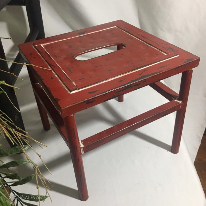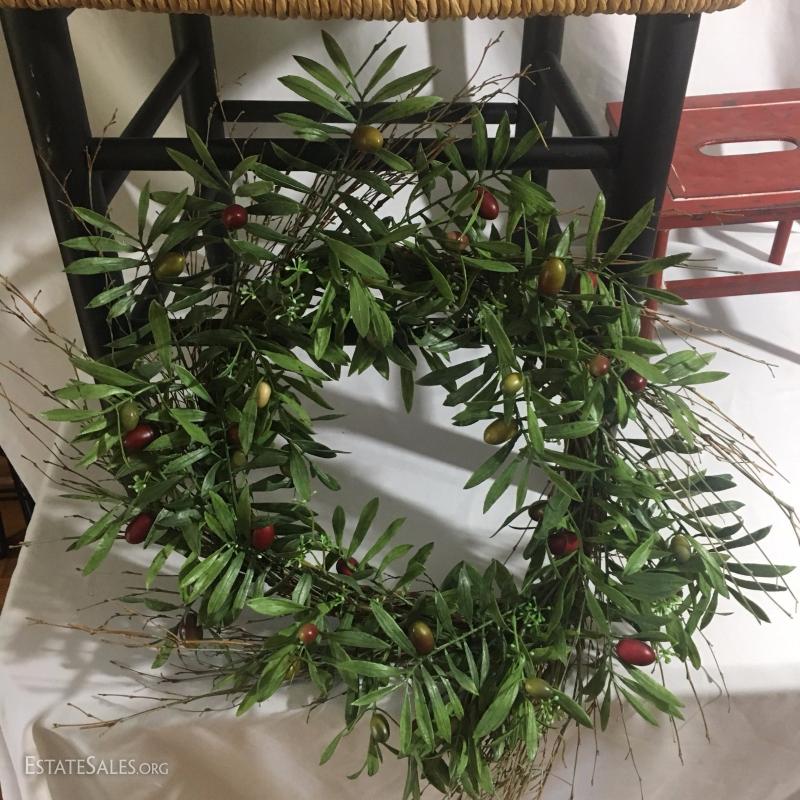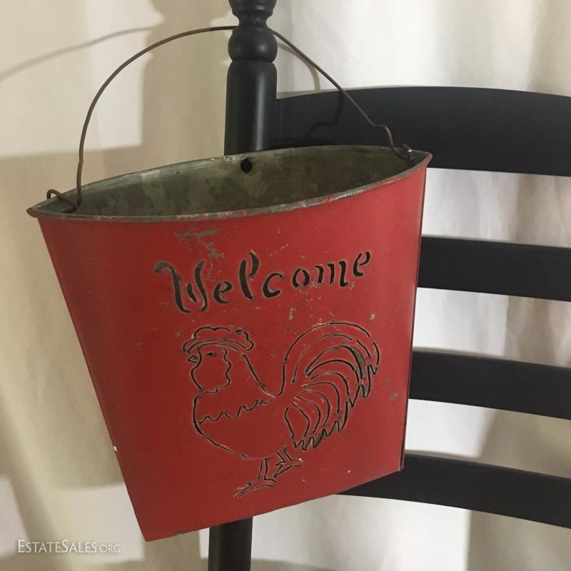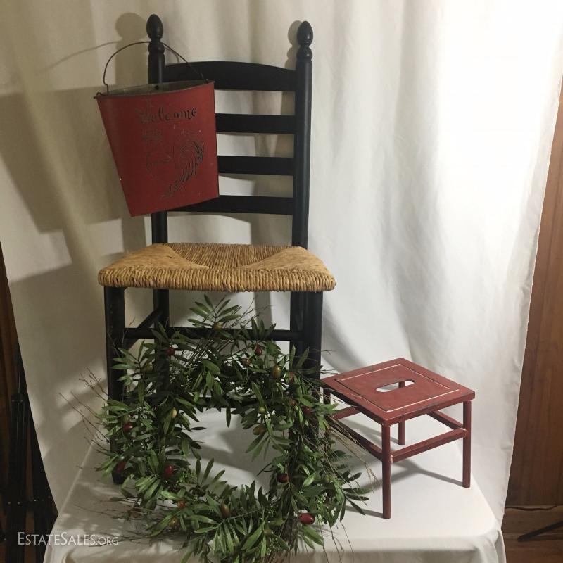 Black painted chair (19"l x 16"w x 39.5"h) Wreath is 24" diameter. Red Metal Stool is 9.5" l x 9.5" w x 8.5 h. Metal wall hanging flower holder. 11.5" tall without handle.