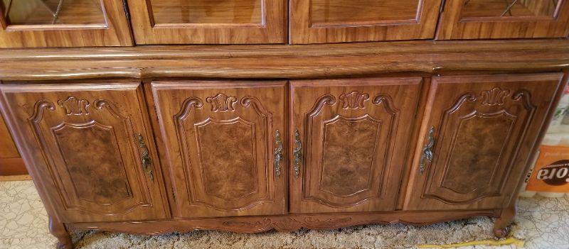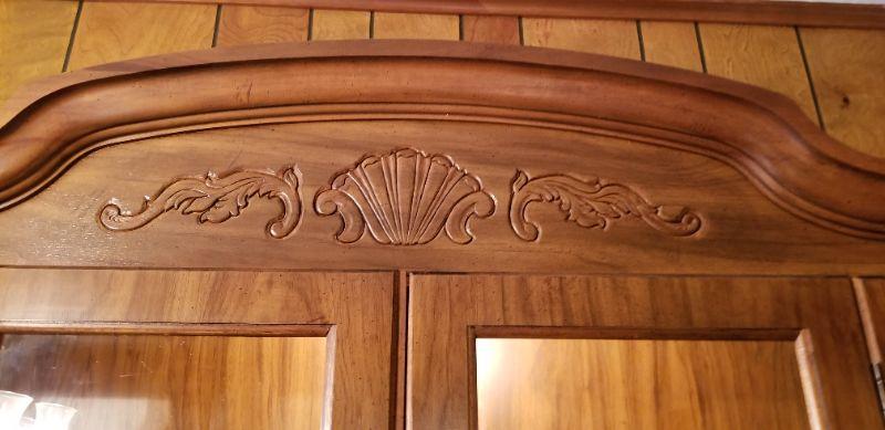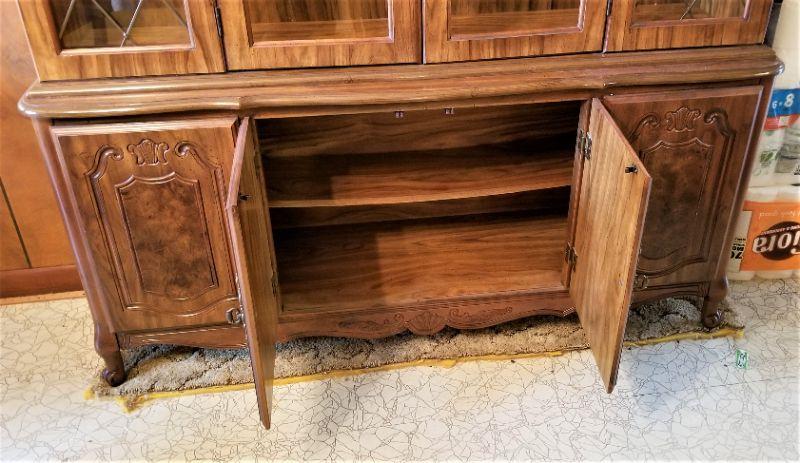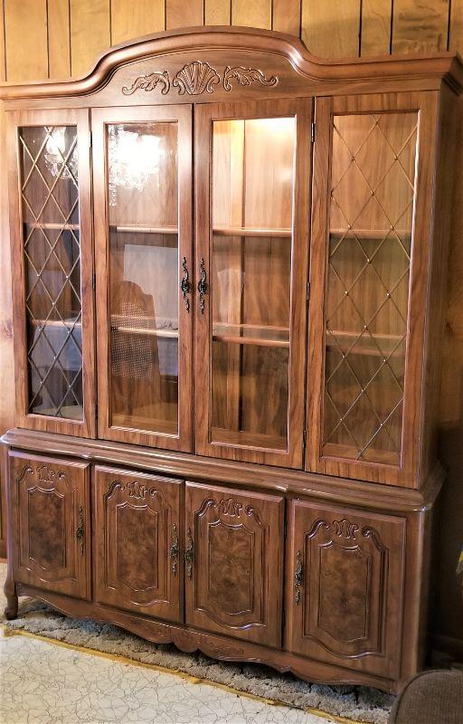 Classic lighted china cabinet - breaks down into two pieces - lots of storage here - good, clean condition. Glass doors and shelves - shelves lift out for travel. Good bit of storage underneath. 5 feet across, 80" tall, 16" deep. A few rubbed spots near the door handles (see photo).
