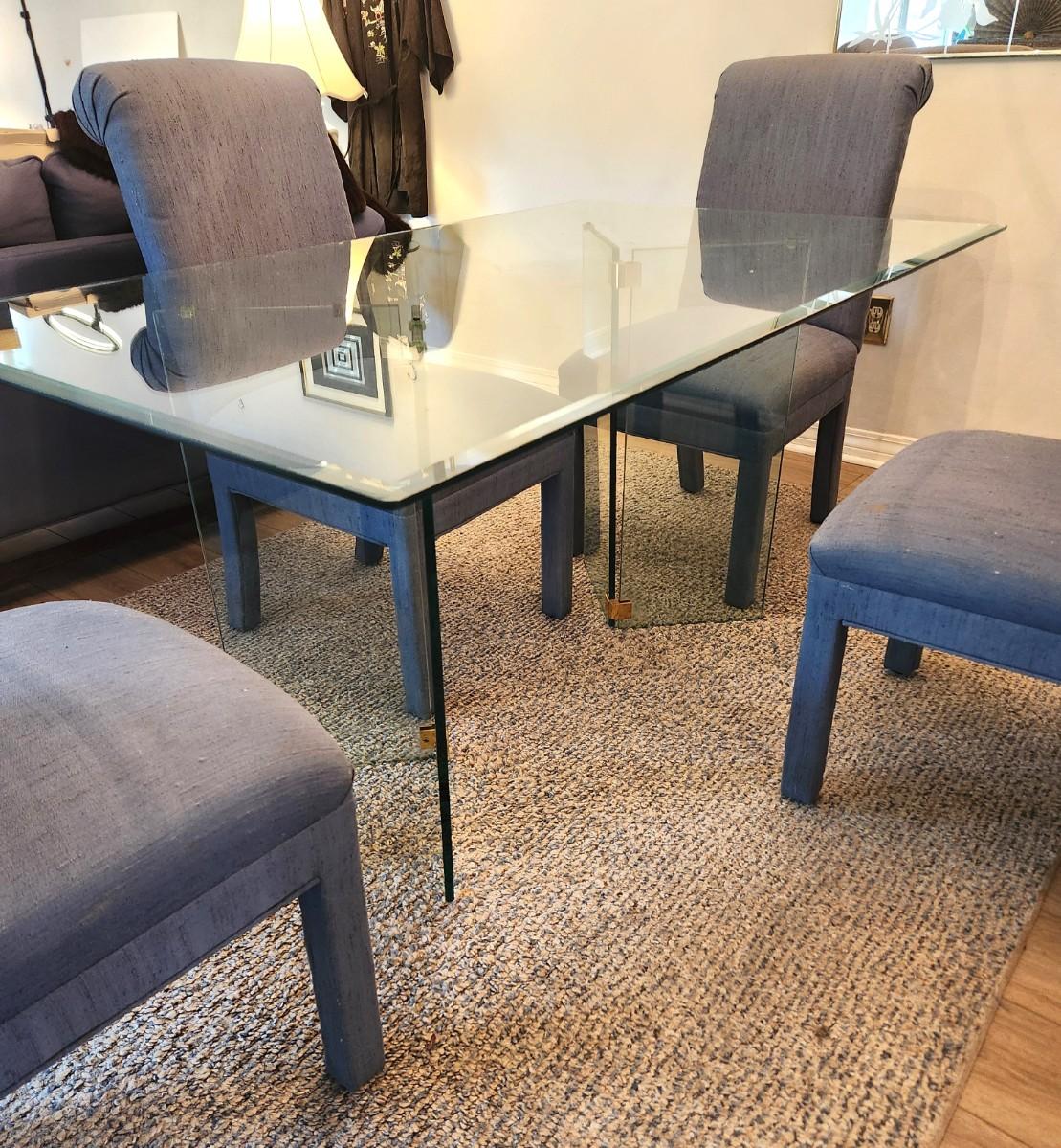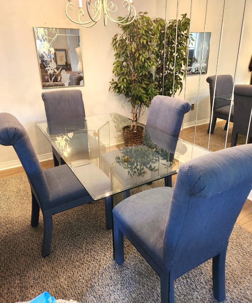 This glass dining room table is a beauty and would fit in well with today's decor. Tempered glass, beveled edge - great condition - comes apart for easy transport. No chips that I could see. You also get the 4 upholstered chairs. Chairs are 39" tall, 30" deep - minor stains, but chair covers are sold to fit these in almost any Home store. Table is 60" long, 36" wide, 29.5" tall. Anyone who purchases this must move it themselves, but as I noted, the table breaks down.